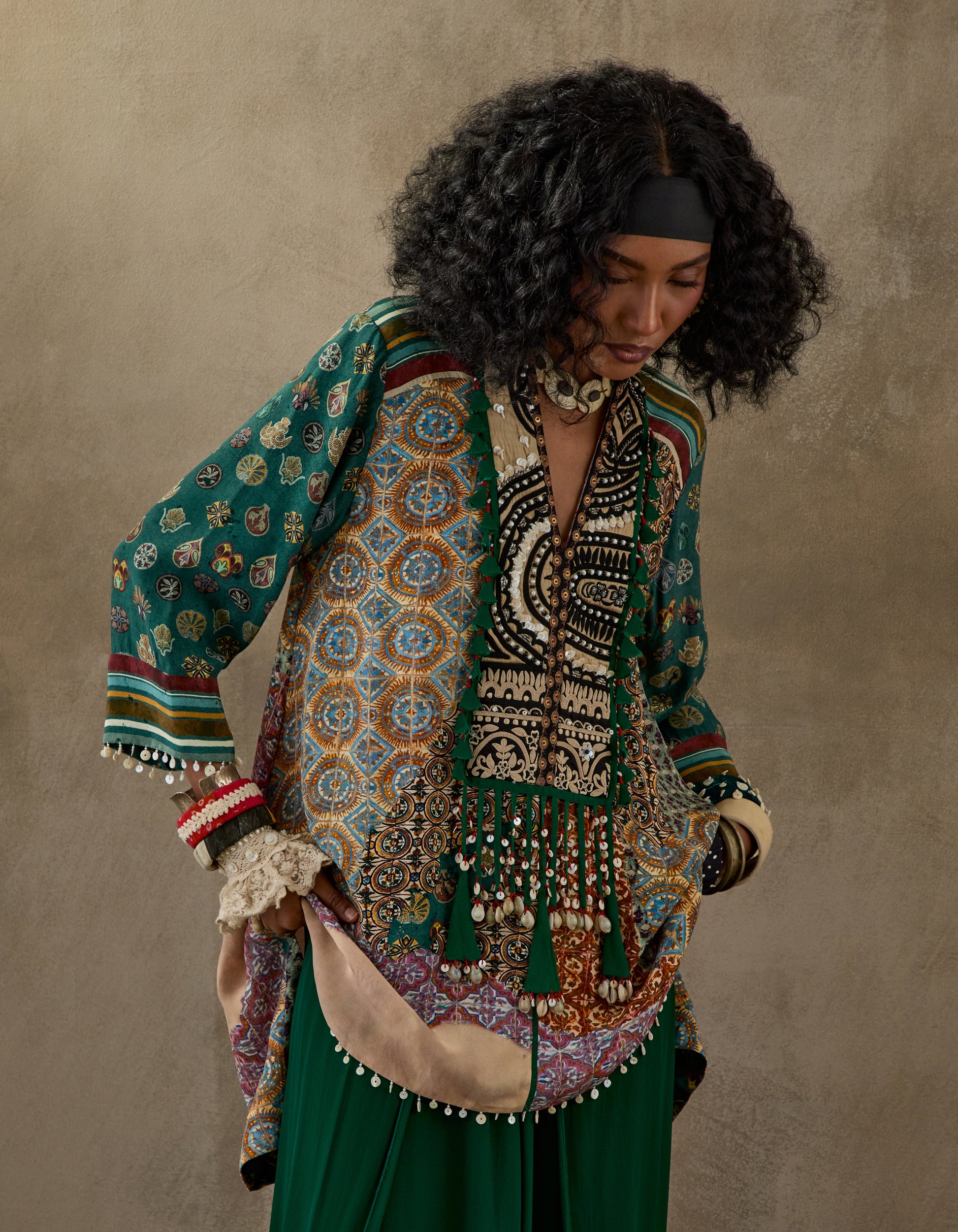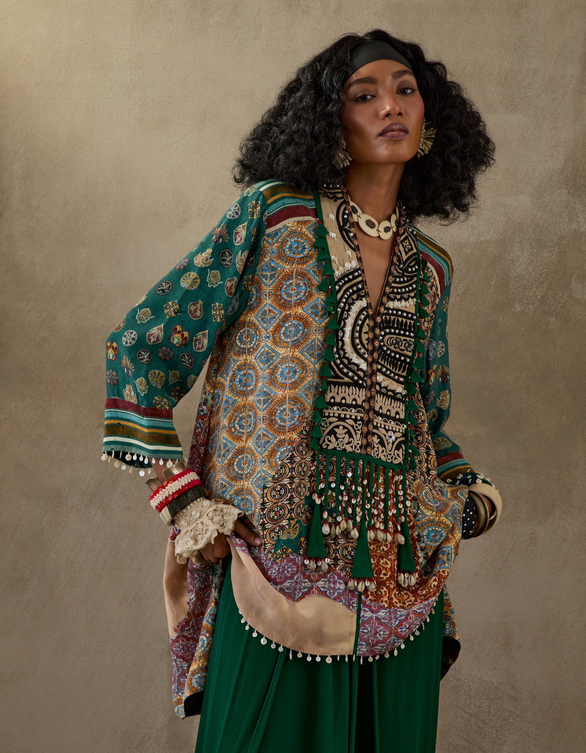 A printed and highlighted relaxed-fit short kurti with inserts, paired with printed draped trousers. Embellished with Resham thread embroidery, cowrie shells, M.O.P. bead accents, and tassel details, this ensemble offers a perfect blend of intricate craftsmanship and contemporary style. Designed with an easy-fit kurta and elasticated waist trousers for maximum comfort and effortless elegance.