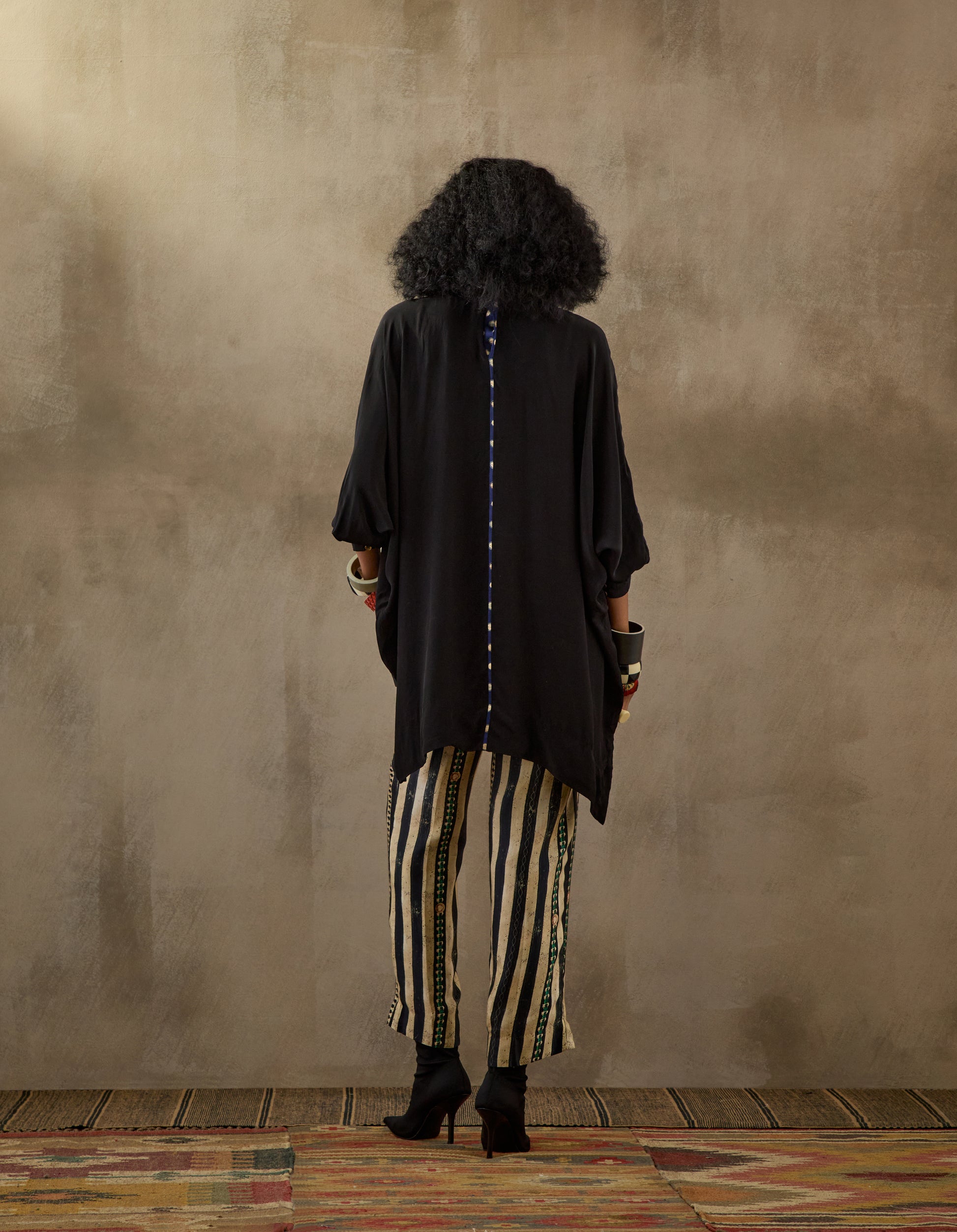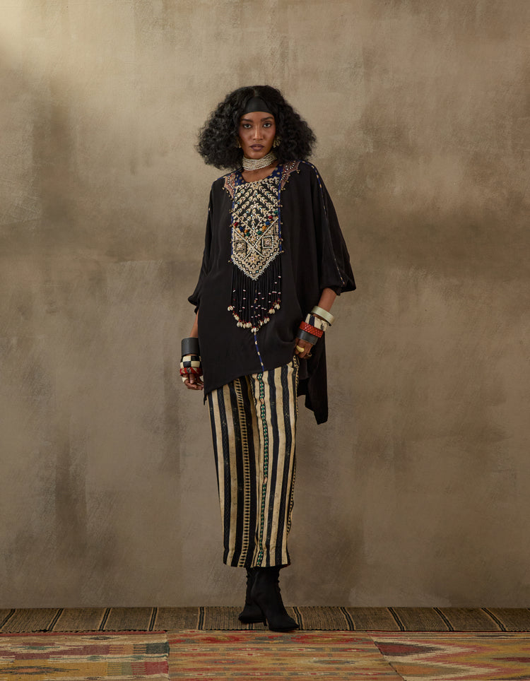 A printed and highlighted relaxed-fit short kurti with inserts, paired with printed straight trousers. Featuring intricate Resham thread embroidery, cowrie shells, M.O.P. bead accents, and tassel details, this ensemble combines artisanal elegance with contemporary comfort. Designed with an easy-fit kurta and elasticated waist trousers for effortless style.