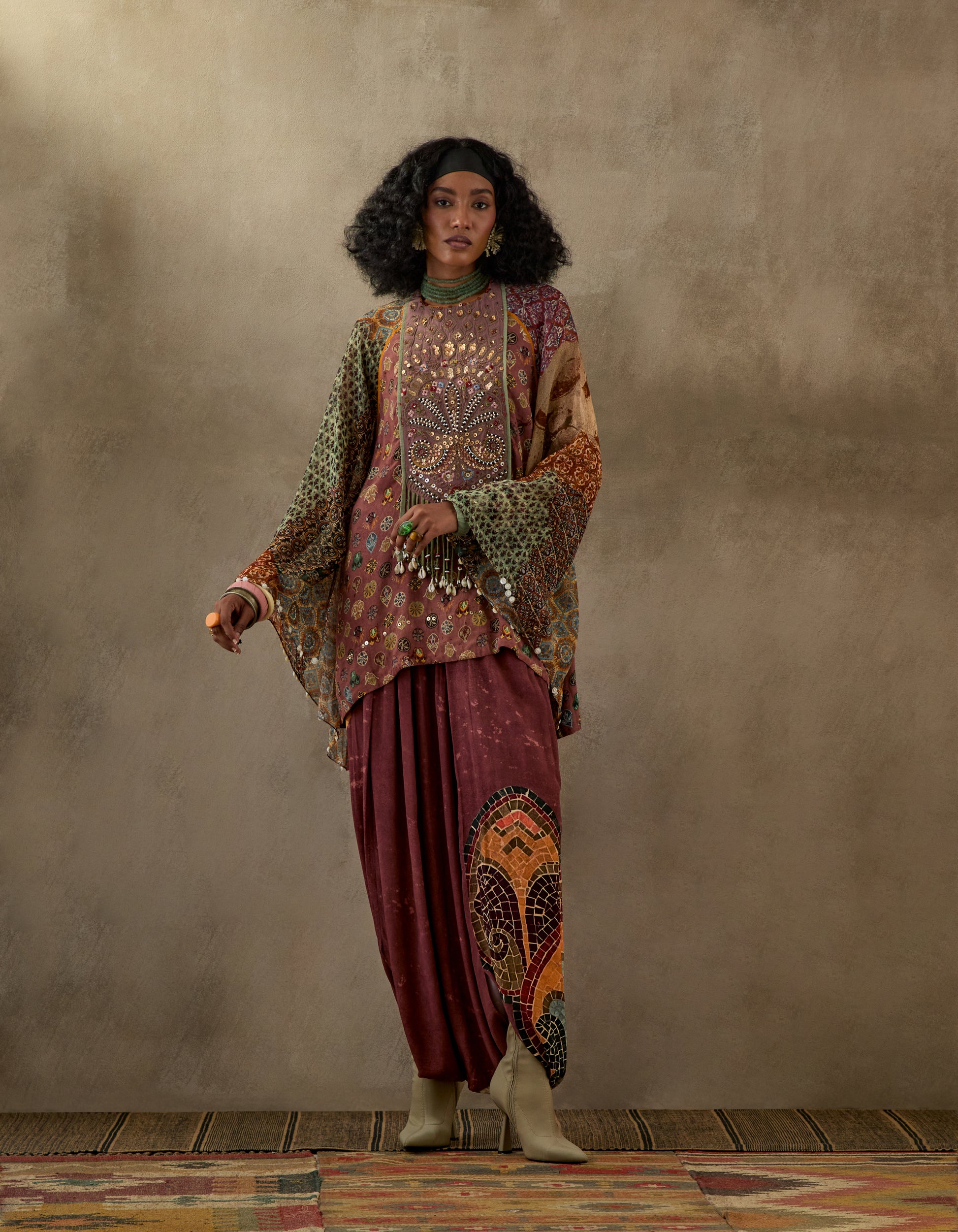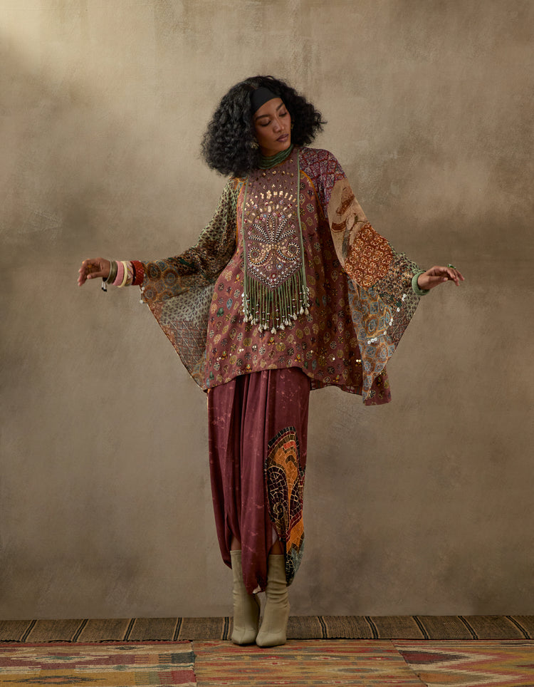 A printed kurta with cape sleeves and a tasseled yoke, paired with printed draped trousers. Adorned with Resham thread embroidery, cowrie shells, M.O.P. bead accents, and tassel details, this ensemble combines intricate craftsmanship with effortless style. The easy-fit kurta and elasticated waist trousers ensure both comfort and elegance.