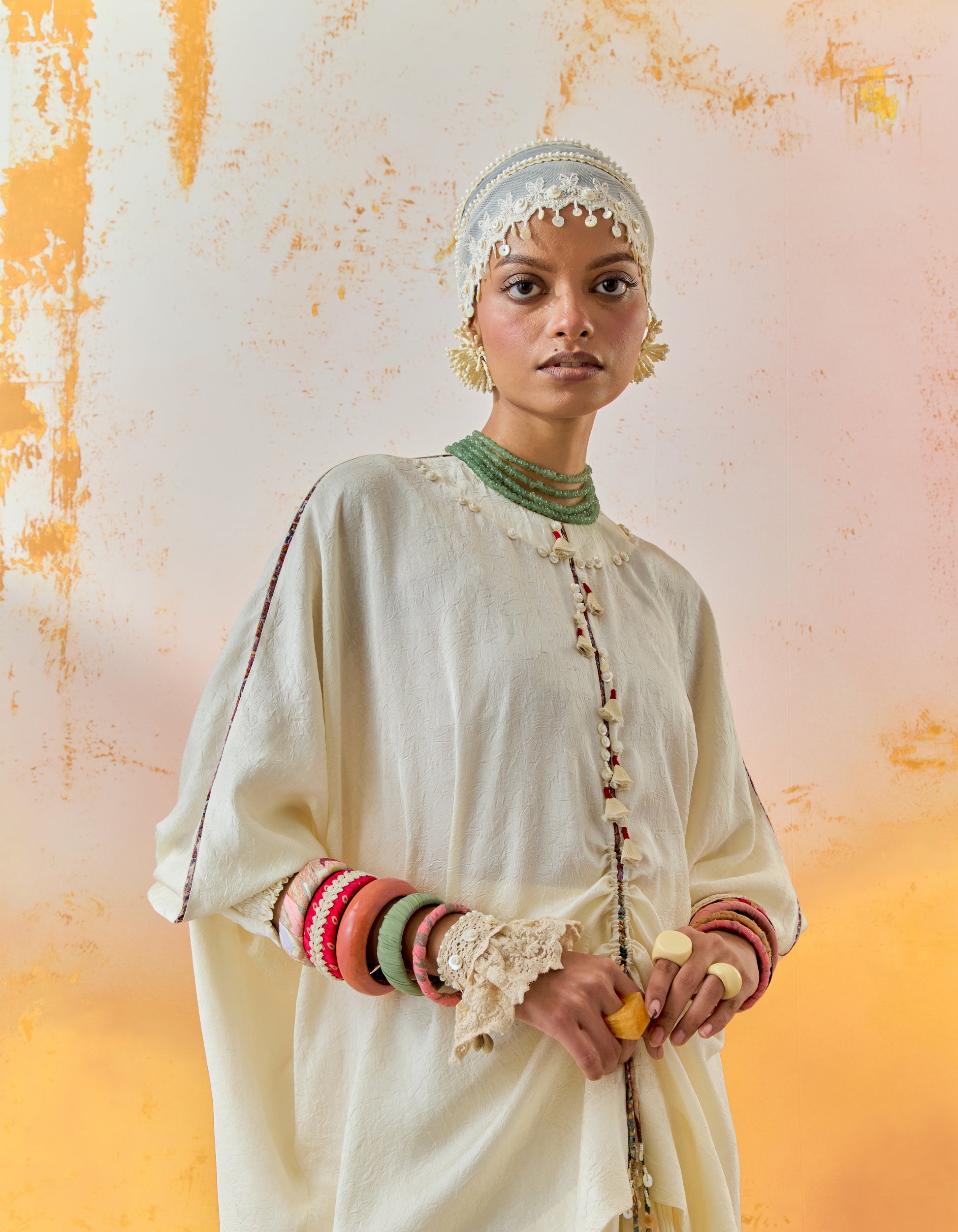 A textured solid-coloured short trapeze kurti with inserts, designed in a relaxed, anti-fit silhouette, paired with a textured solid-coloured pleated skirt in a comfortable relaxed fit. Accentuated with tribal tassel details, this ensemble offers a perfect blend of modern ease and artisanal charm.