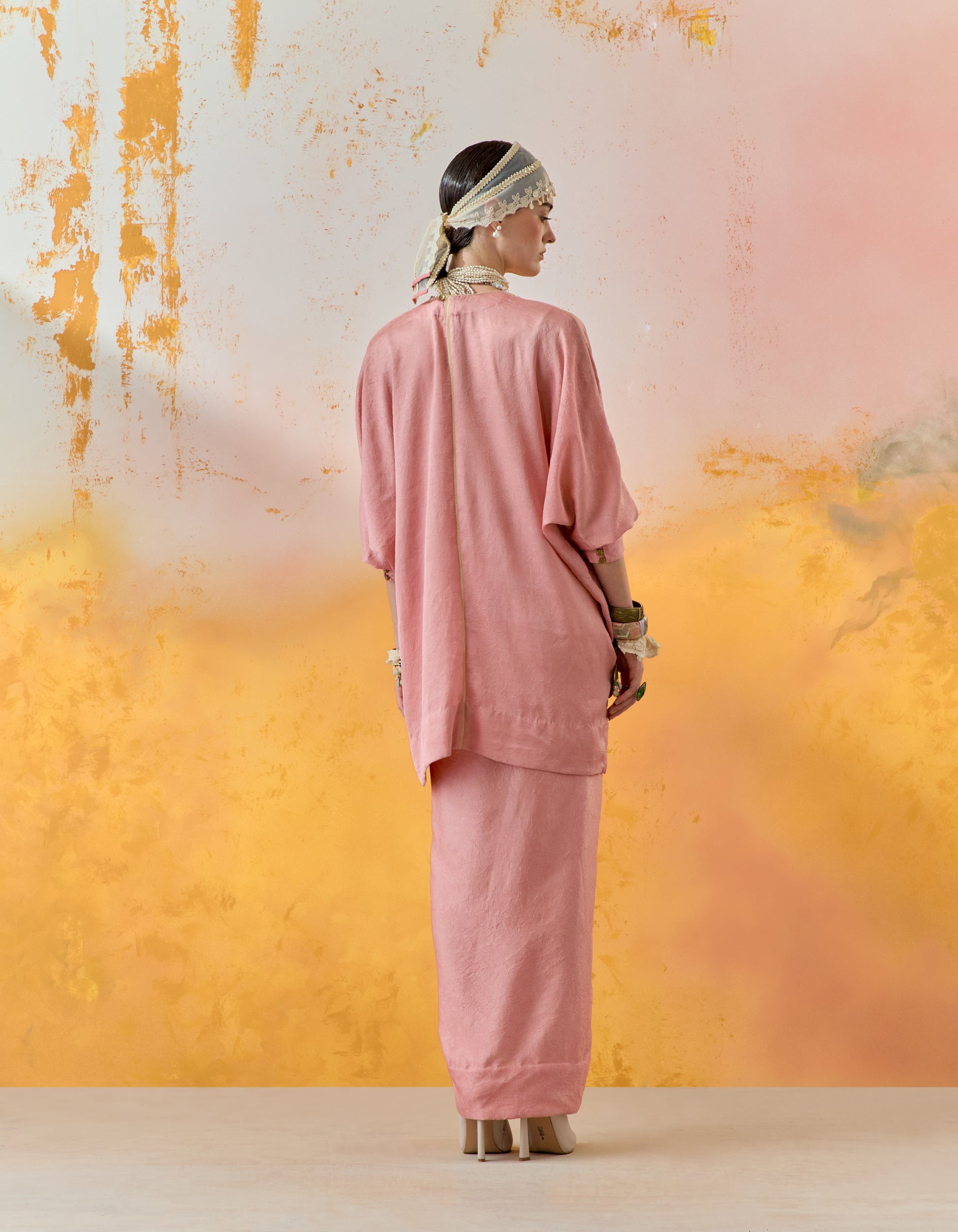 A textured solid-coloured short trapeze kurti with inserts, designed in a relaxed, anti-fit silhouette, paired with a textured solid-coloured pleated skirt in a comfortable relaxed fit. Accentuated with tribal tassel details, this ensemble offers a perfect blend of modern ease and artisanal charm.