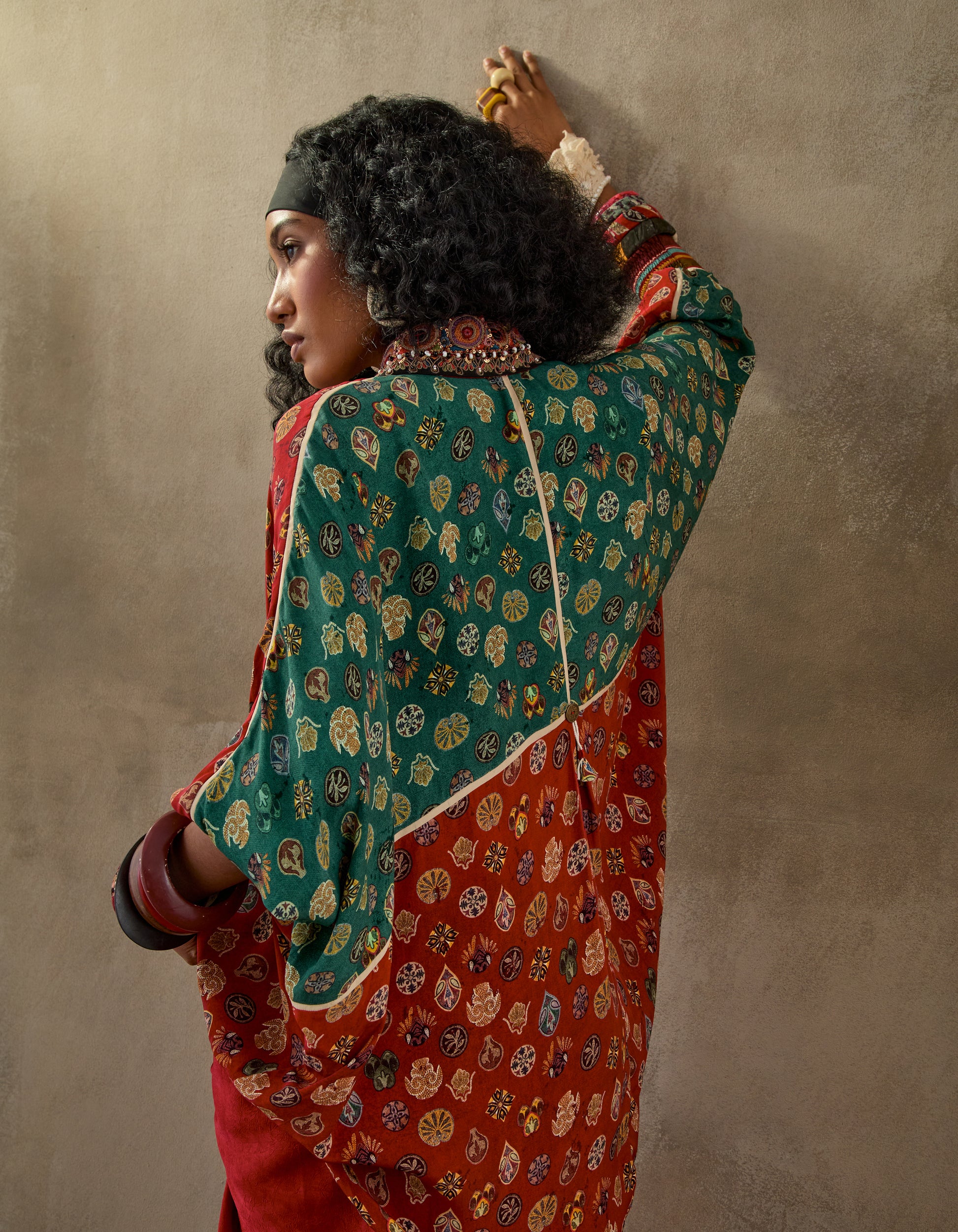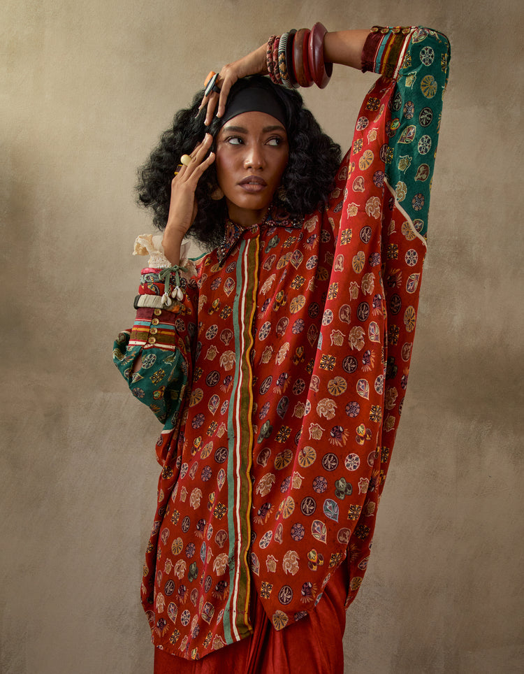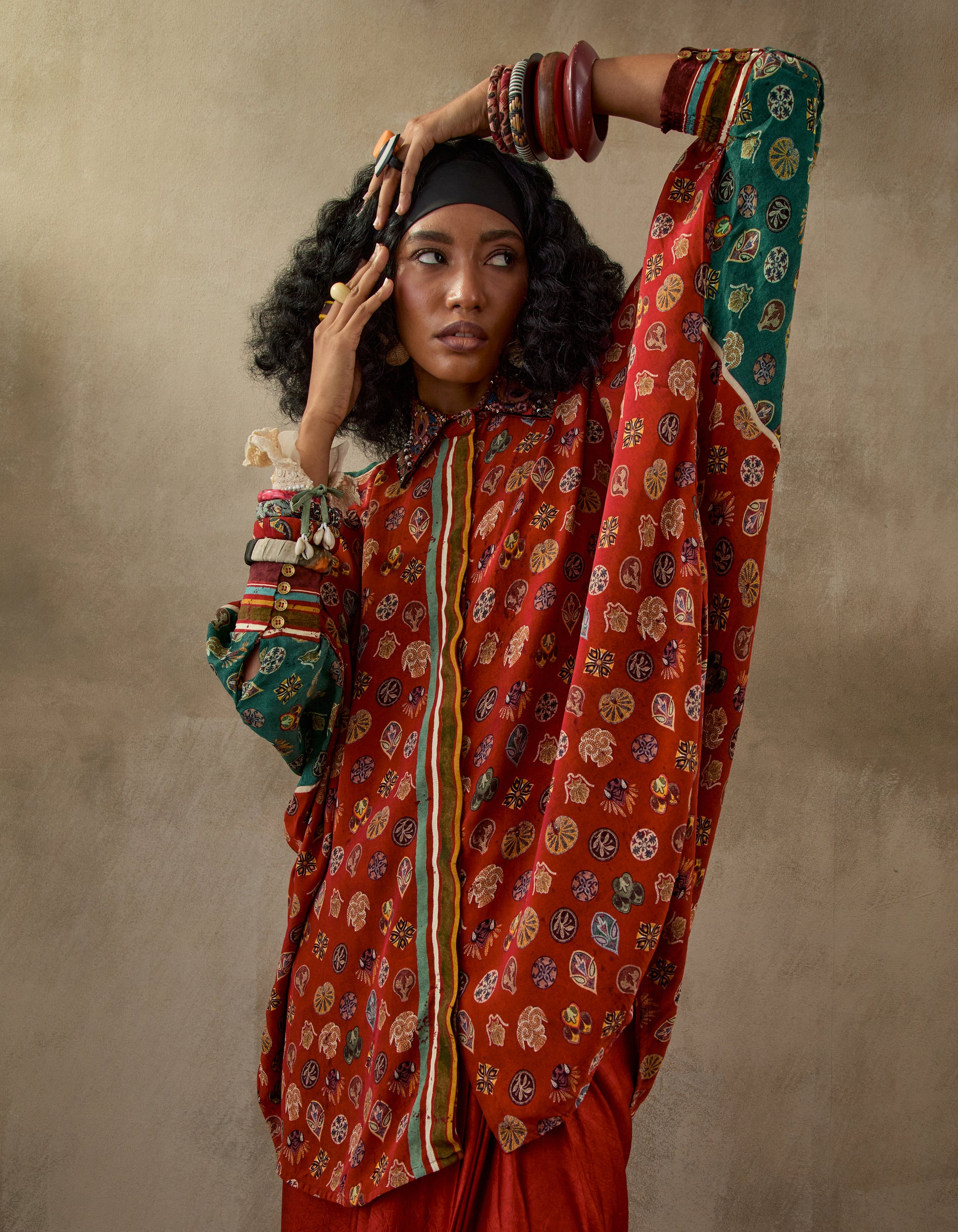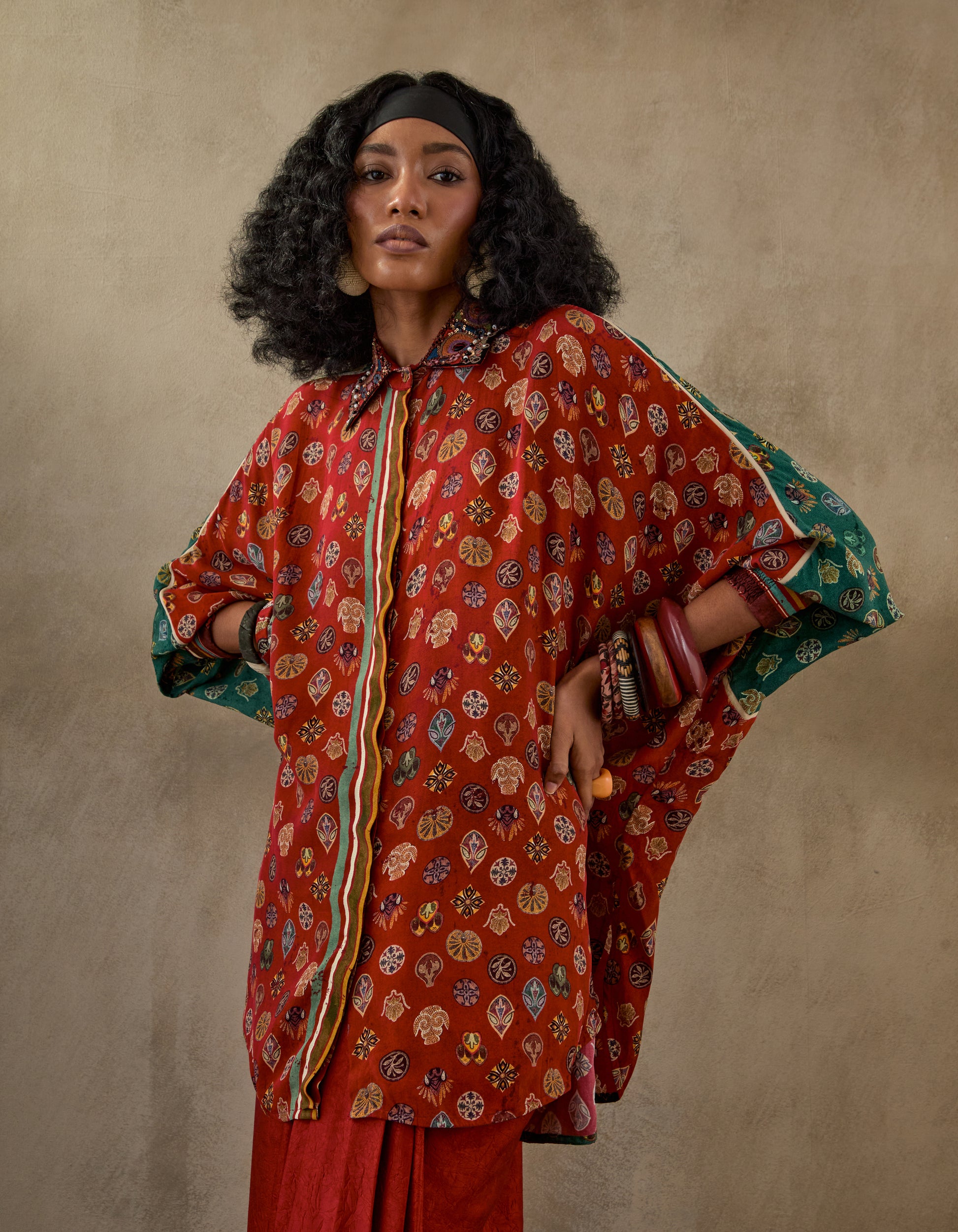 A trapeze printed shirt with inserts and an embroidered collar, designed without armholes for a sleek, modern look. This easy-fit style is designed to comfortably suit all sizes, offering both elegance and versatility.