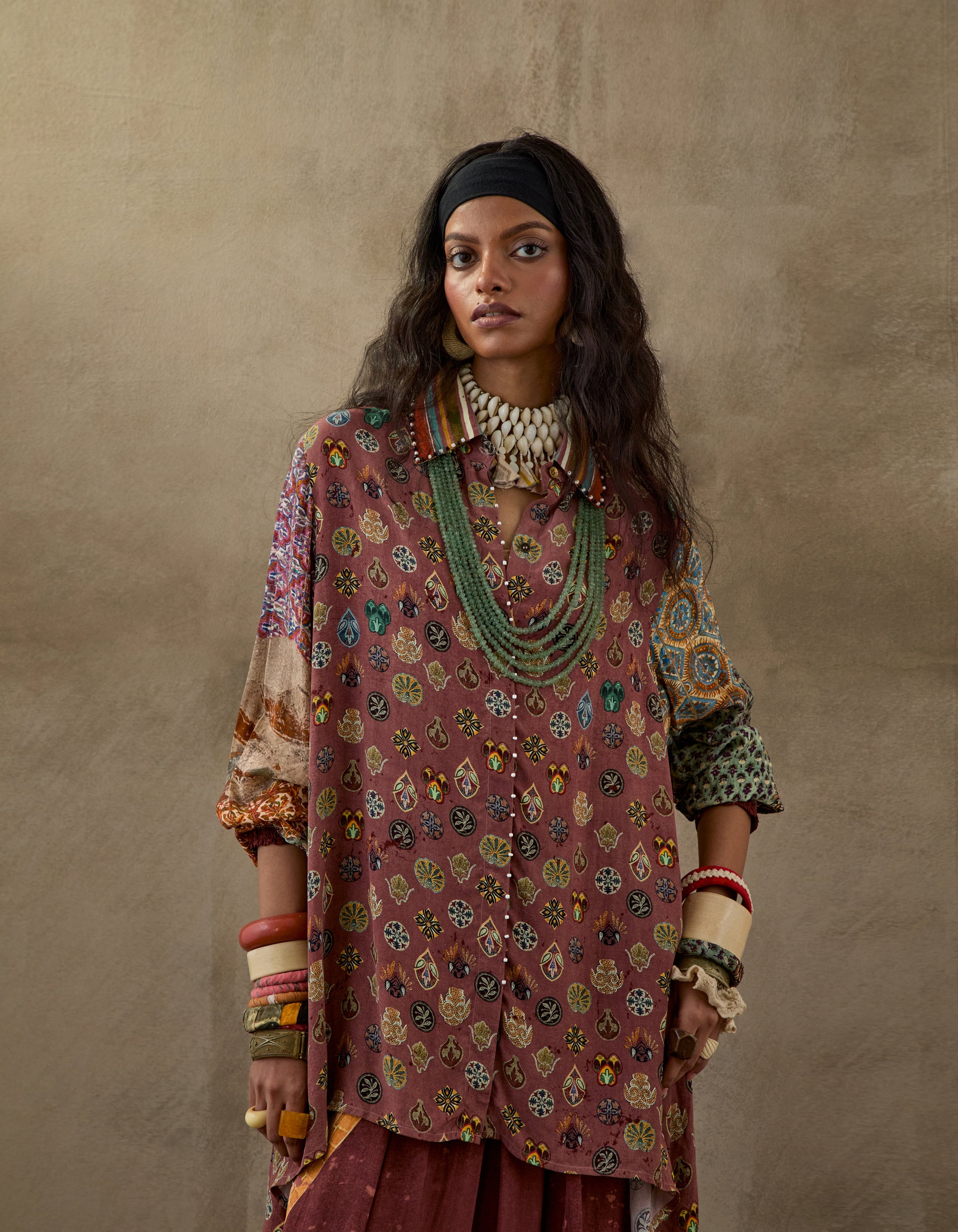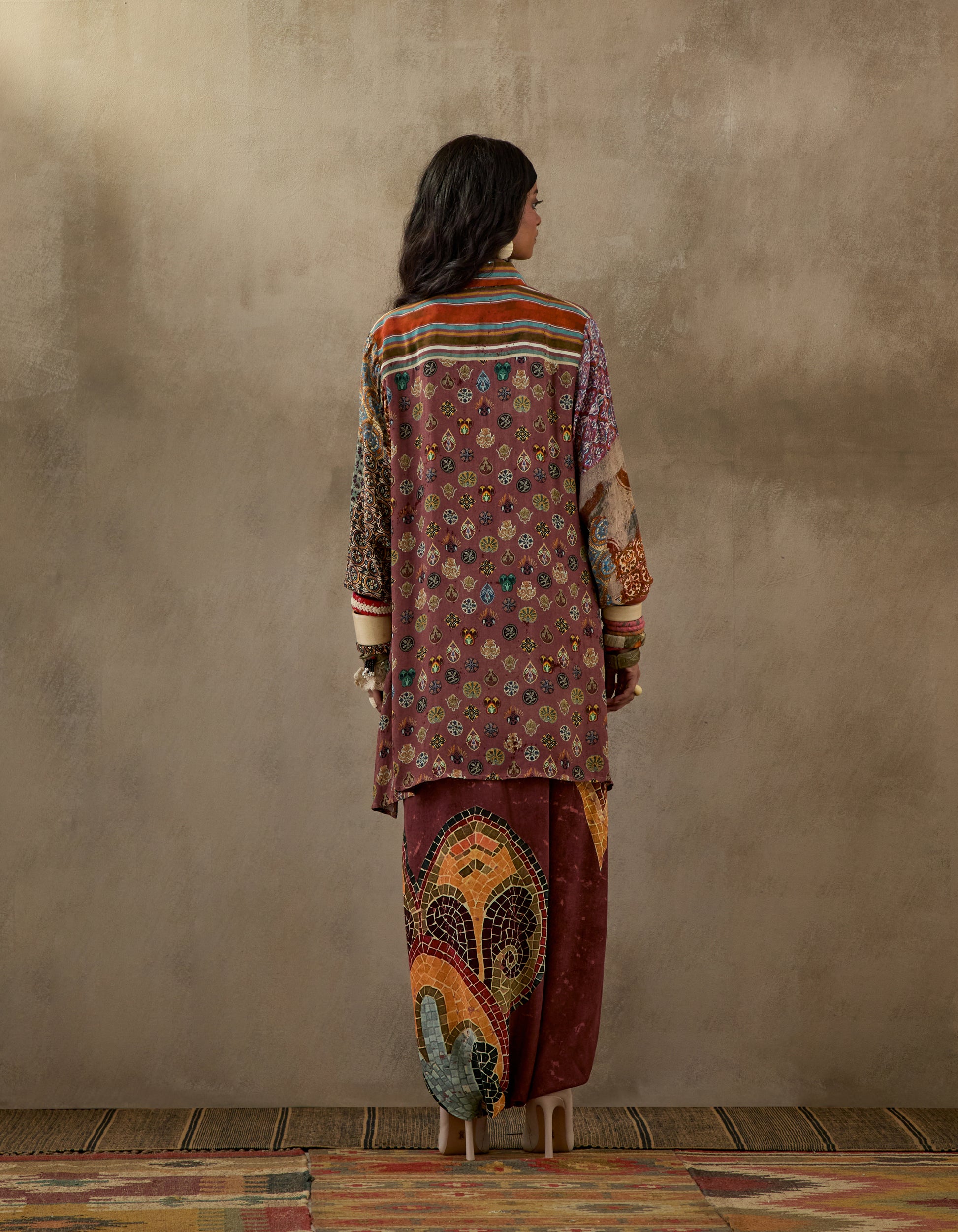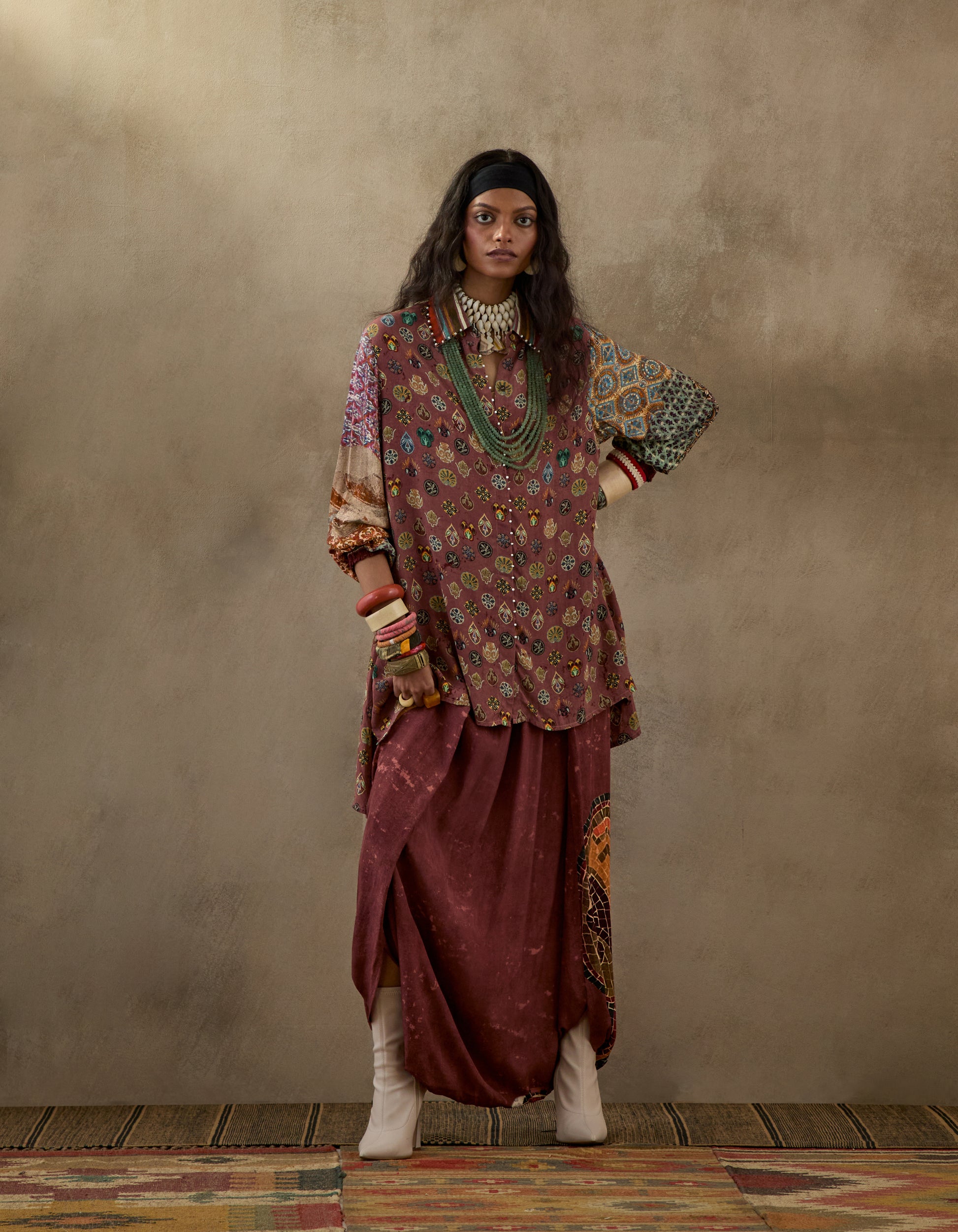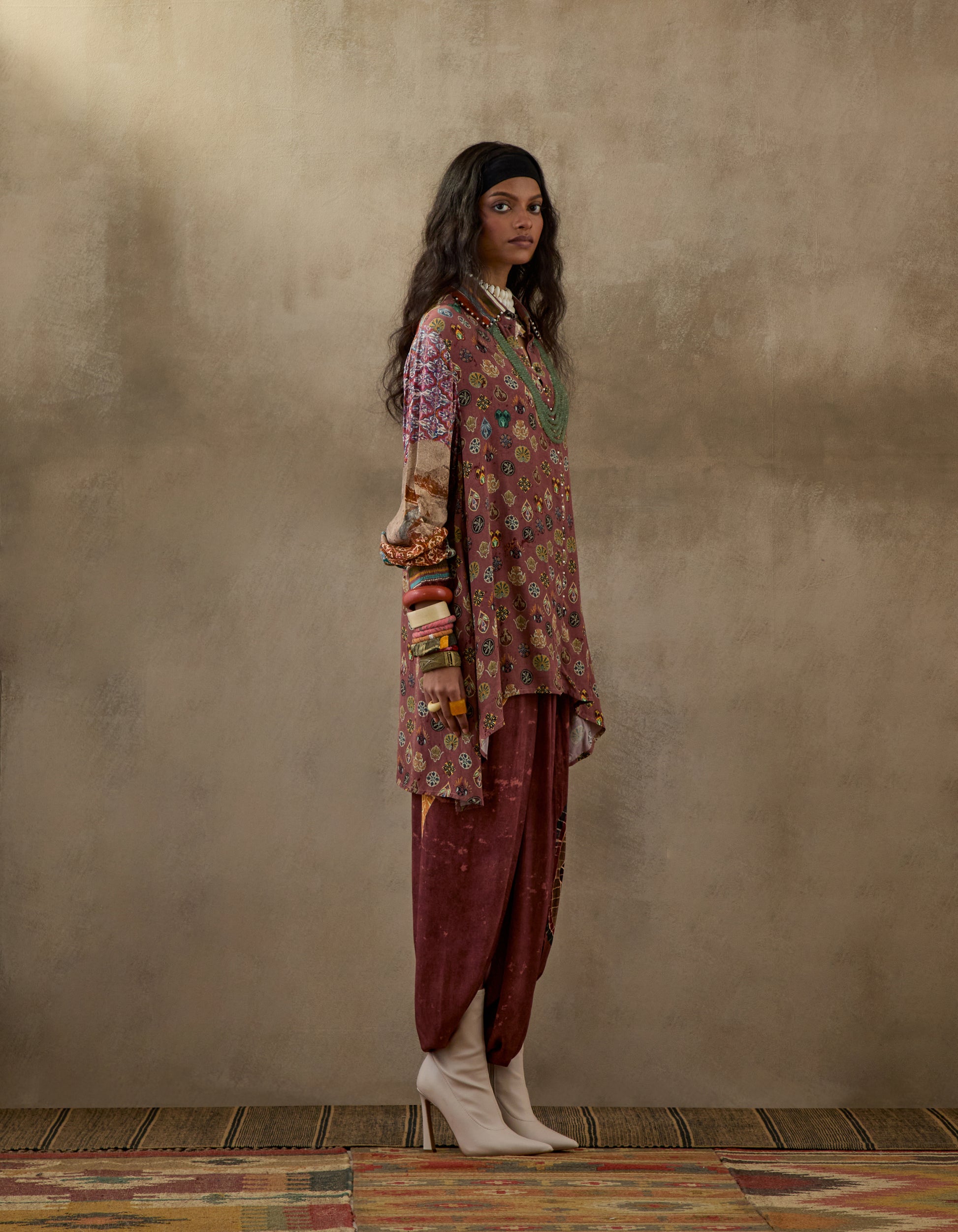 A textured print straight shirt featuring a printed collar, raglan sleeves, and delicate beadwork, paired with draped printed trousers. This ensemble seamlessly combines modern design with intricate detailing for a sophisticated yet contemporary look.