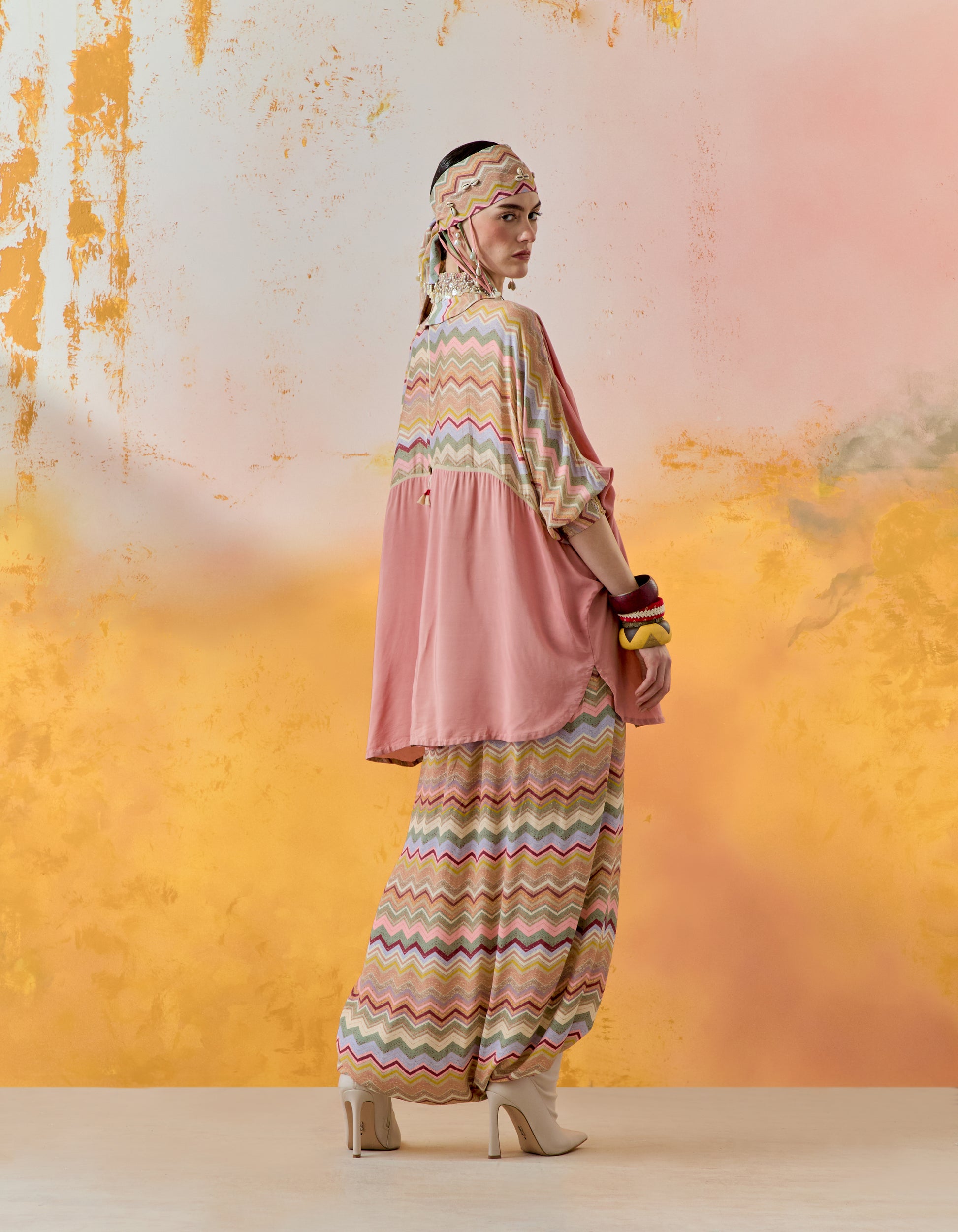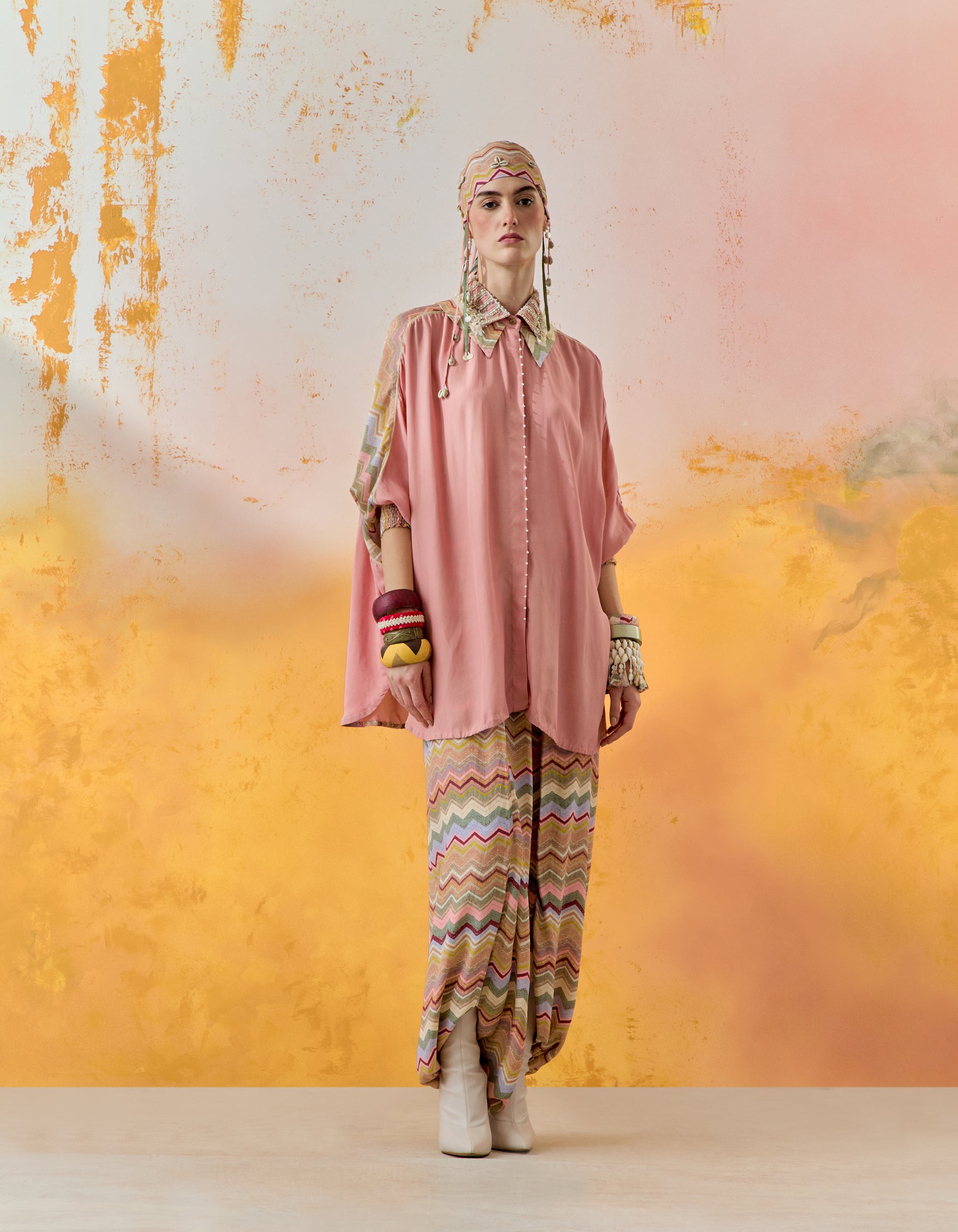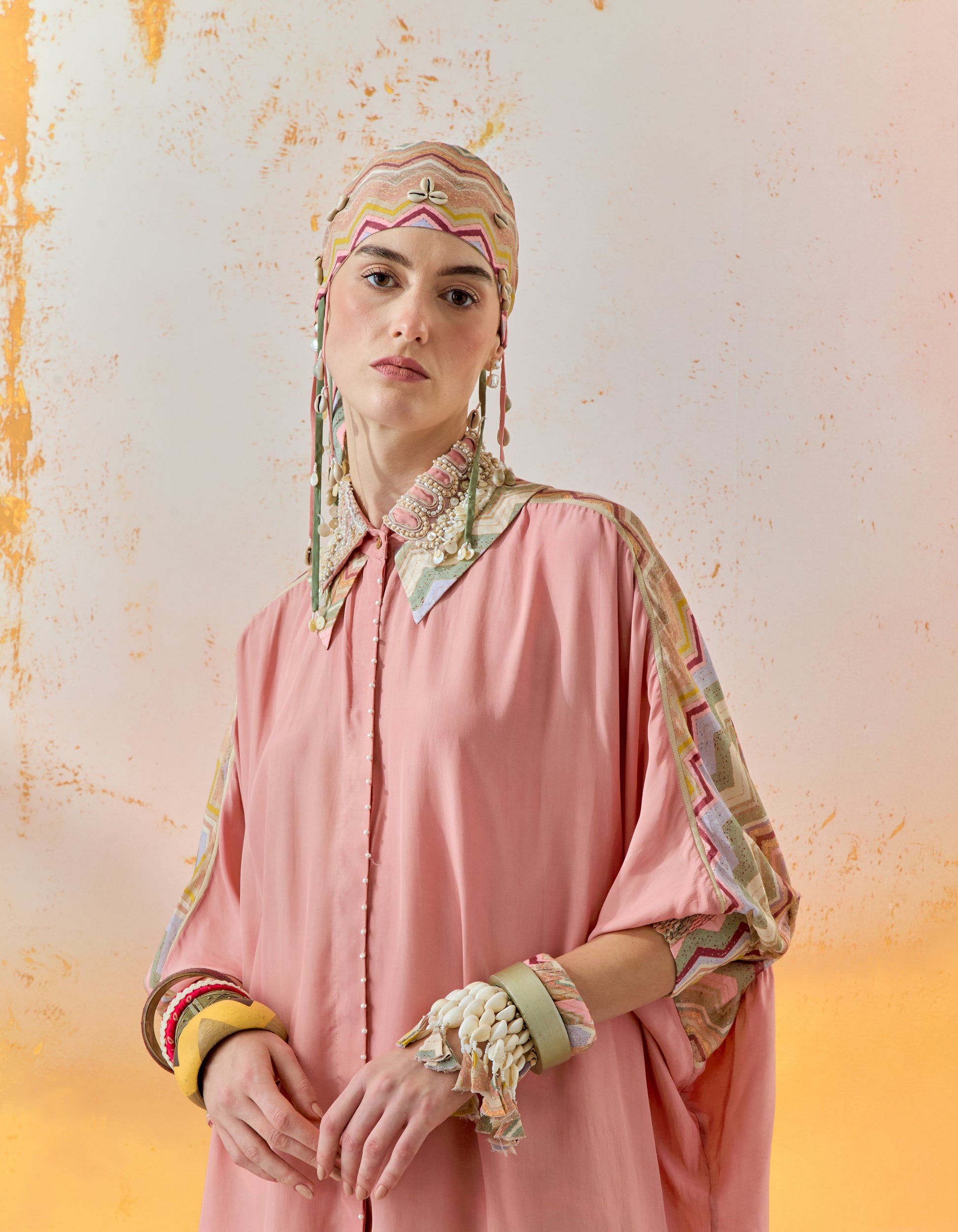 A trapeze solid-colored shirt with inserts and an embroidered collar. The collar is enhanced with intricate lace detailing. The design features no armholes, offering a breezy, relaxed silhouette. This piece is an easy fit, suitable for all sizes. Its timeless appeal combines comfort with understated elegance.