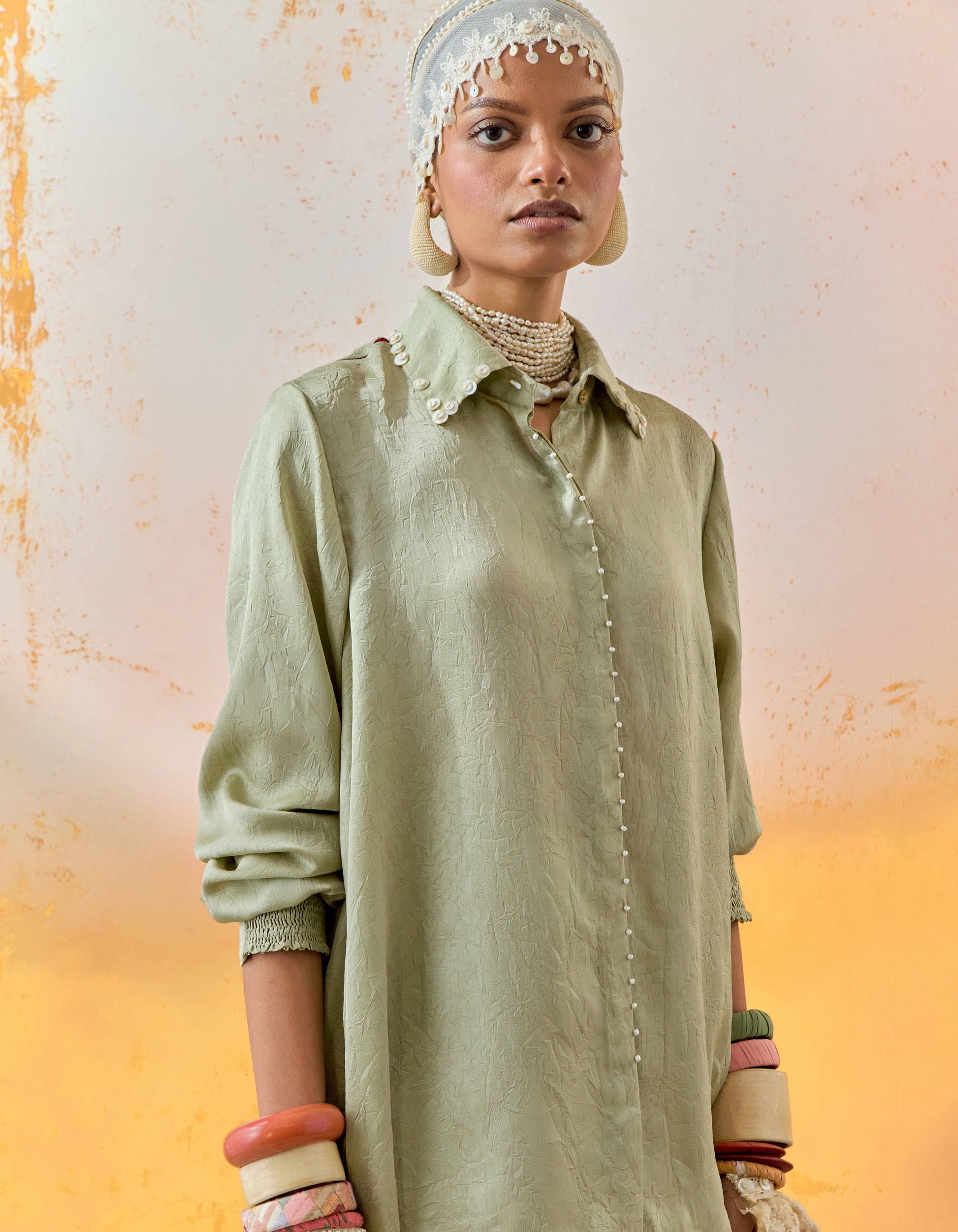 Textured solid straight shirt with beaded collar and raglan sleeve.
