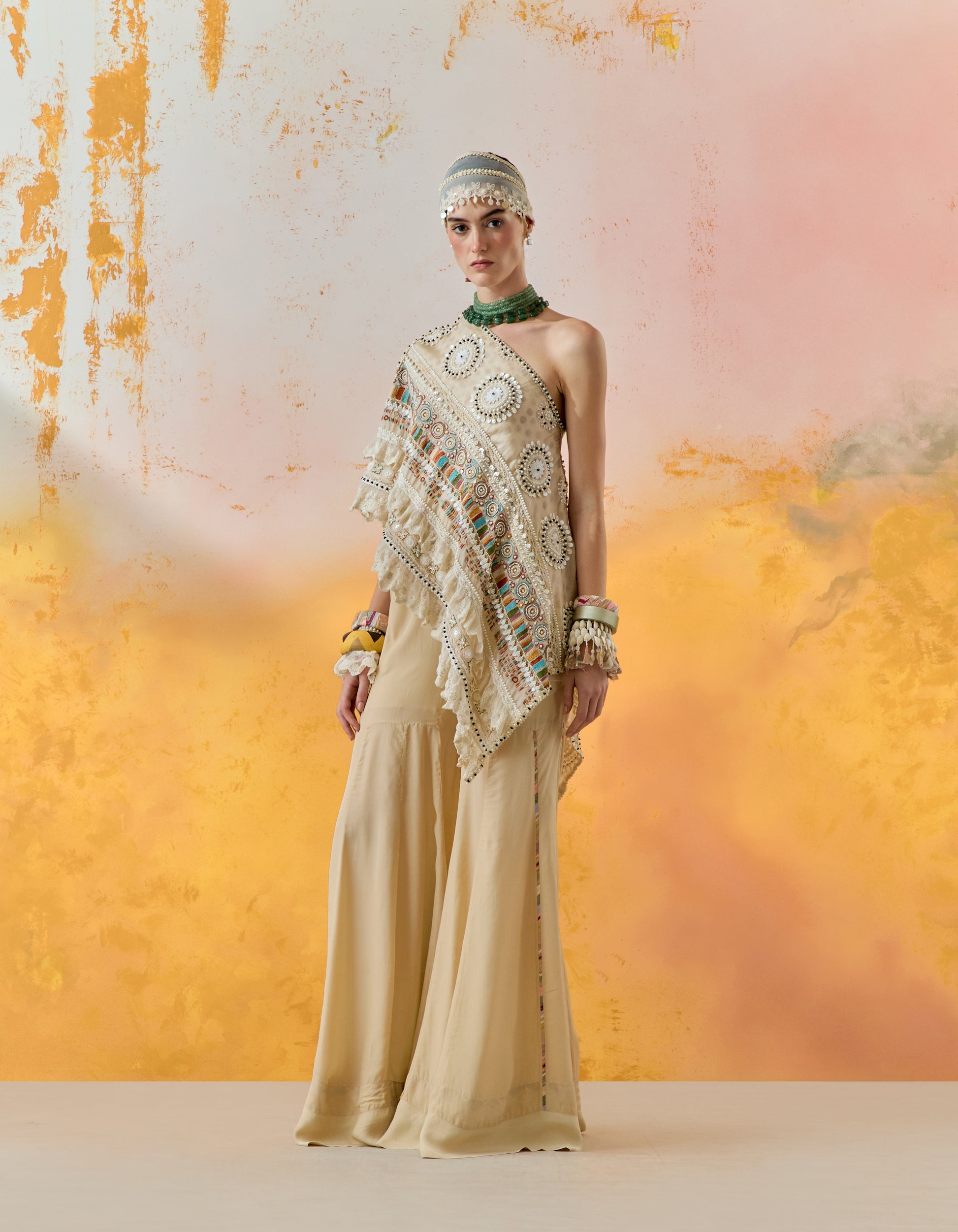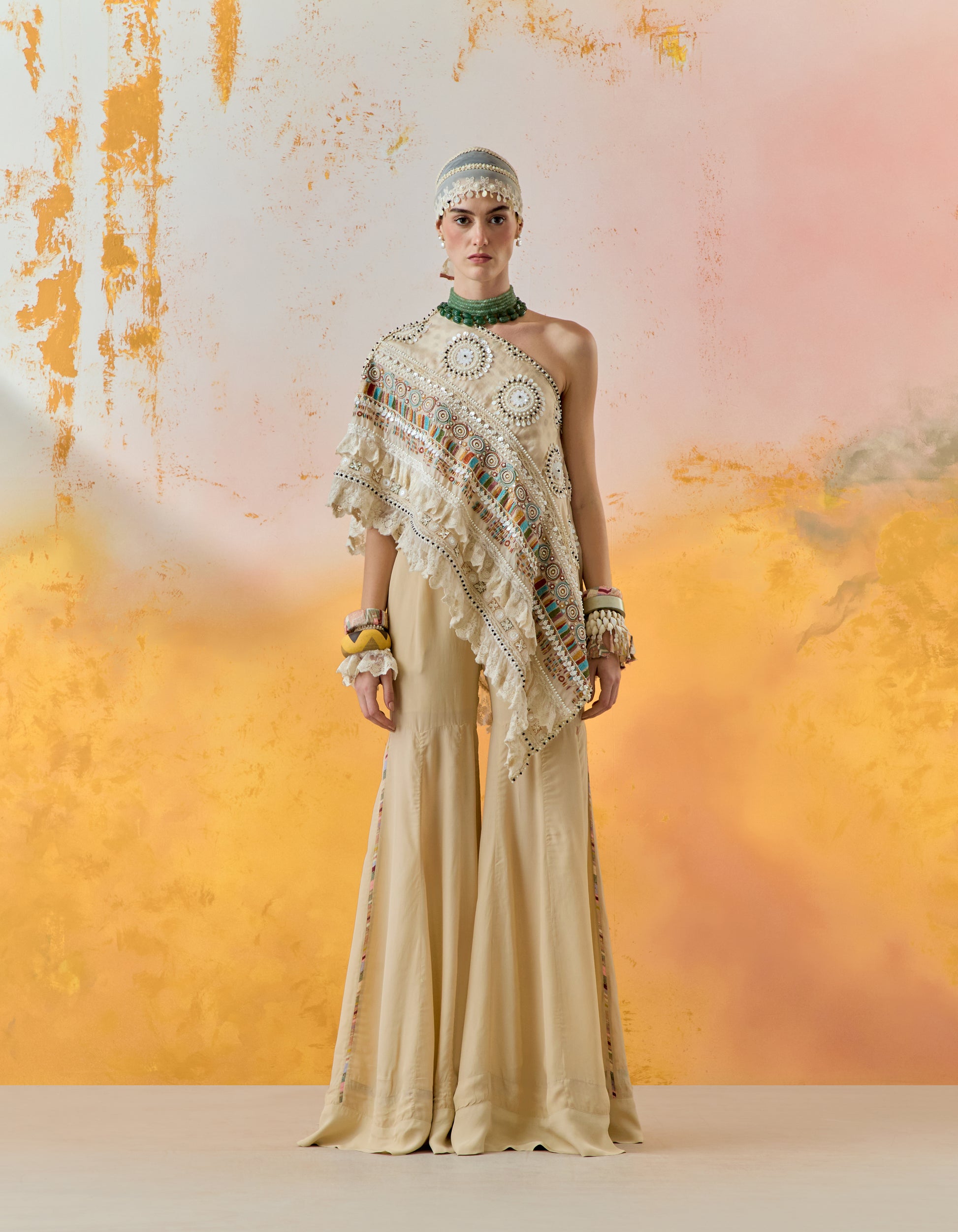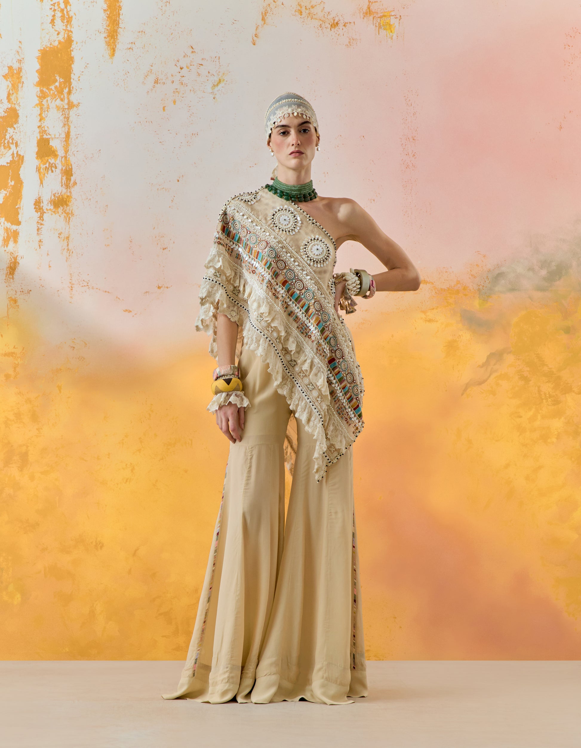 One-shoulder heavily laced and embroidered top paired with solid-coloUred sharara trousers. Features intricate Resham thread embroidery, cowri shells, M.O.P. bead, and tassel detailing. Easy-fit top styled with elasticated waist trousers for added comfort and elegance.