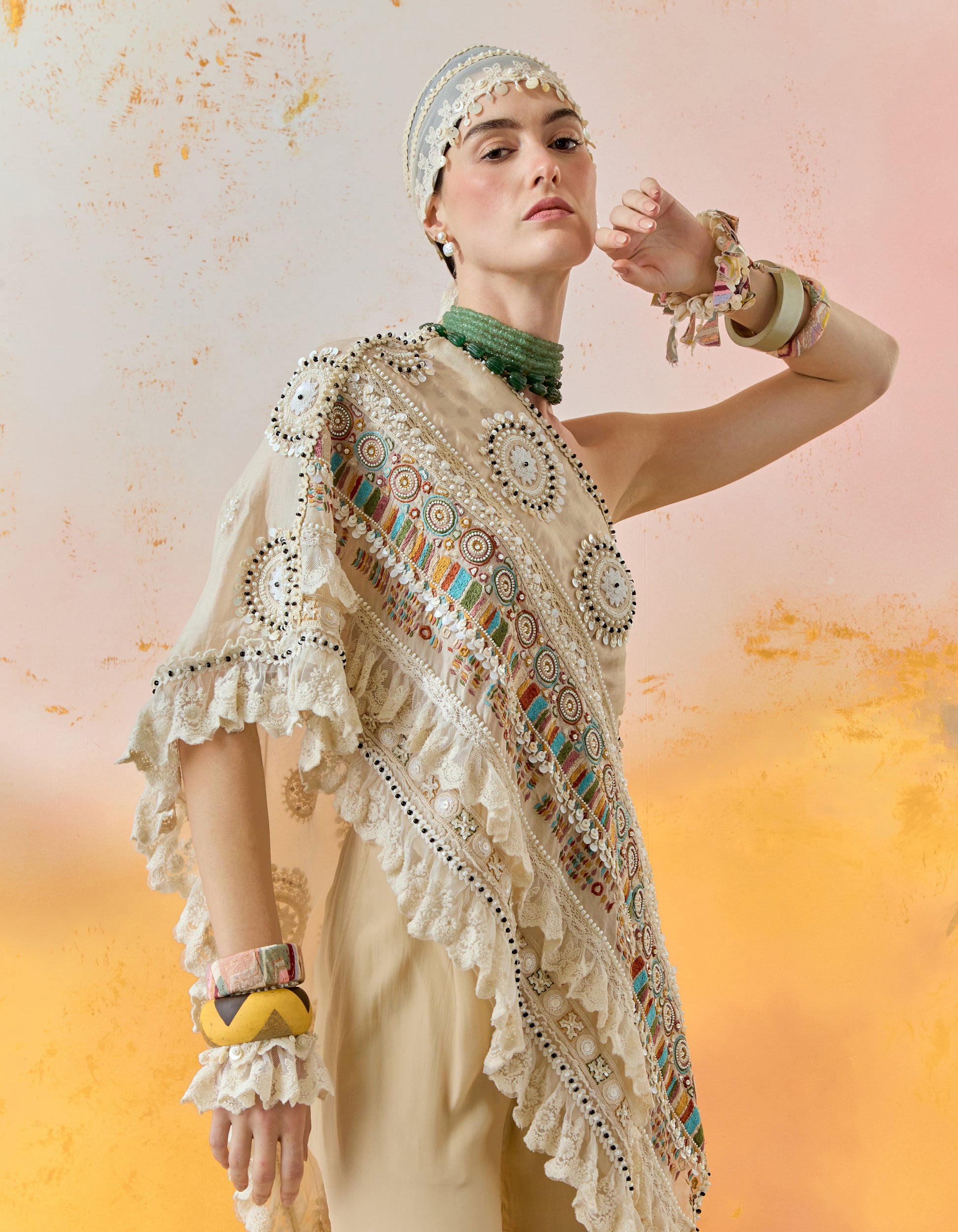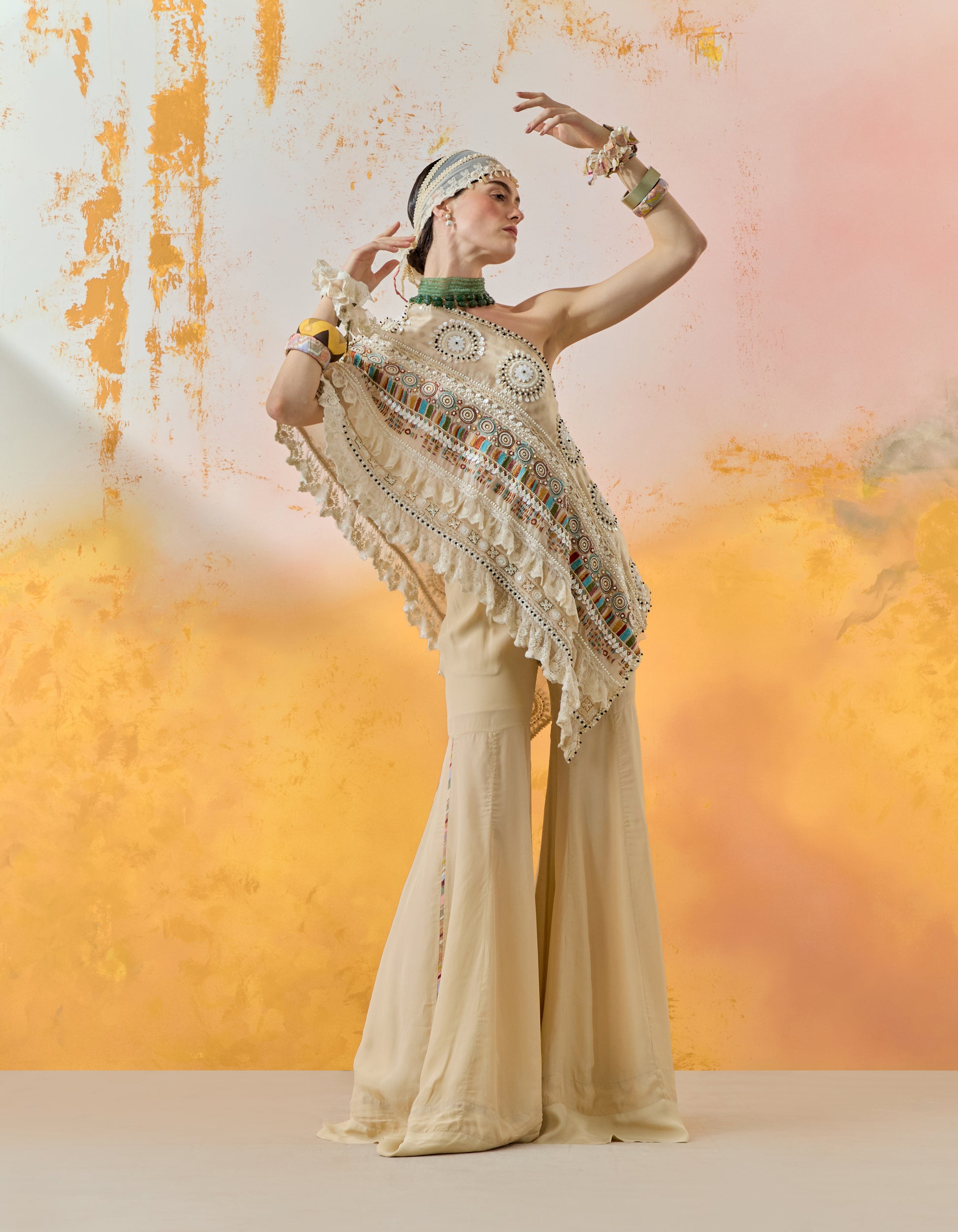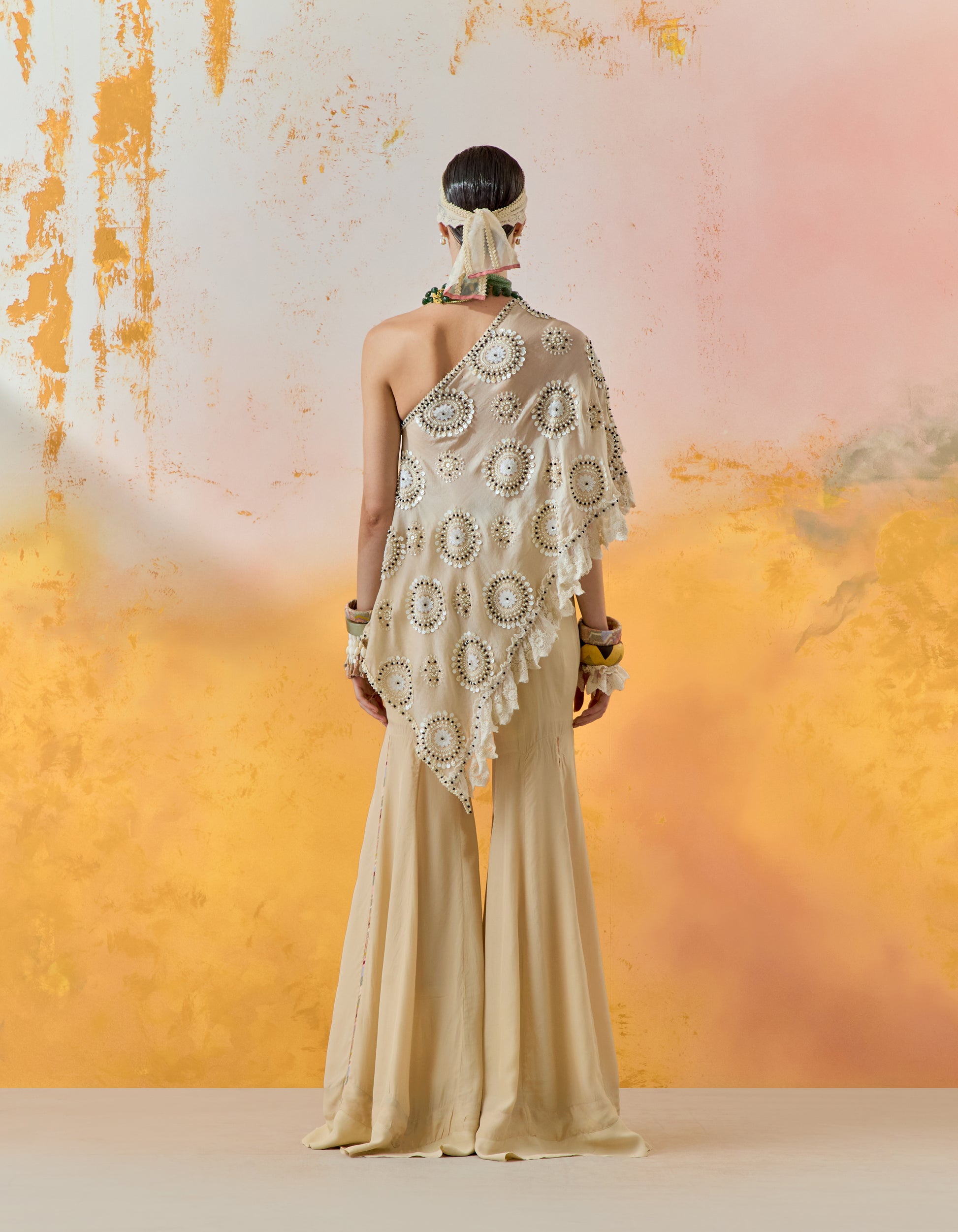 One-shoulder heavily laced and embroidered top paired with solid-coloUred sharara trousers. Features intricate Resham thread embroidery, cowri shells, M.O.P. bead, and tassel detailing. Easy-fit top styled with elasticated waist trousers for added comfort and elegance.