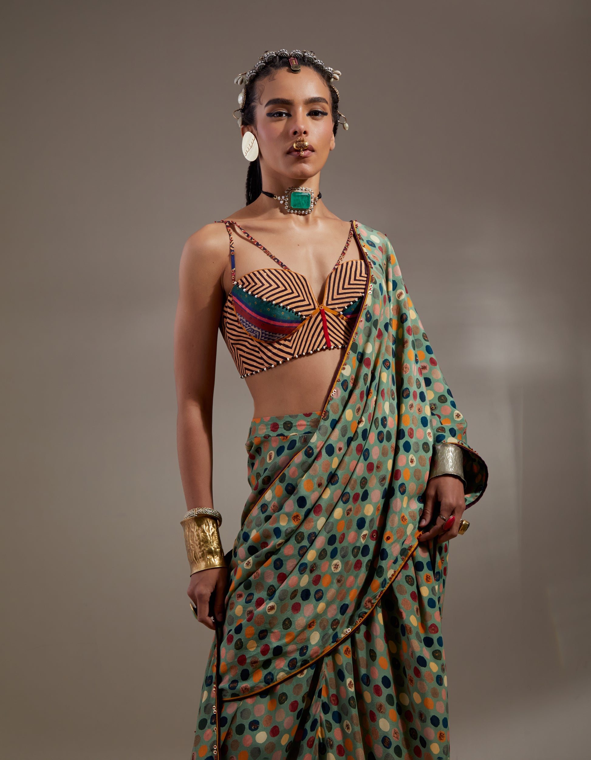 Geometrical pattern blouse. Printed draped concept saree with waistband