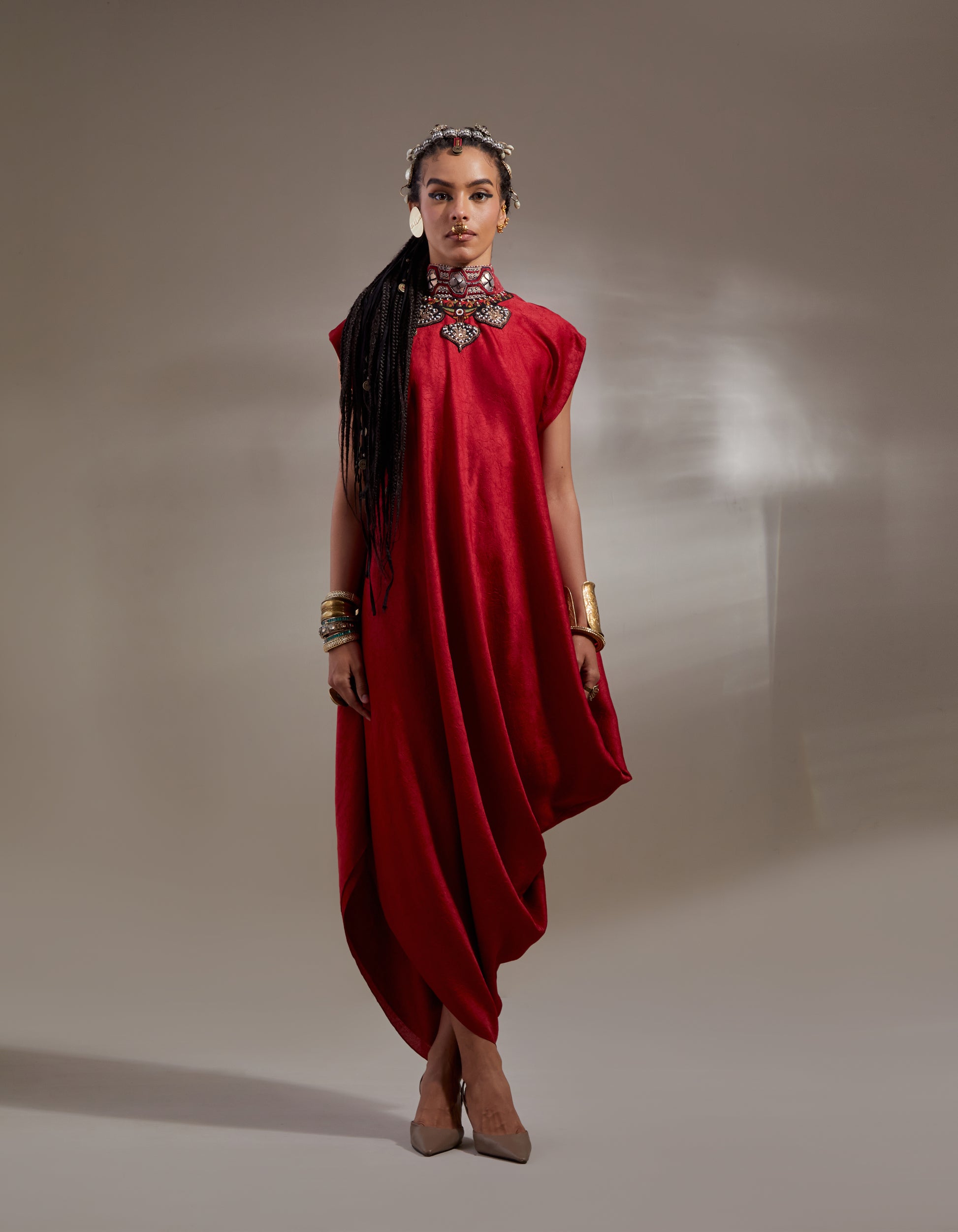 Solid textured drop shoulder drape dress with embroidered detailing at neck with back tie up