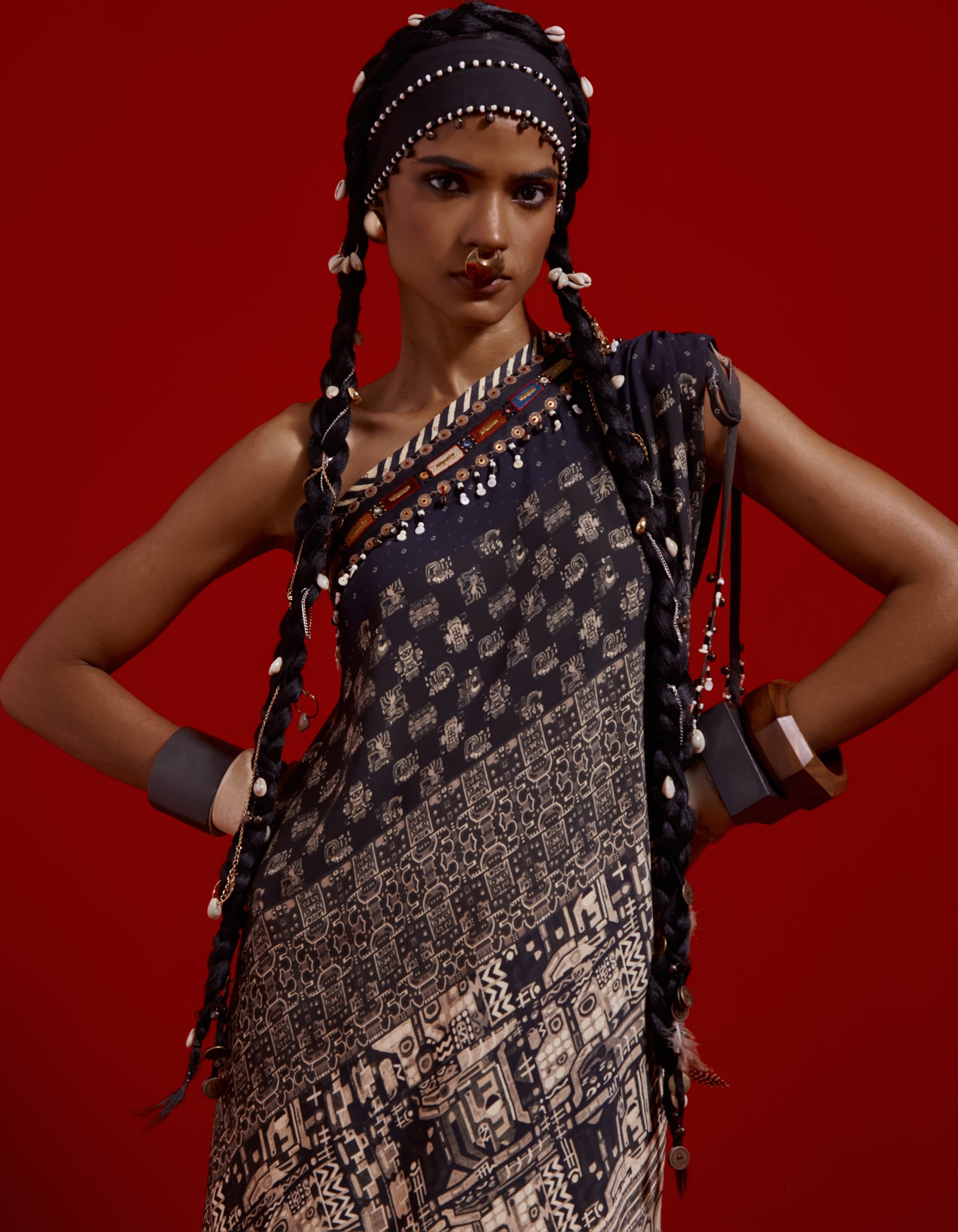 Printed one shoulder drape dress with embroidered detailing at yoke.