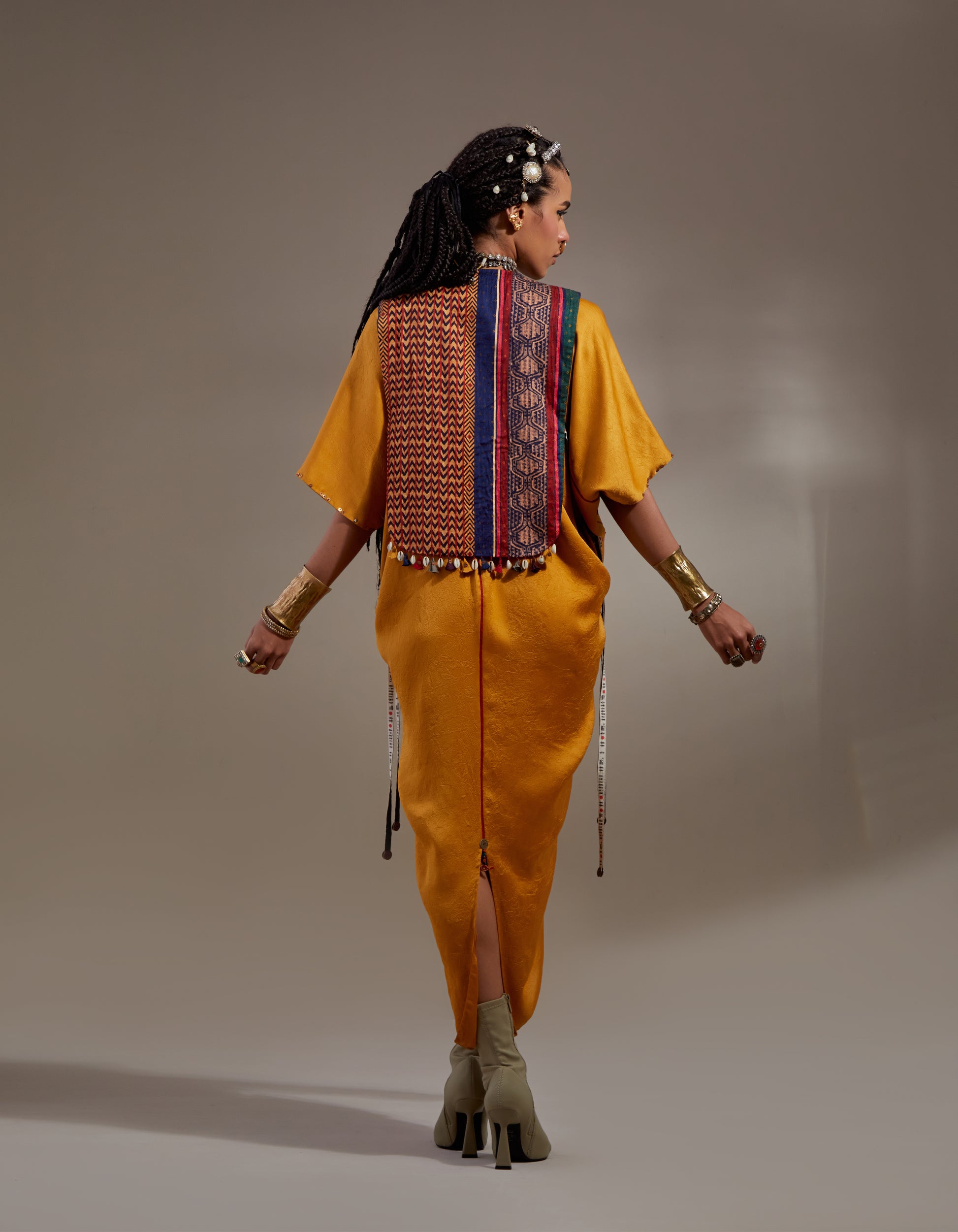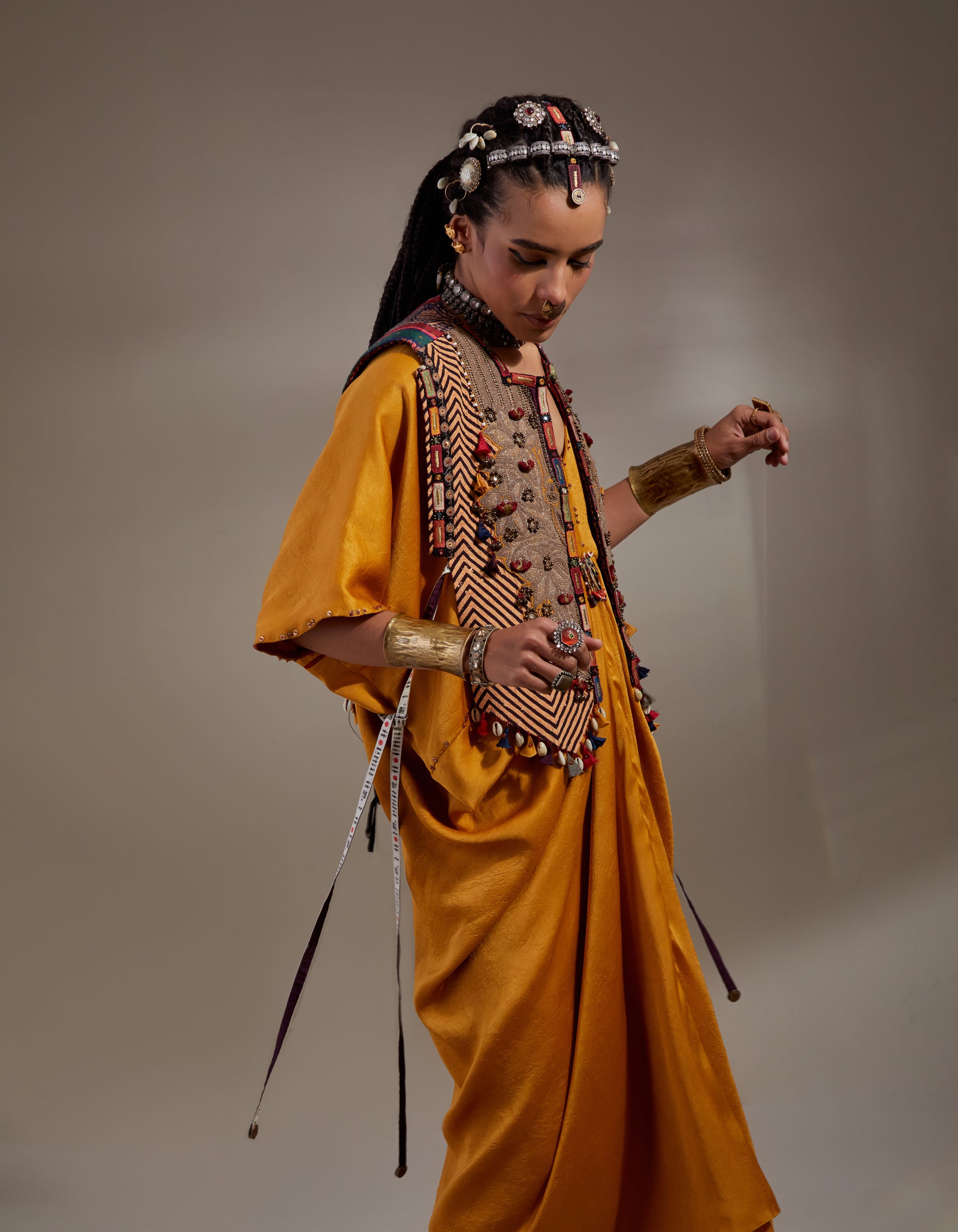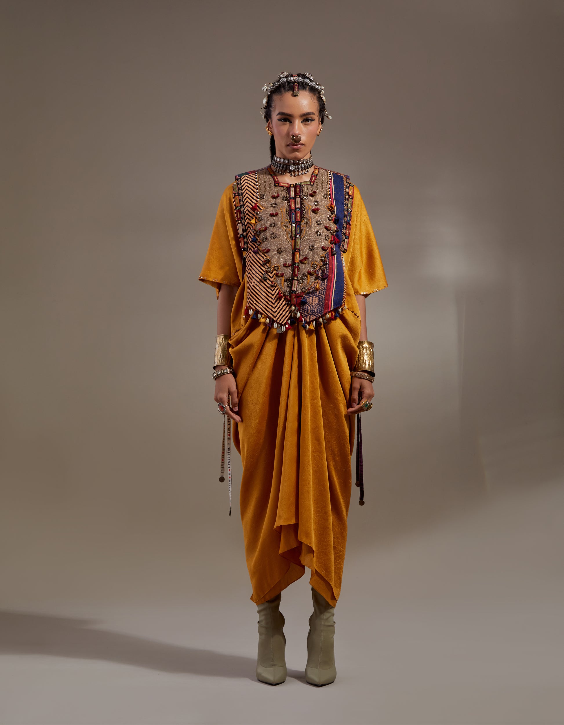 Solid textured drape dress with embroidered detailing paired with Embroidered gilet with tribal tassel details.