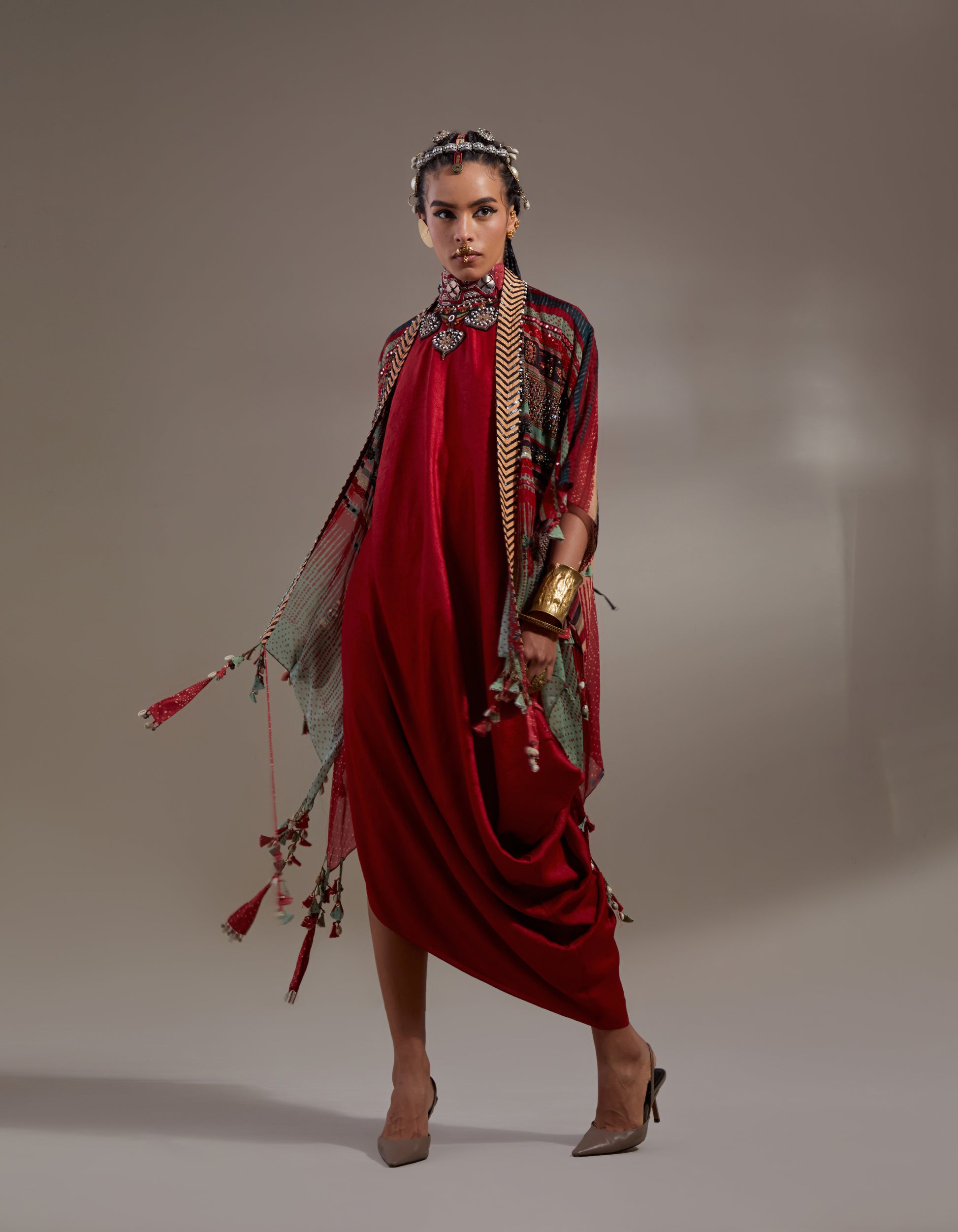 Embroidered and printed jacket with tribal tassel details. Paired with Solid textured drop shoulder drape dress with embroidered detailing at neck with back tie up