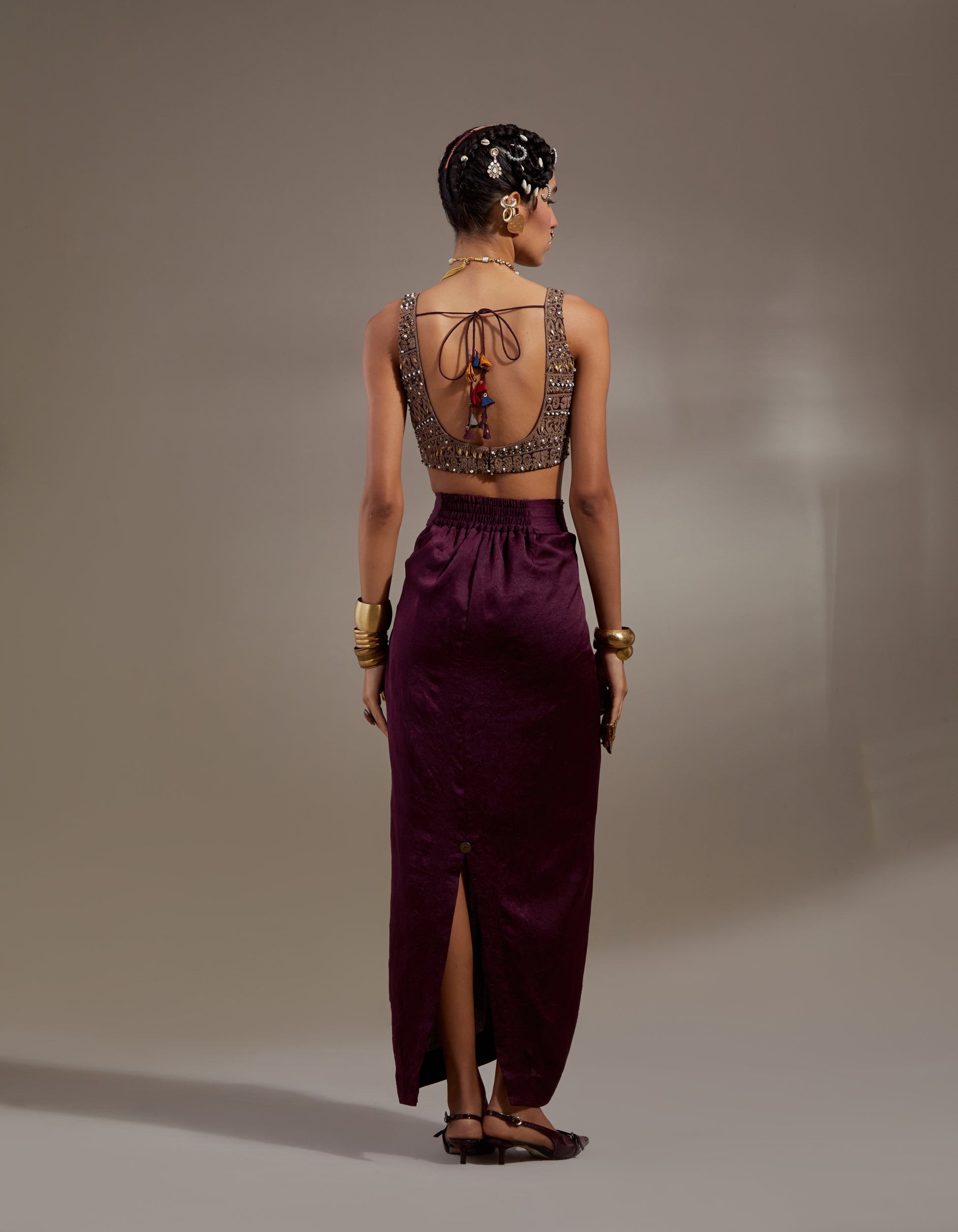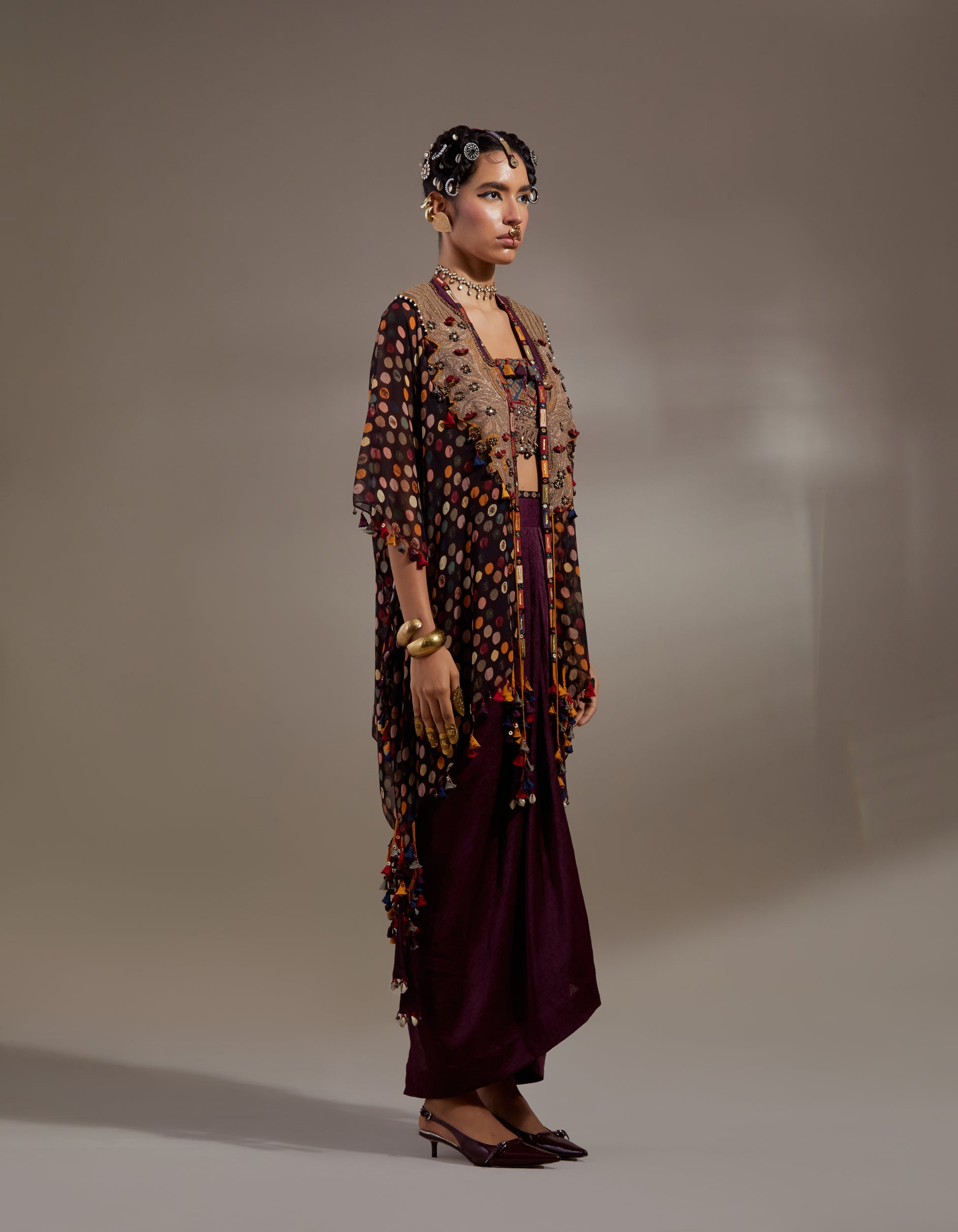 Full embroidered blouse with solid color textured skirt paired with embroidered veni dupatta jacket.