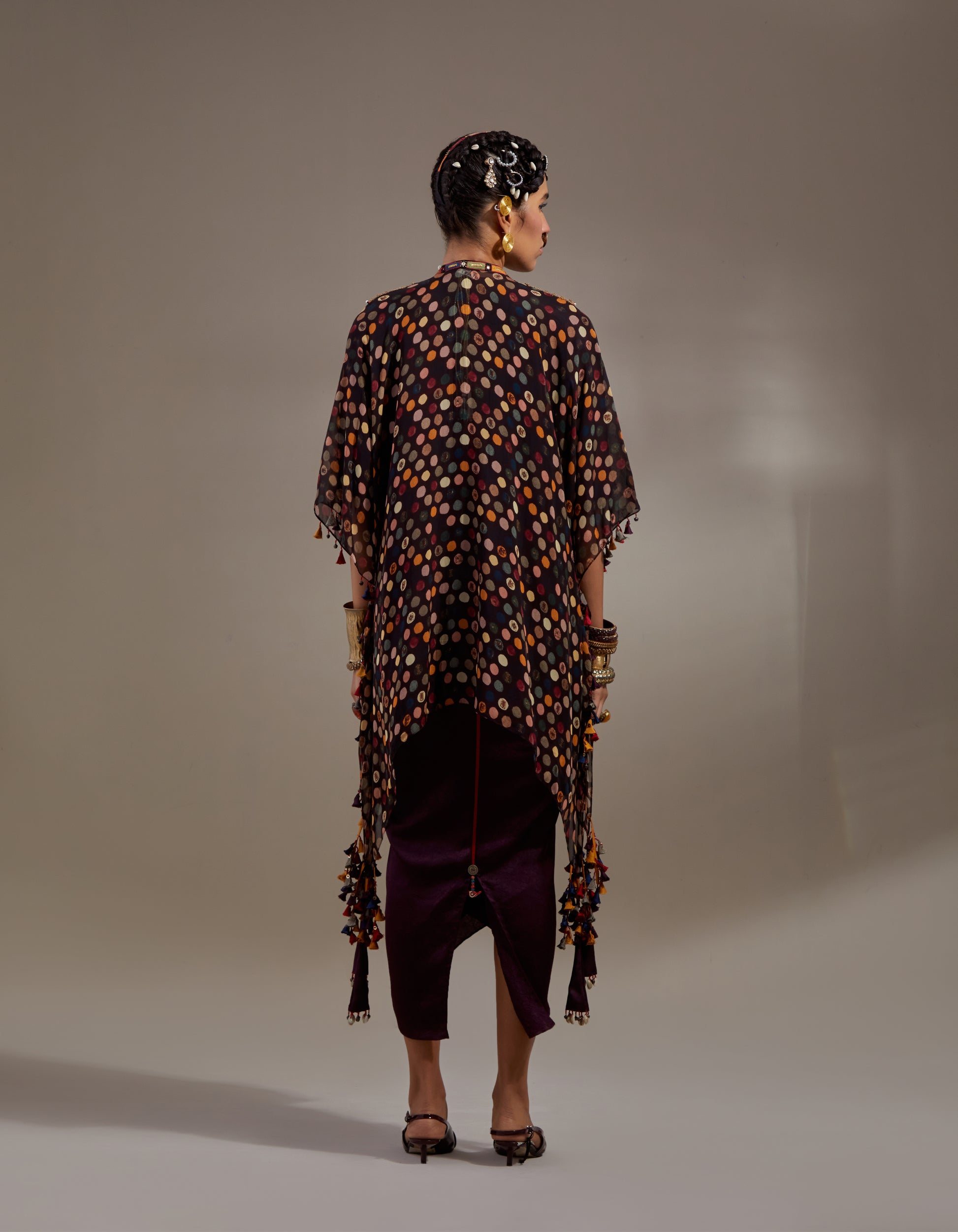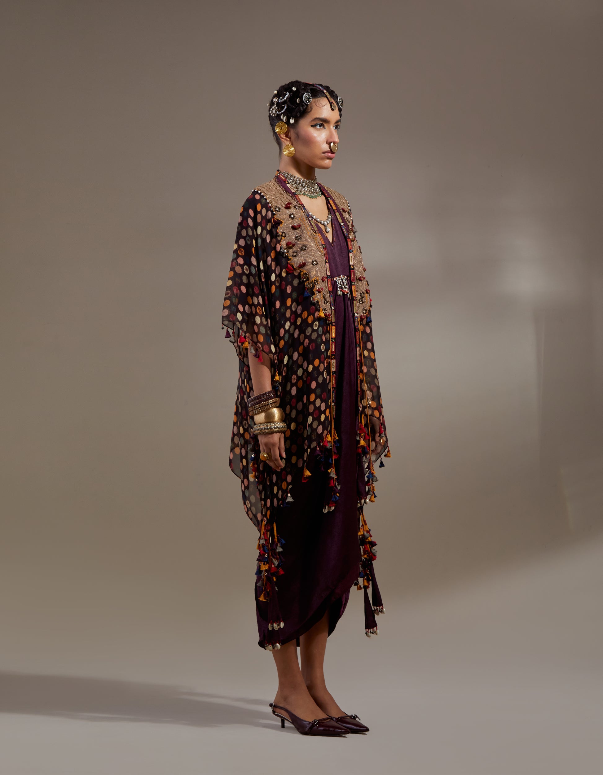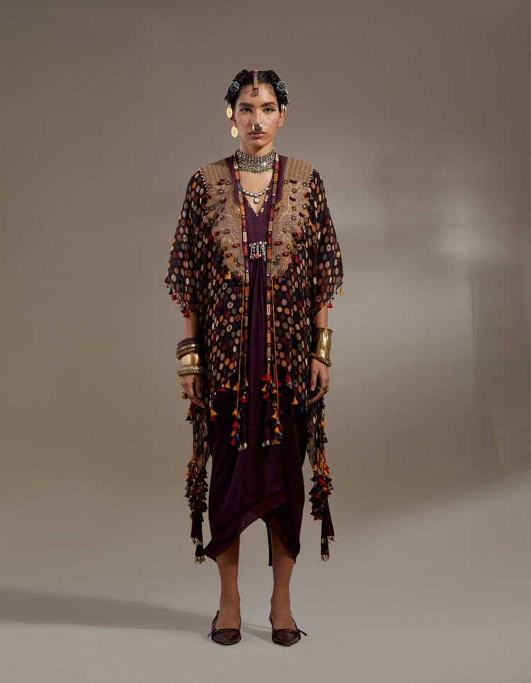 Embroidered and printed jacket with tribal tassel details Solid textured drape dress with embroidered detailing