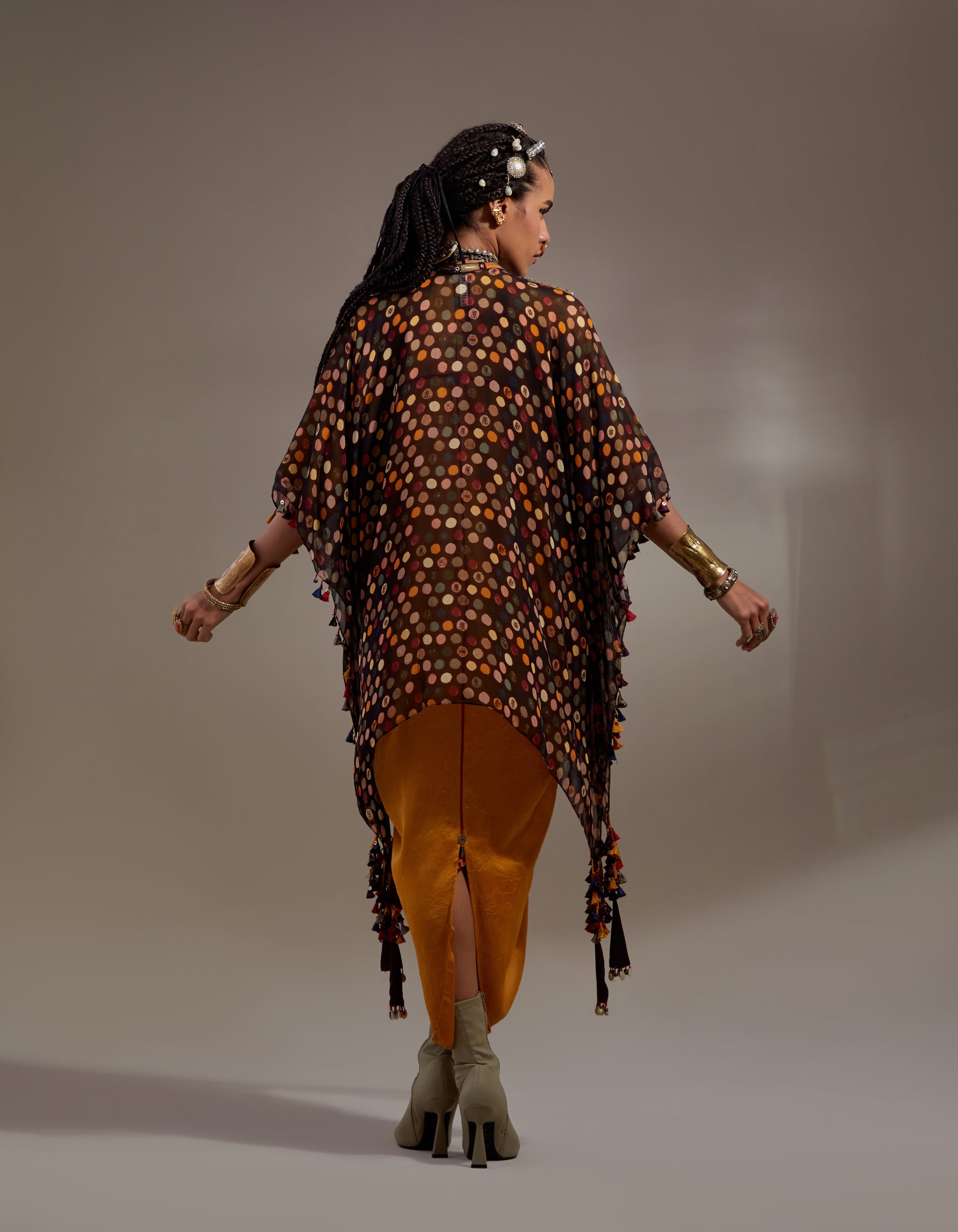 Embroidered printed jacket with tribal tassel details.