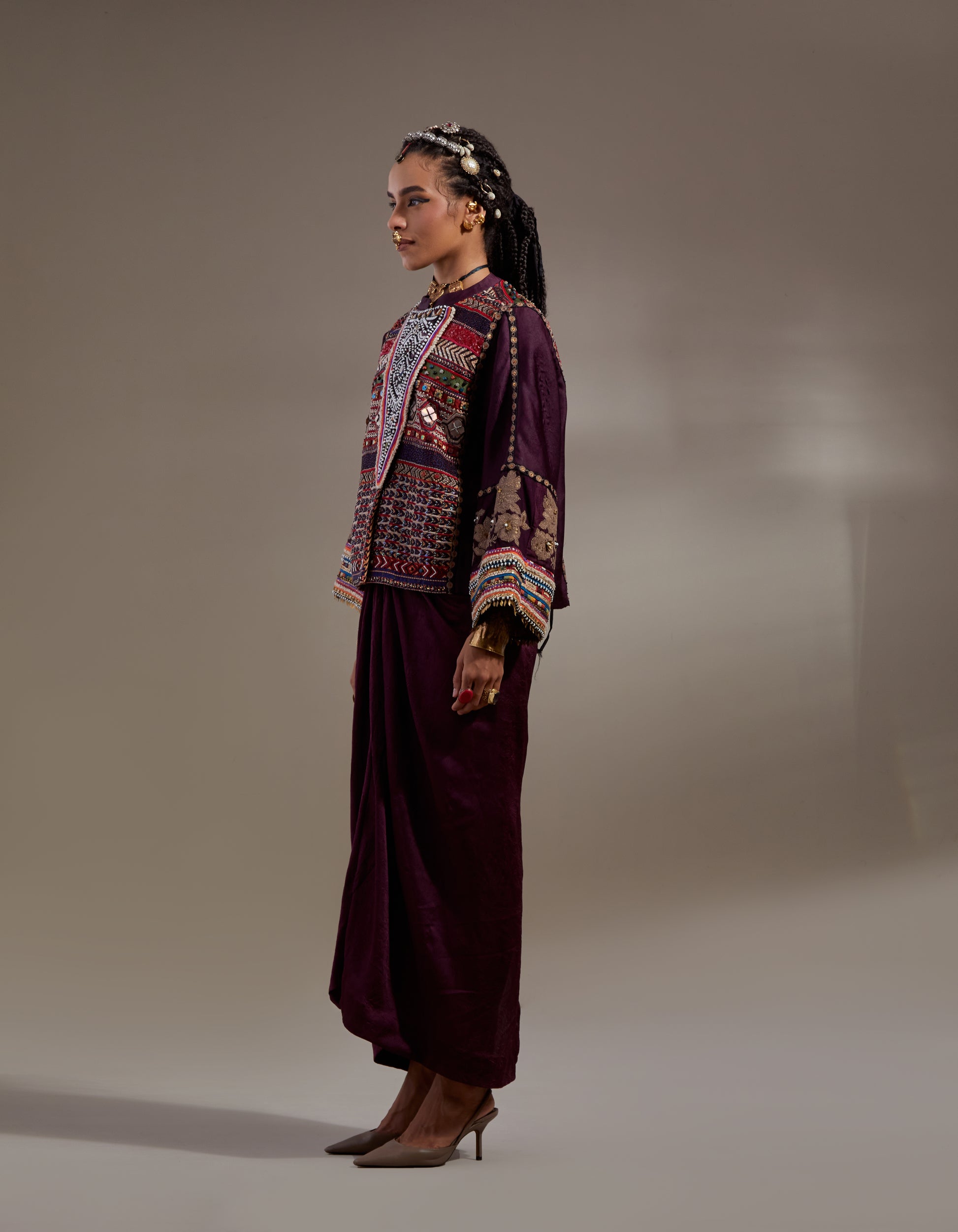 Embroidered and printed jacket with tribal tassel details with textured solid skirt.