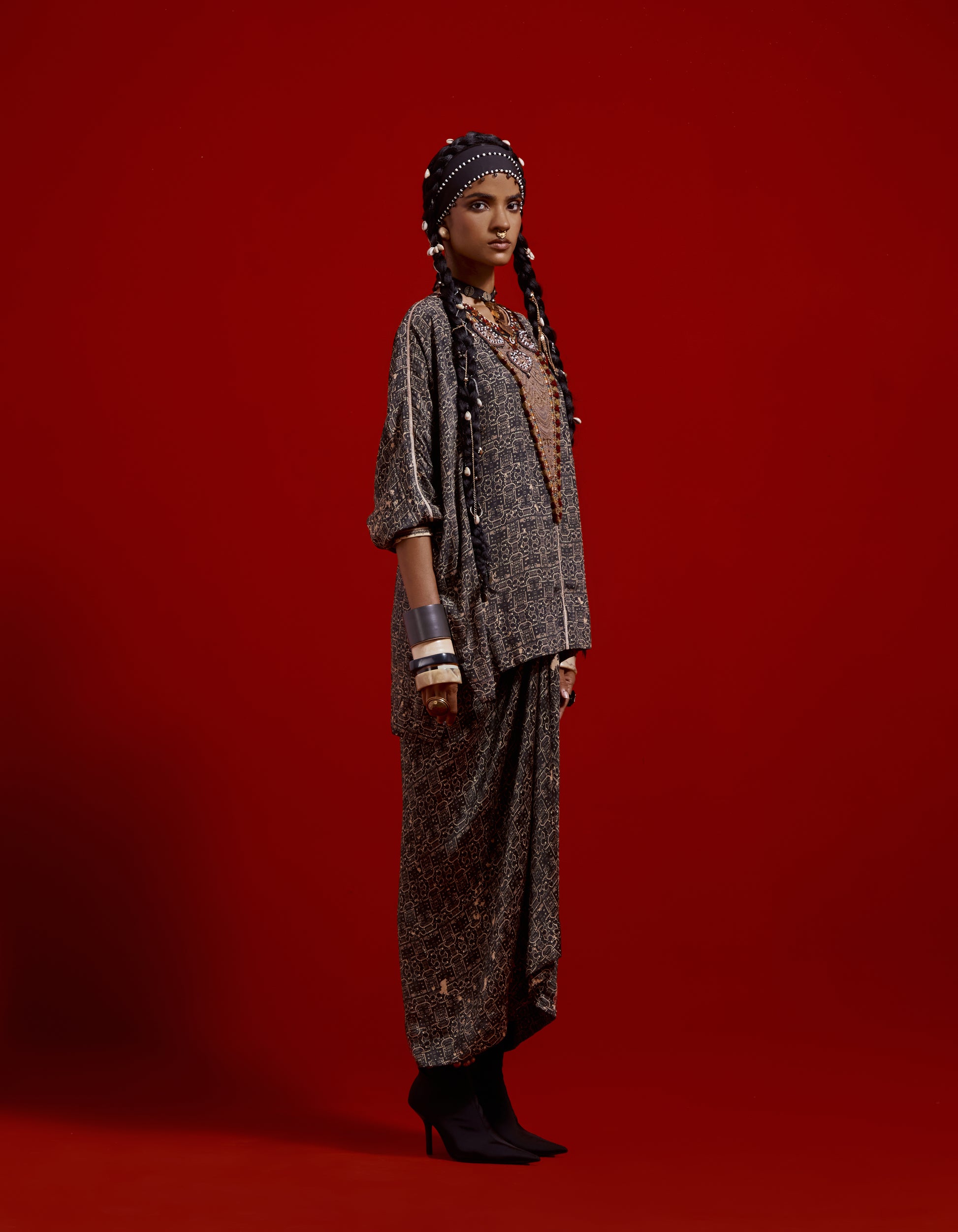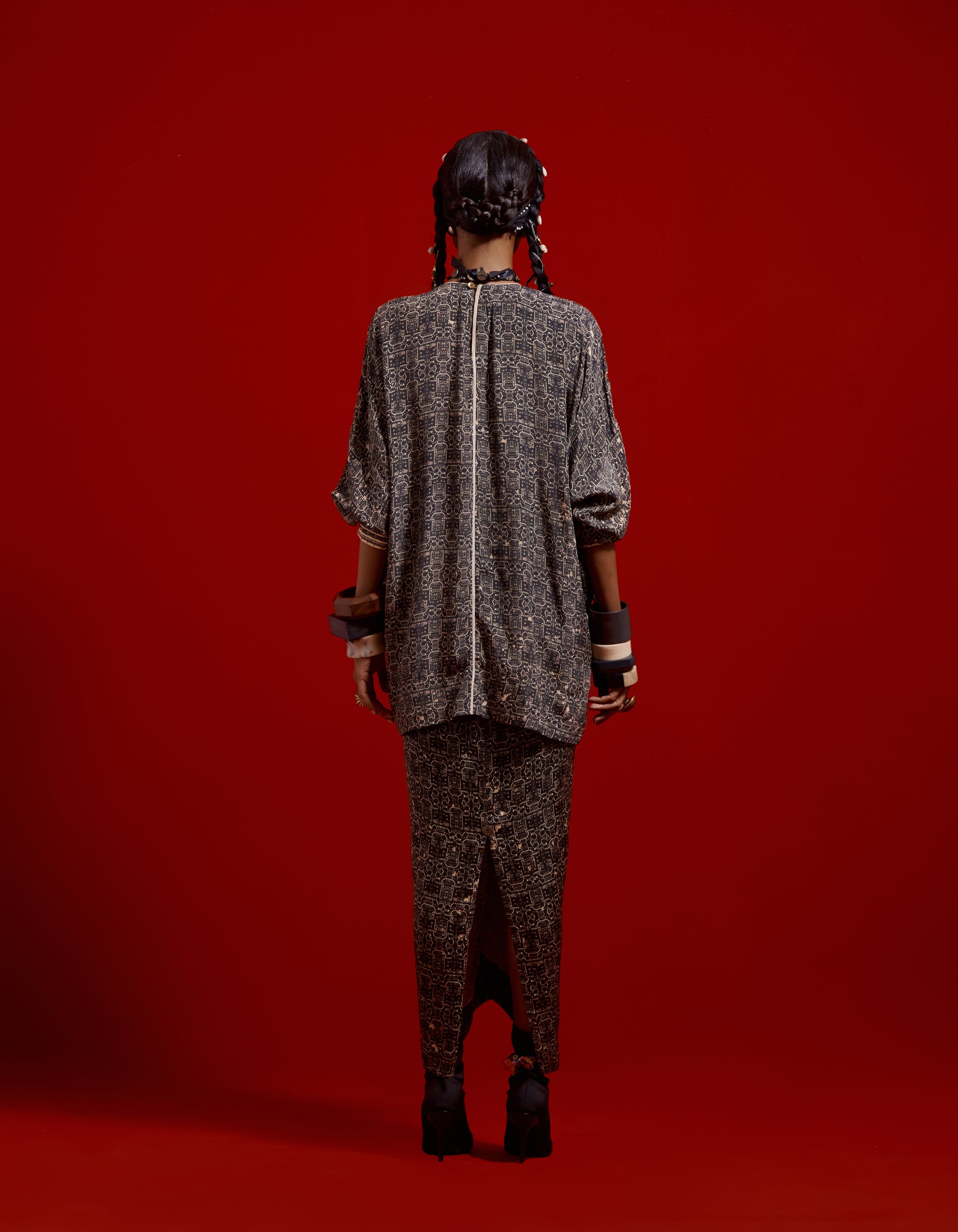 Printed and highlighted relaxed fit short kurti with inserts paired with printed draped skirt