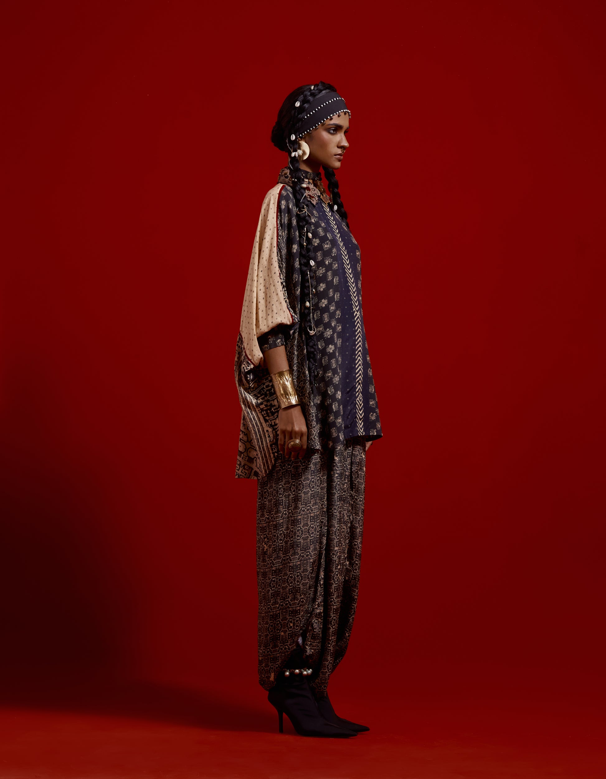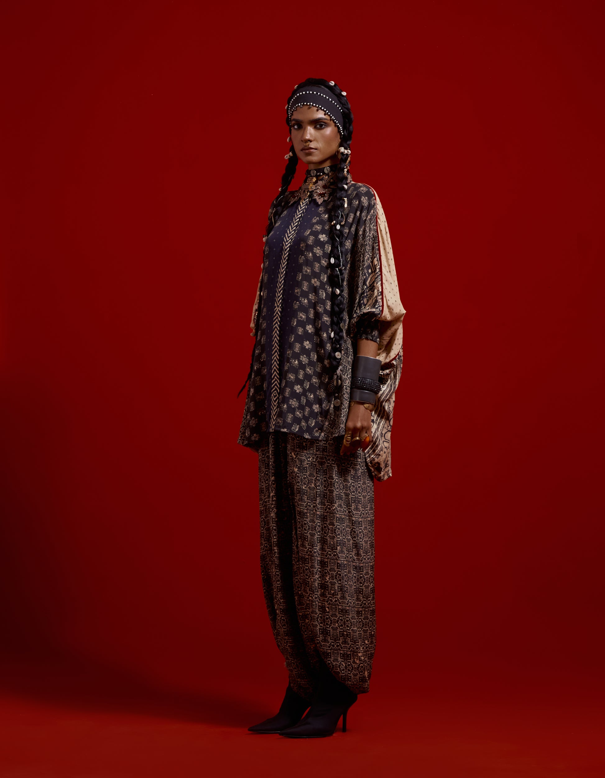 Printed free size shirt with embroidered collar paired with printed draped pants
