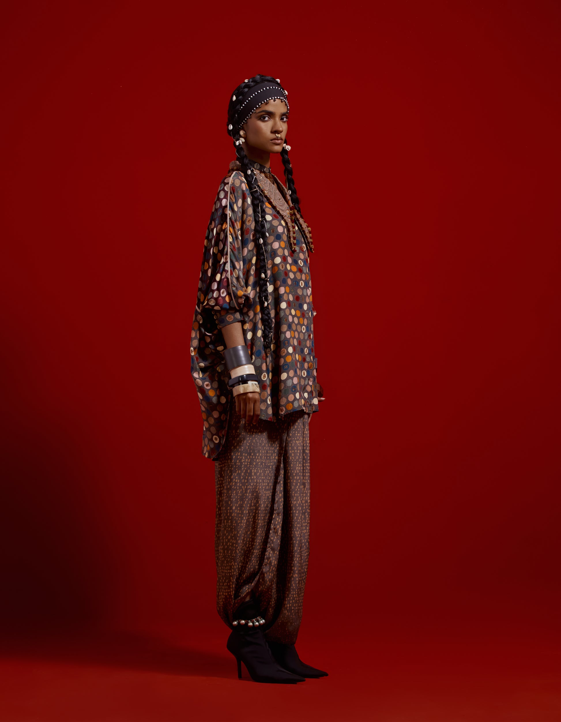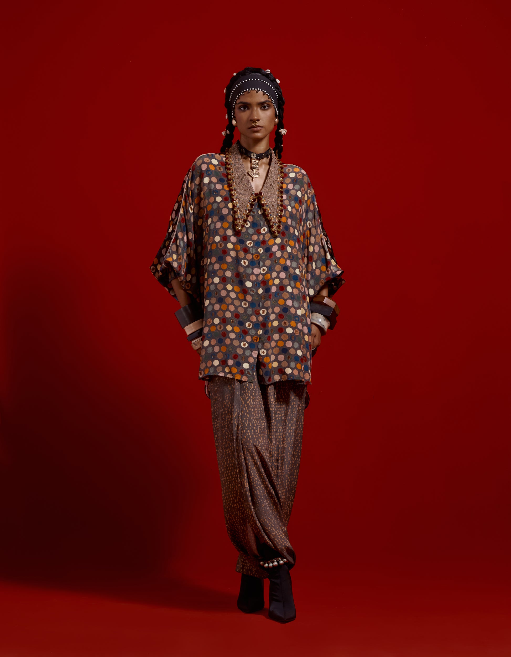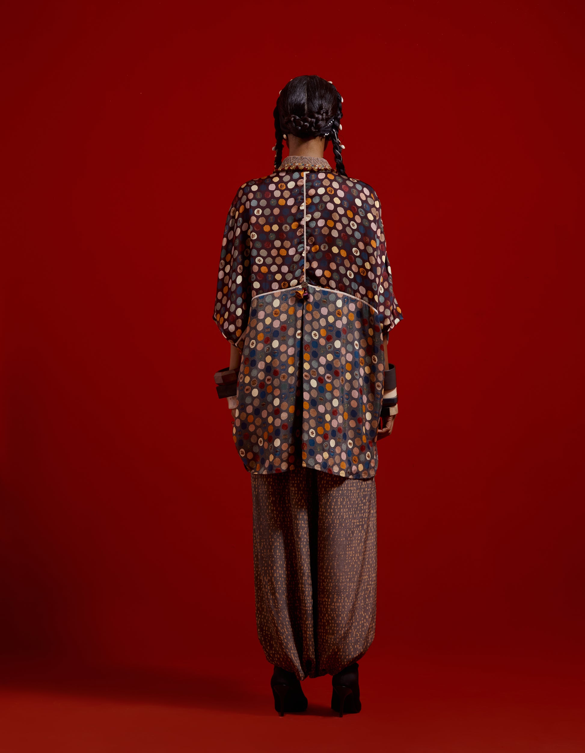 Polka print free size shirt with embroidered collar paired with printed draped pants