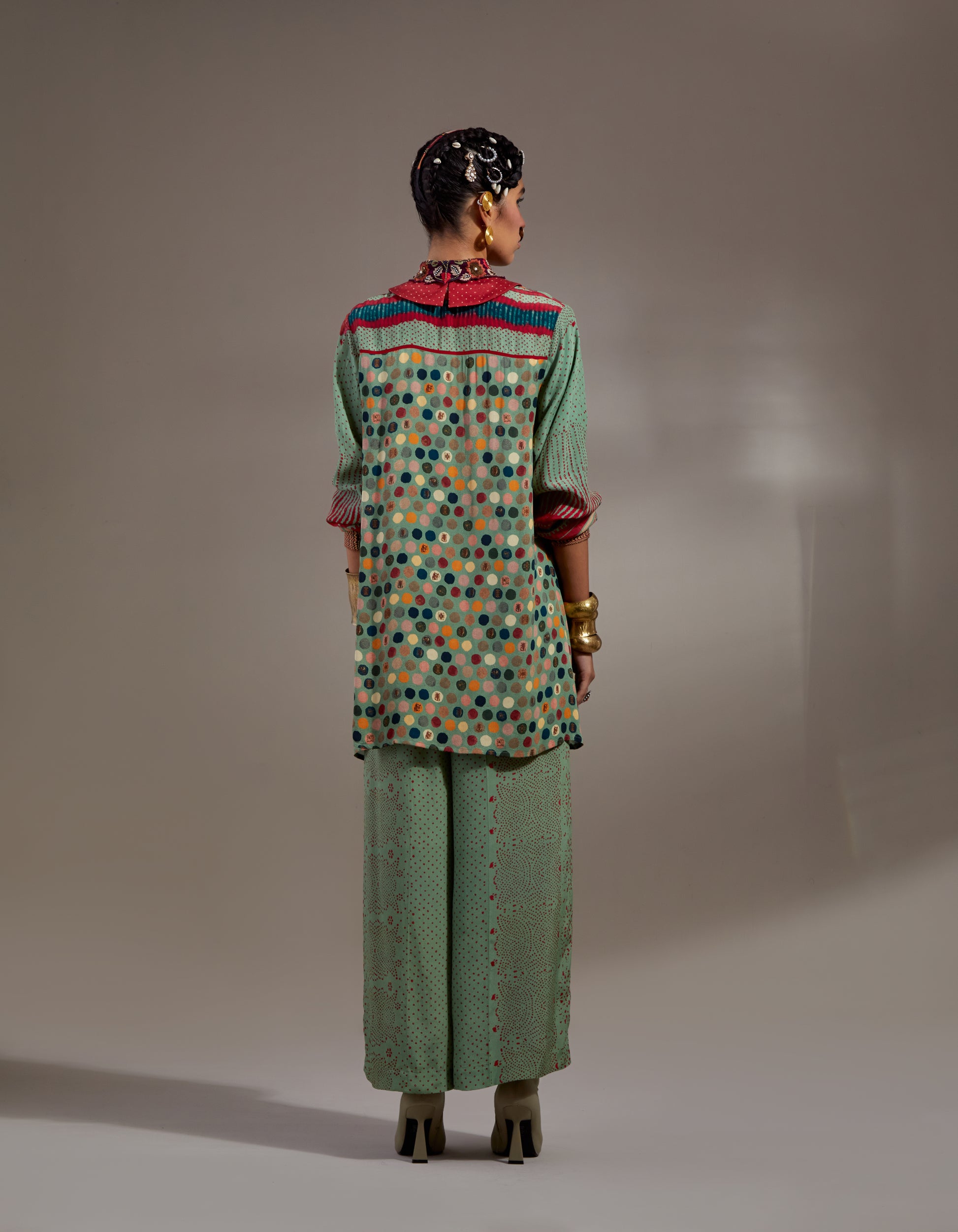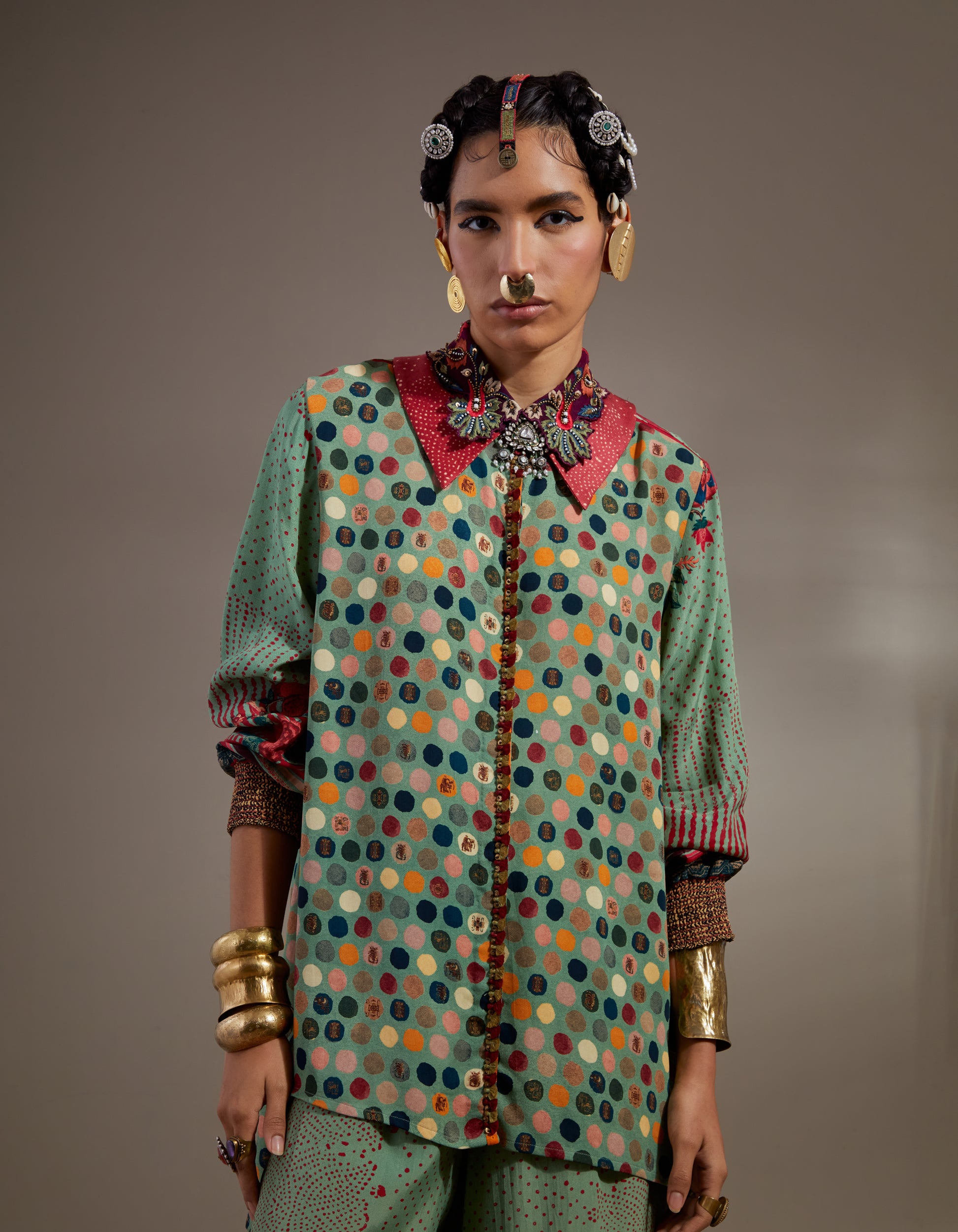 Polka print straight shirt with embroidered collar and standard sleeve.