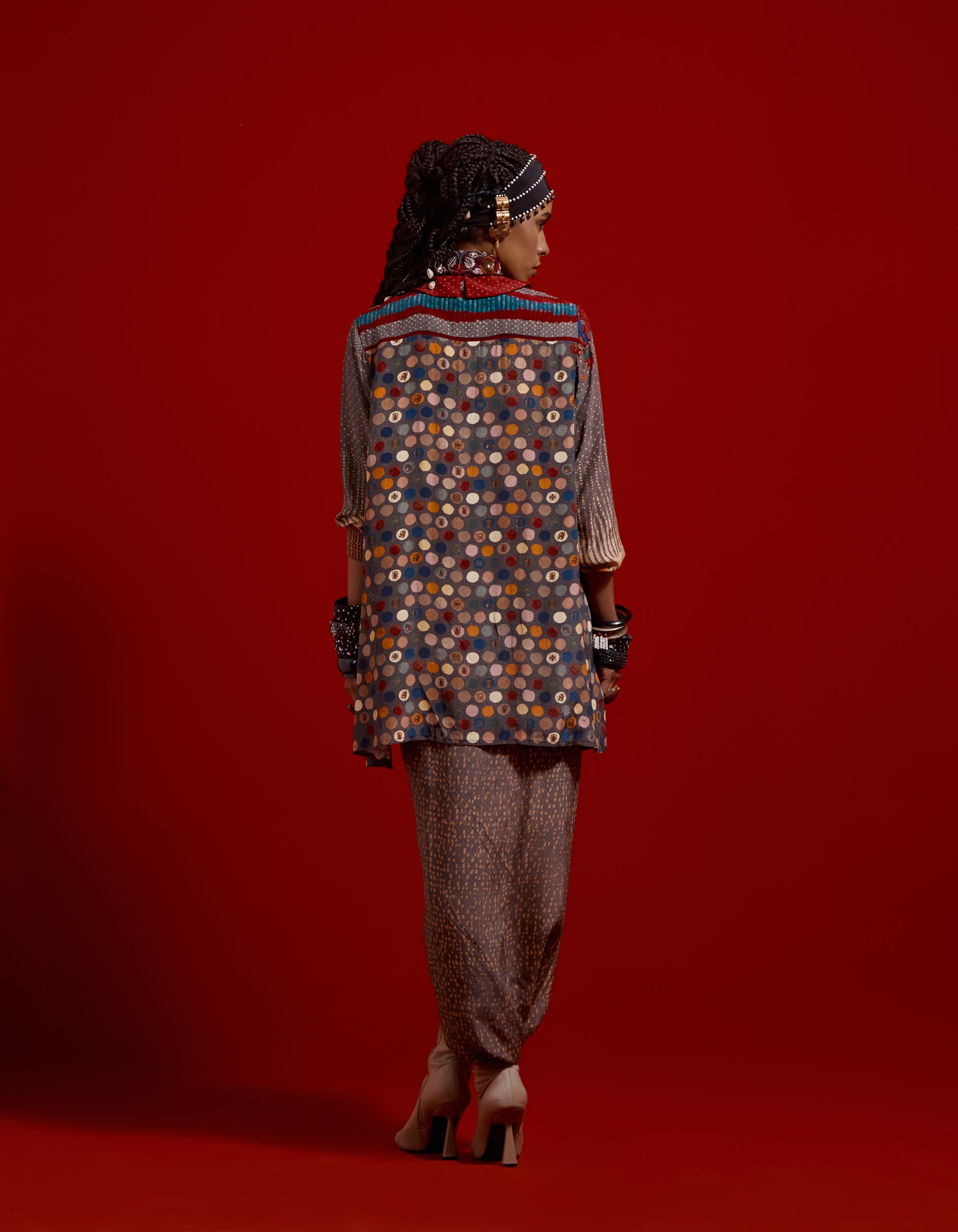 Polka print straight shirt with embroiderd collar paired with printed draped trouser.