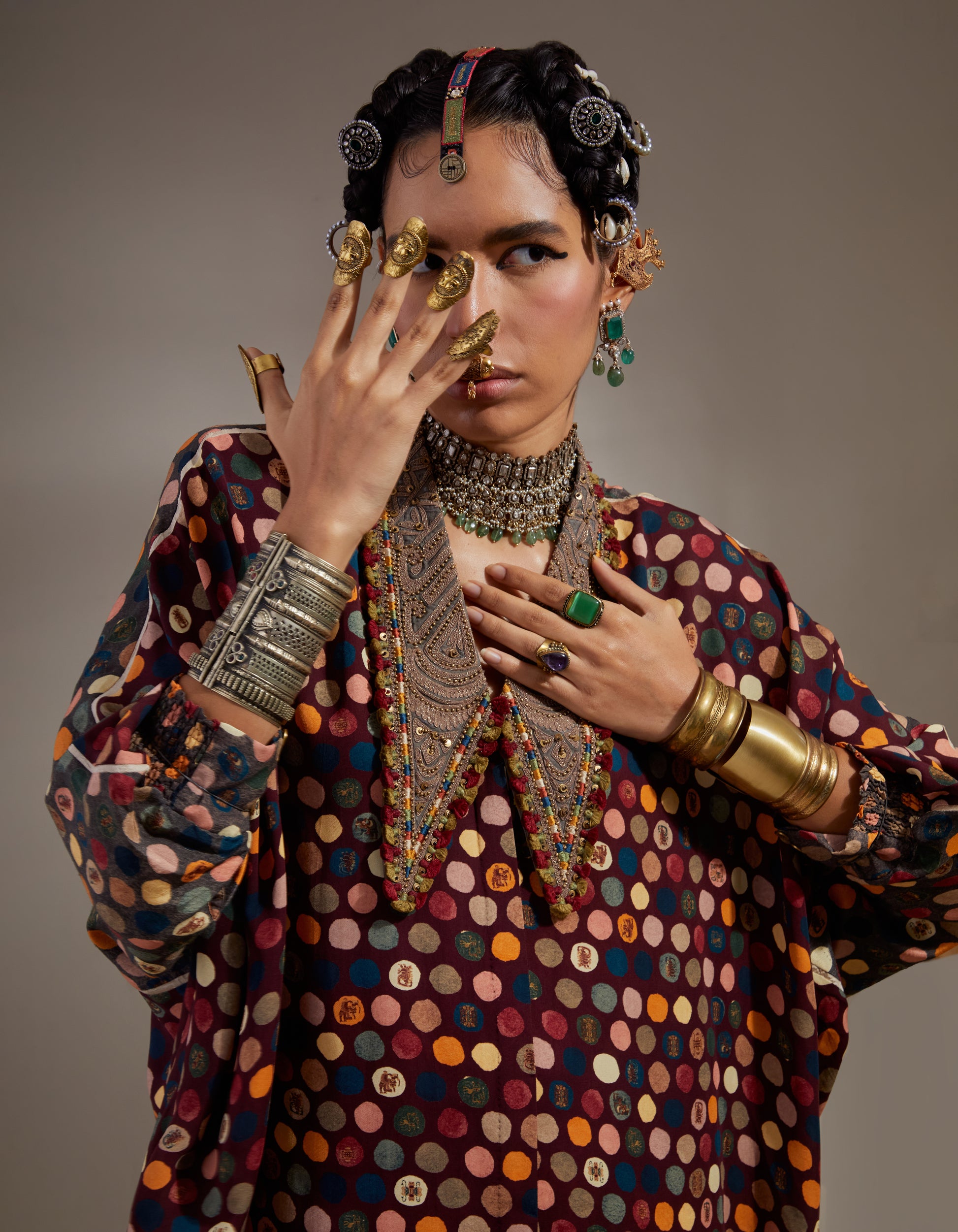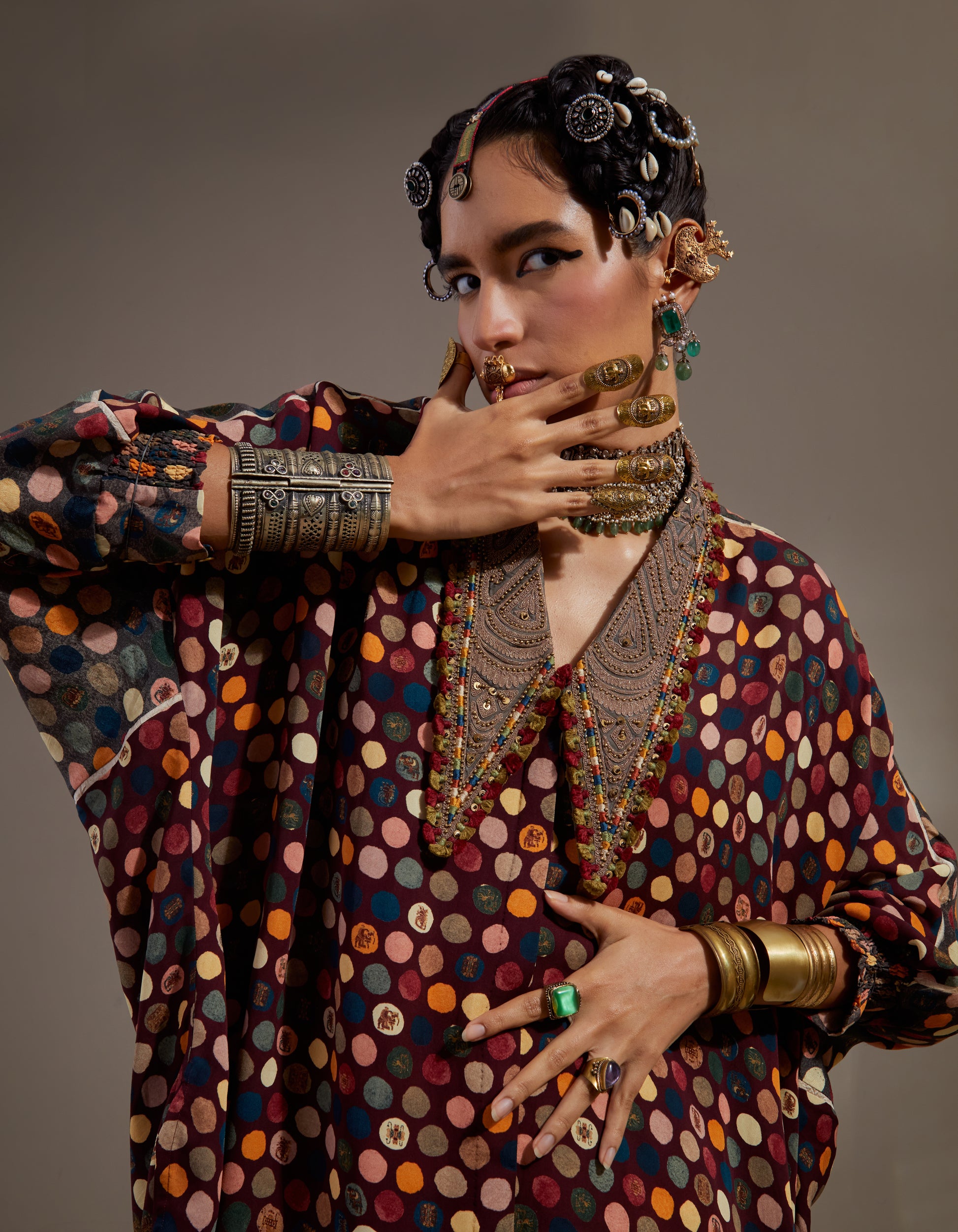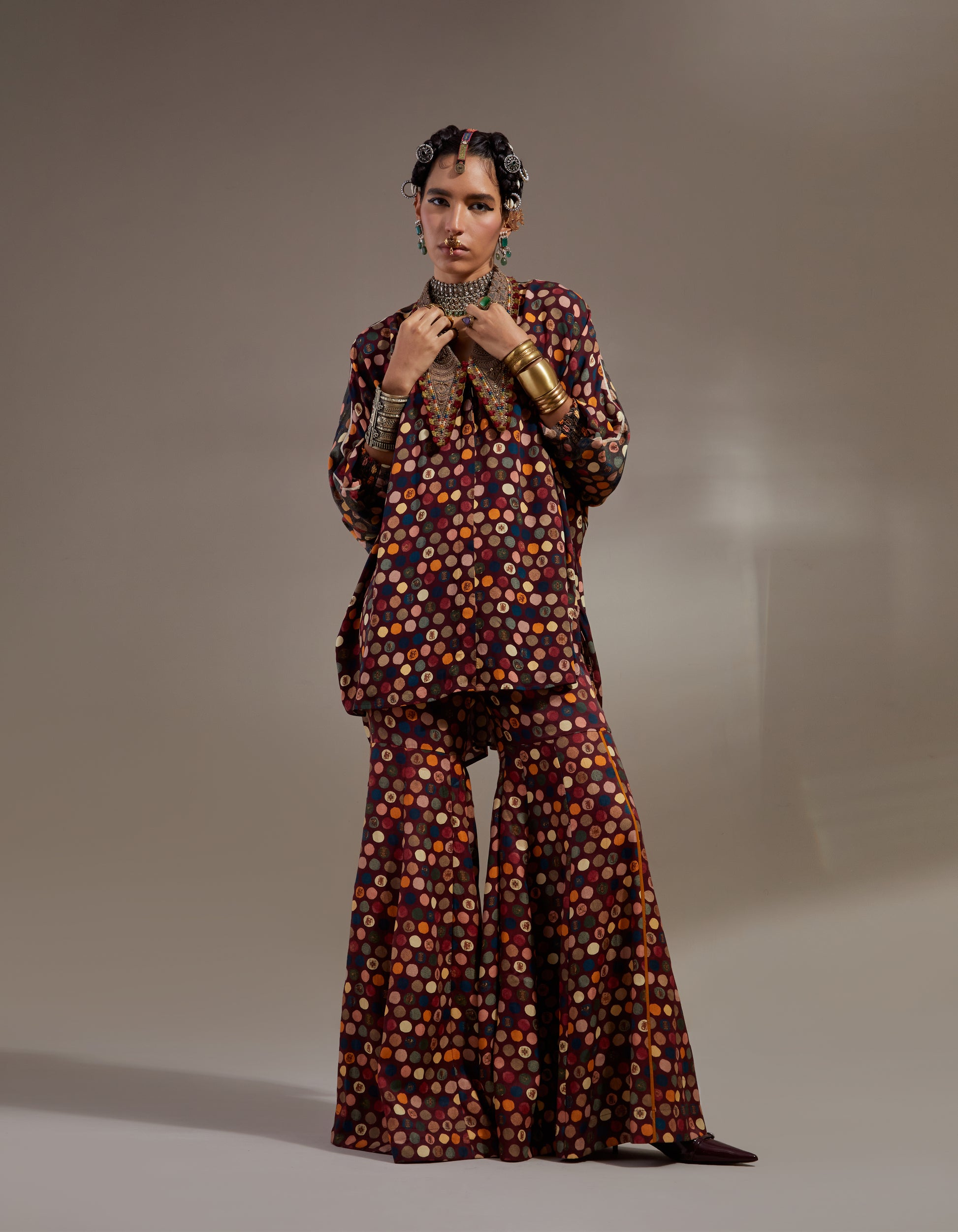 Polka print free size shirt with embroidered collar