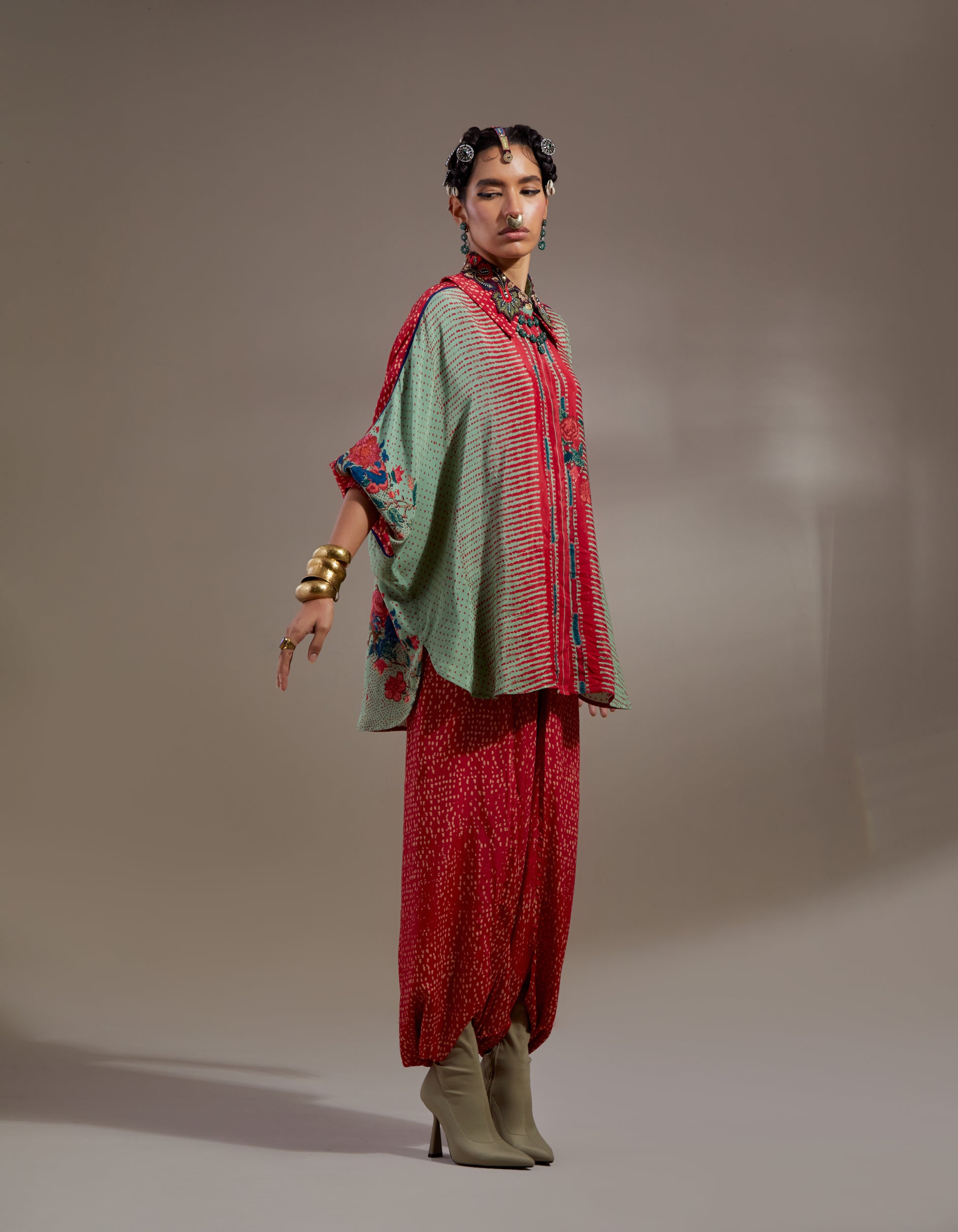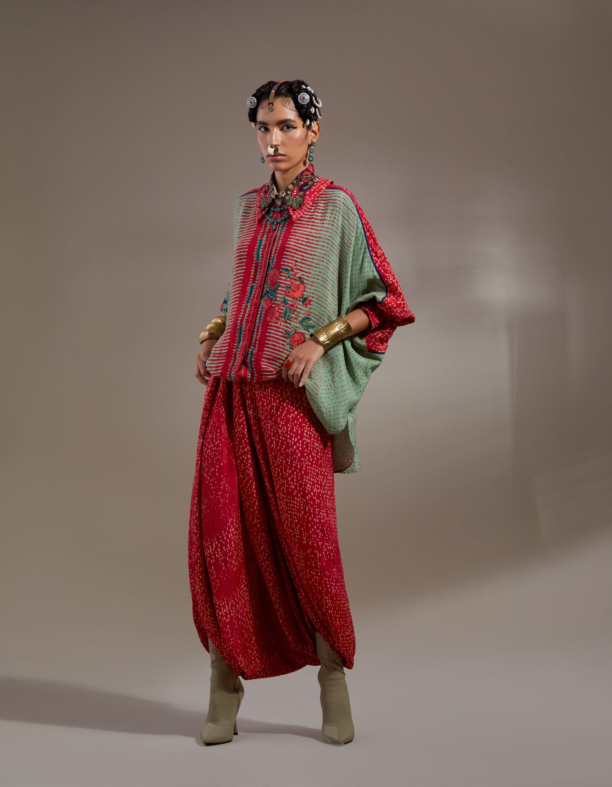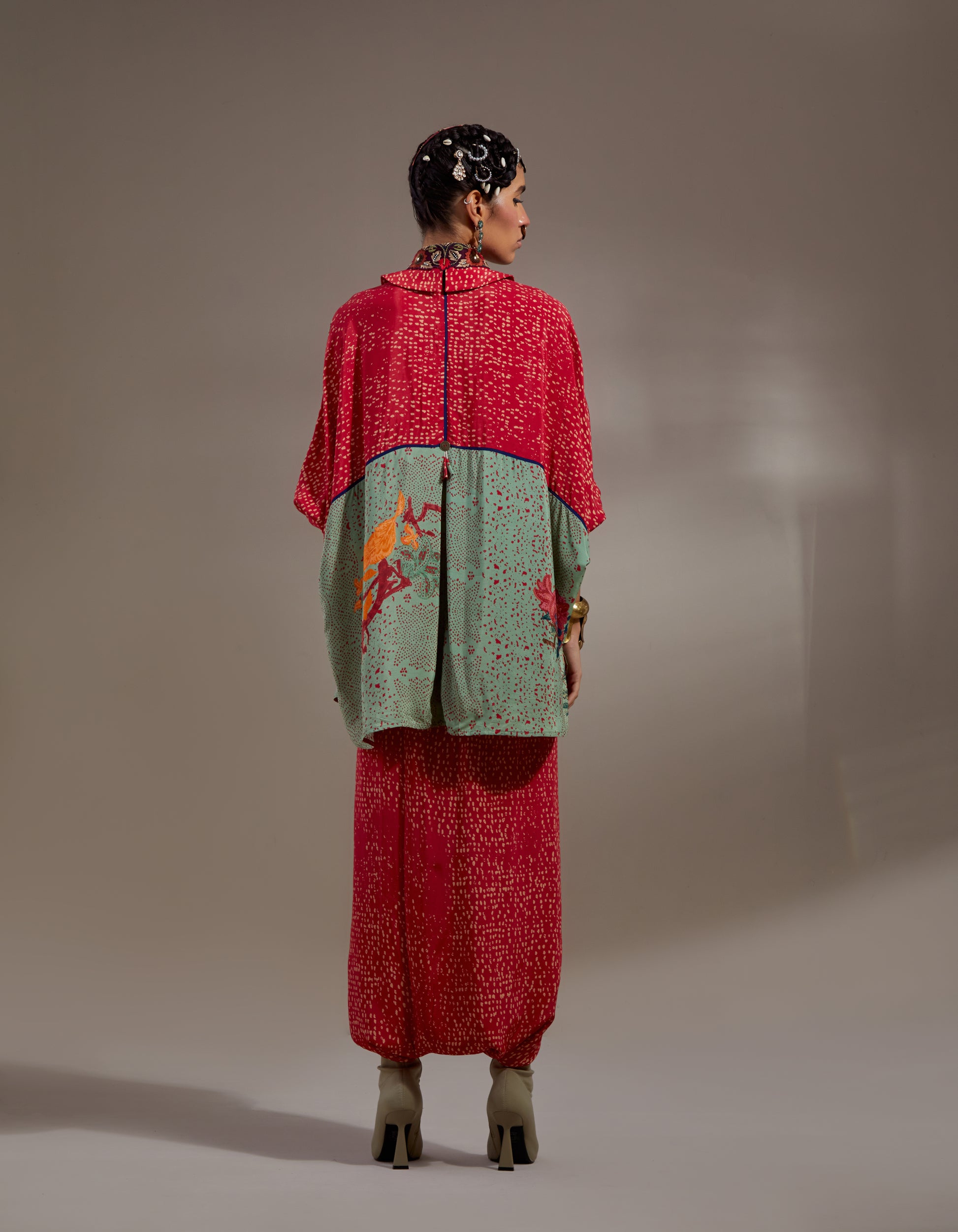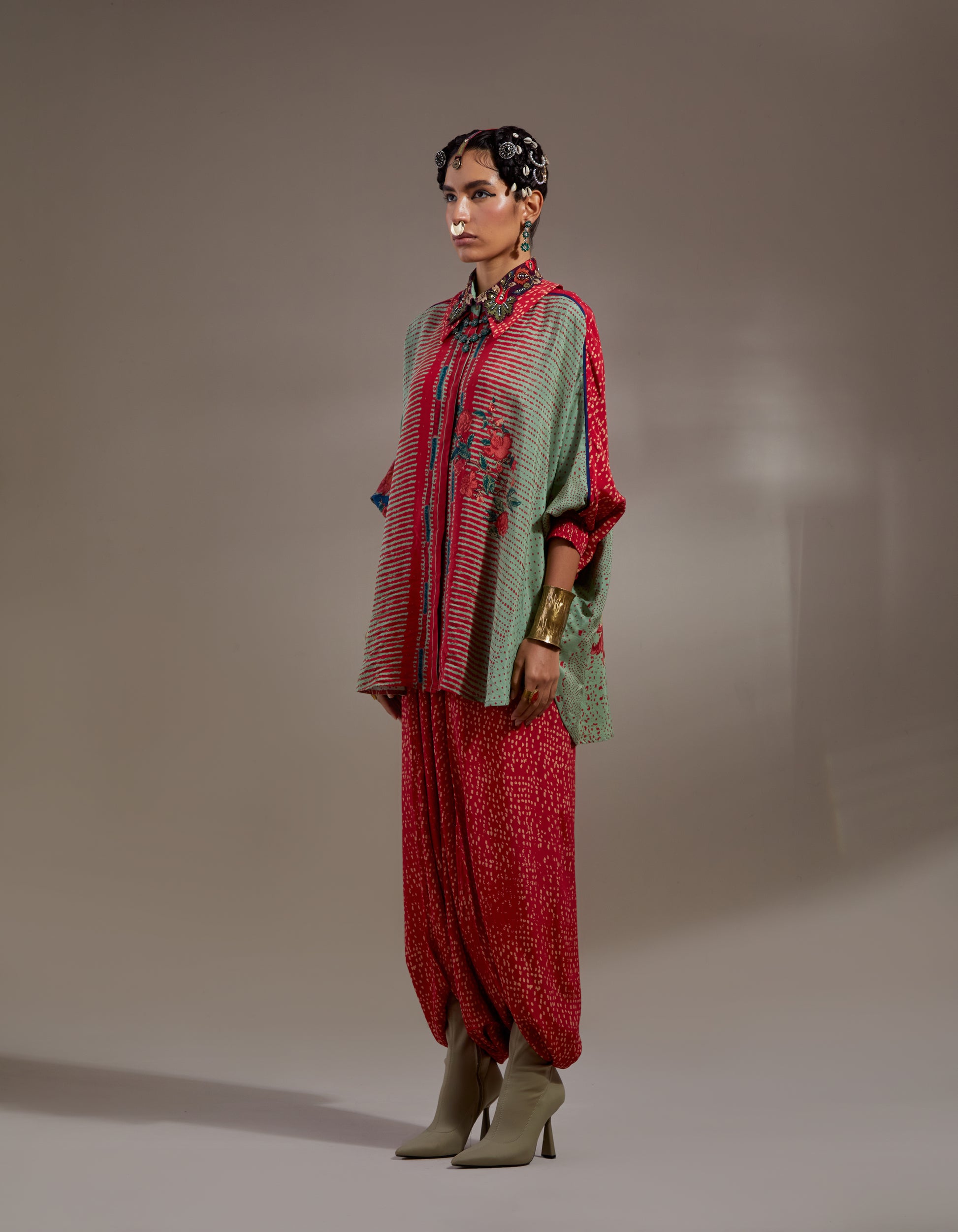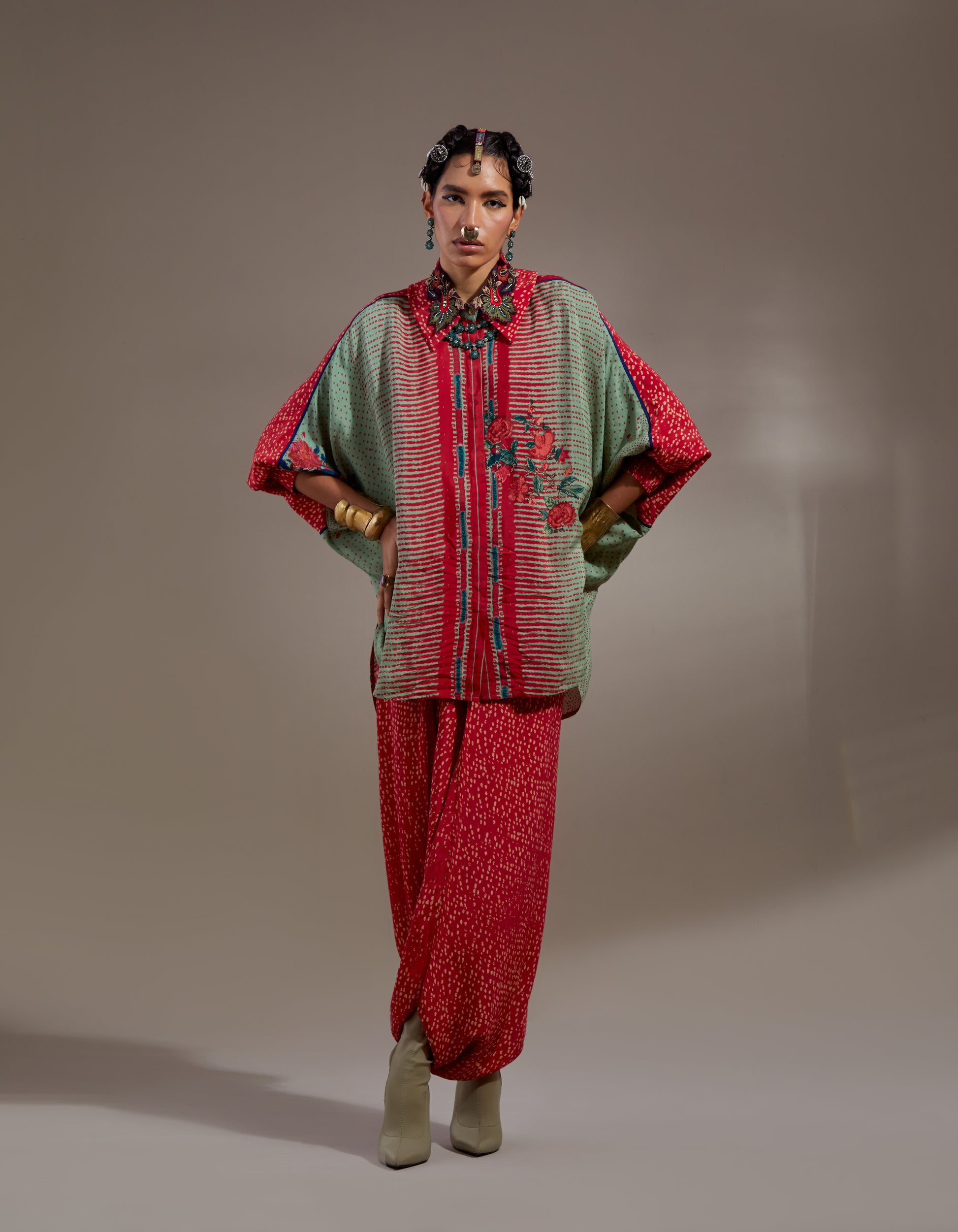 Polka print free size shirt with embroidered collar paired with printed sharara pants