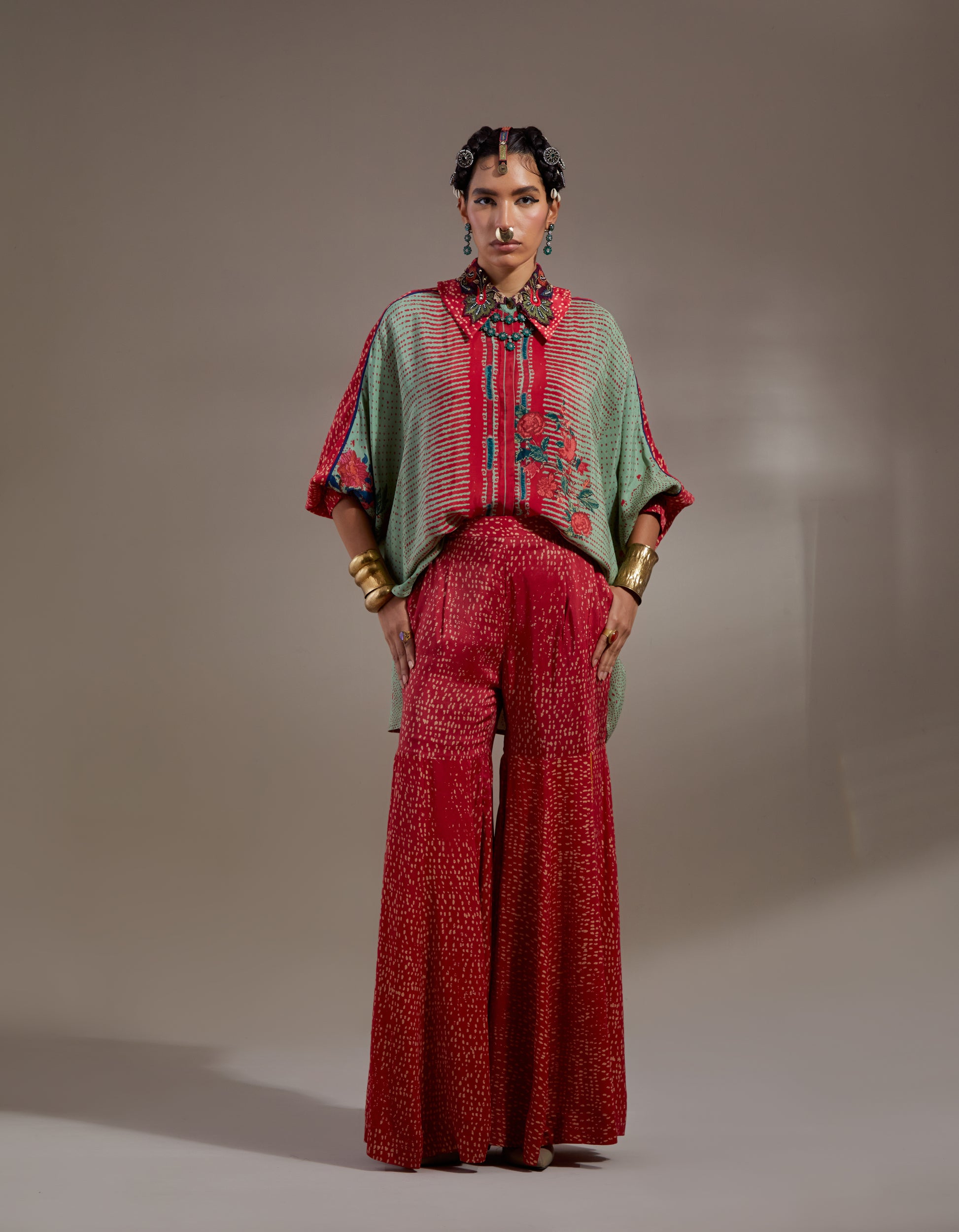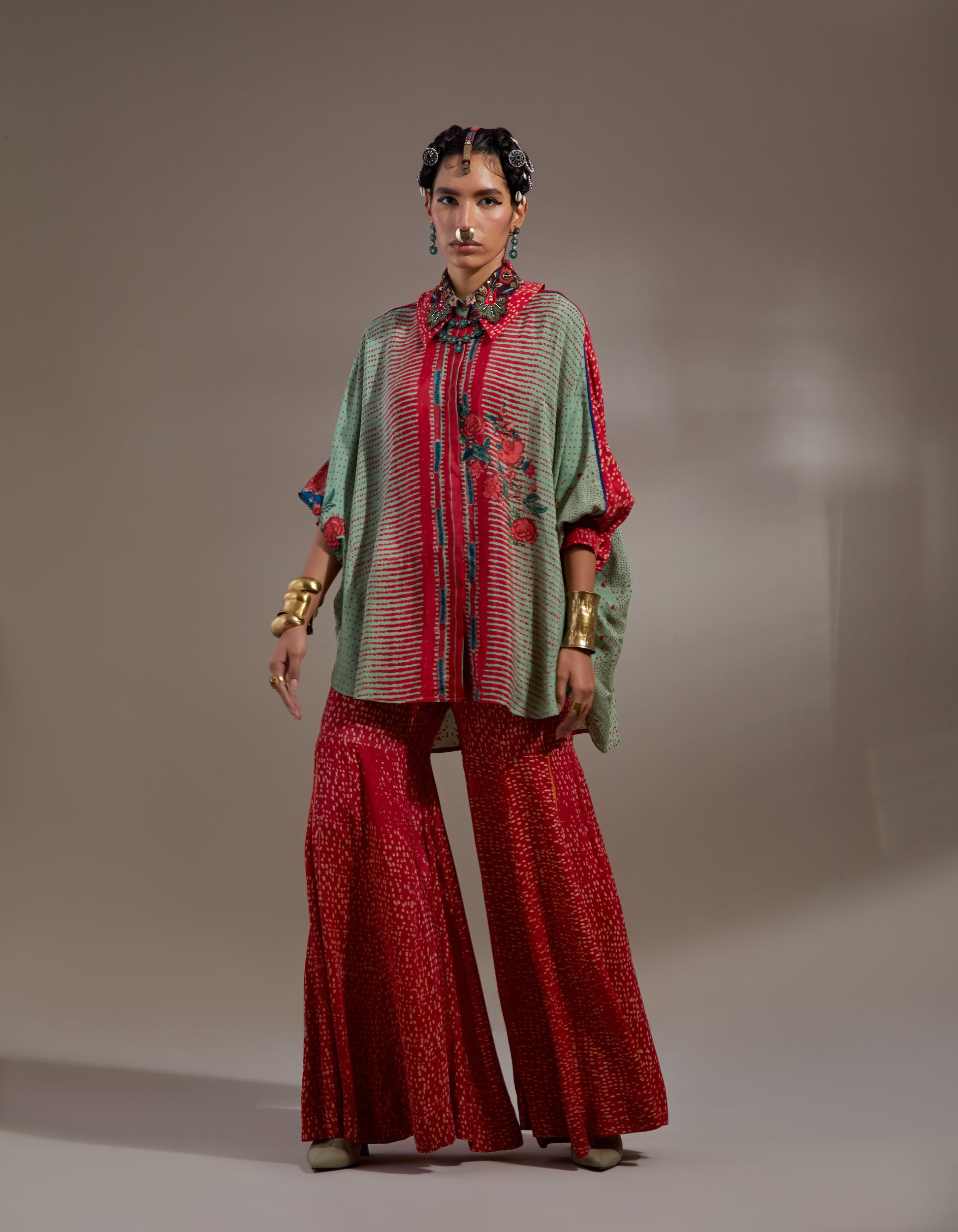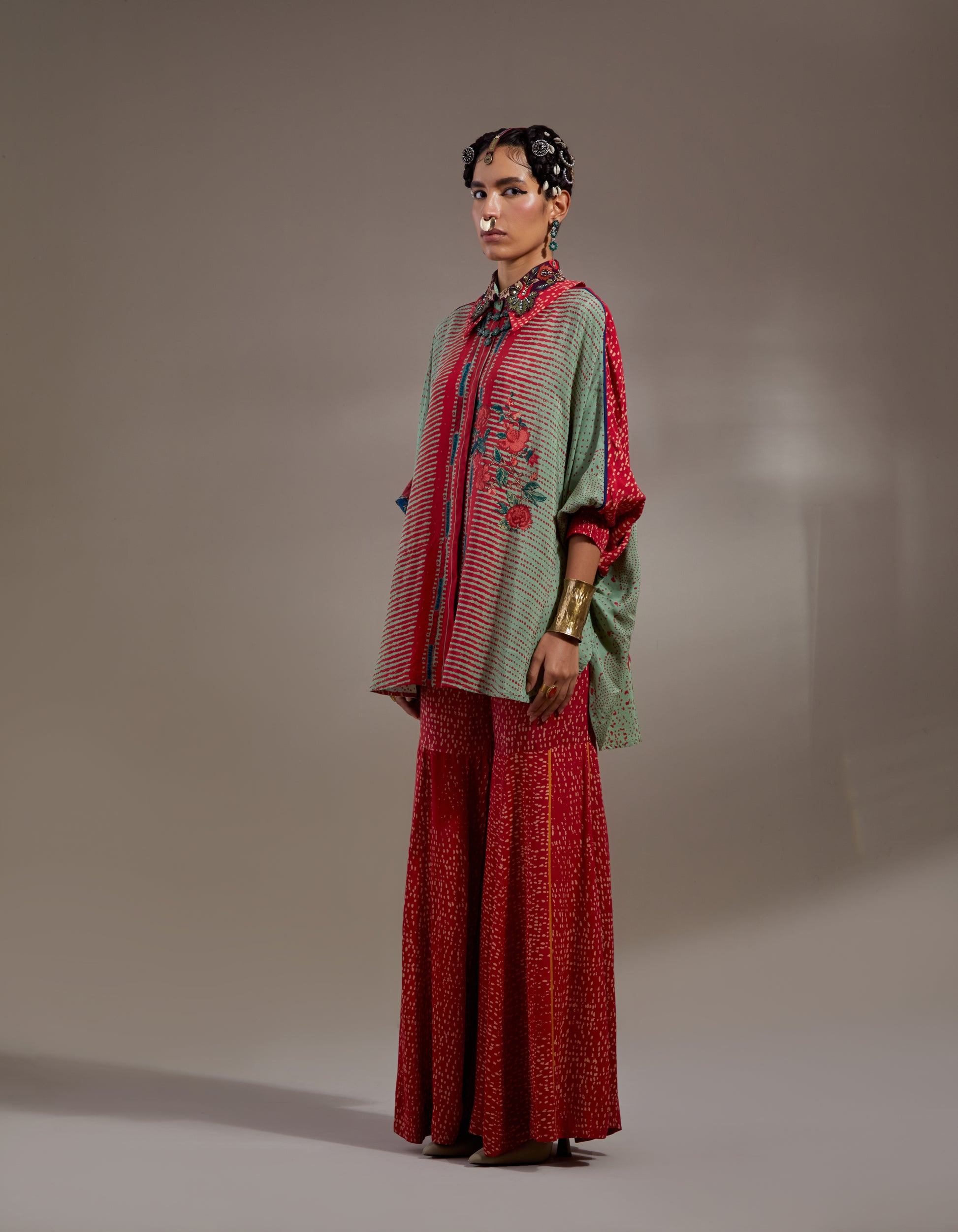 Printed free size shirt with embroidered collar paired with printed sharara pants