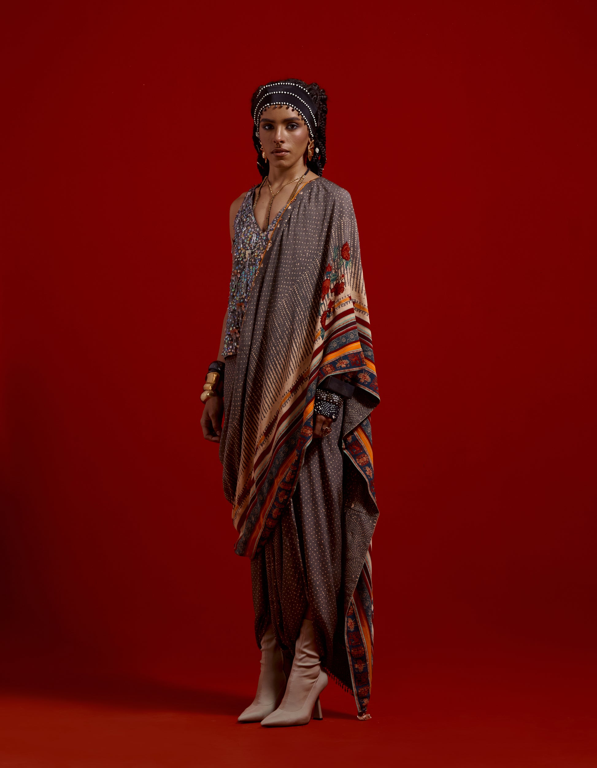 Full embroidered top with tassel detailing and closure at back paired with printed draped saree