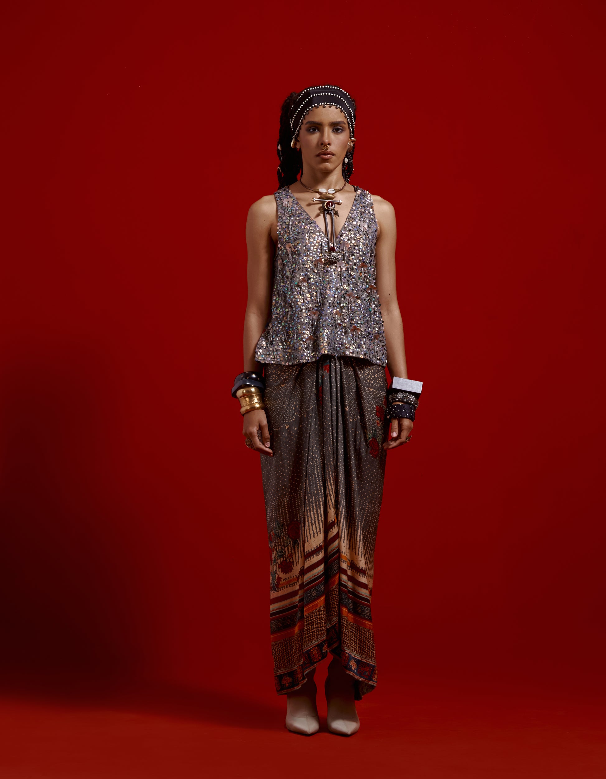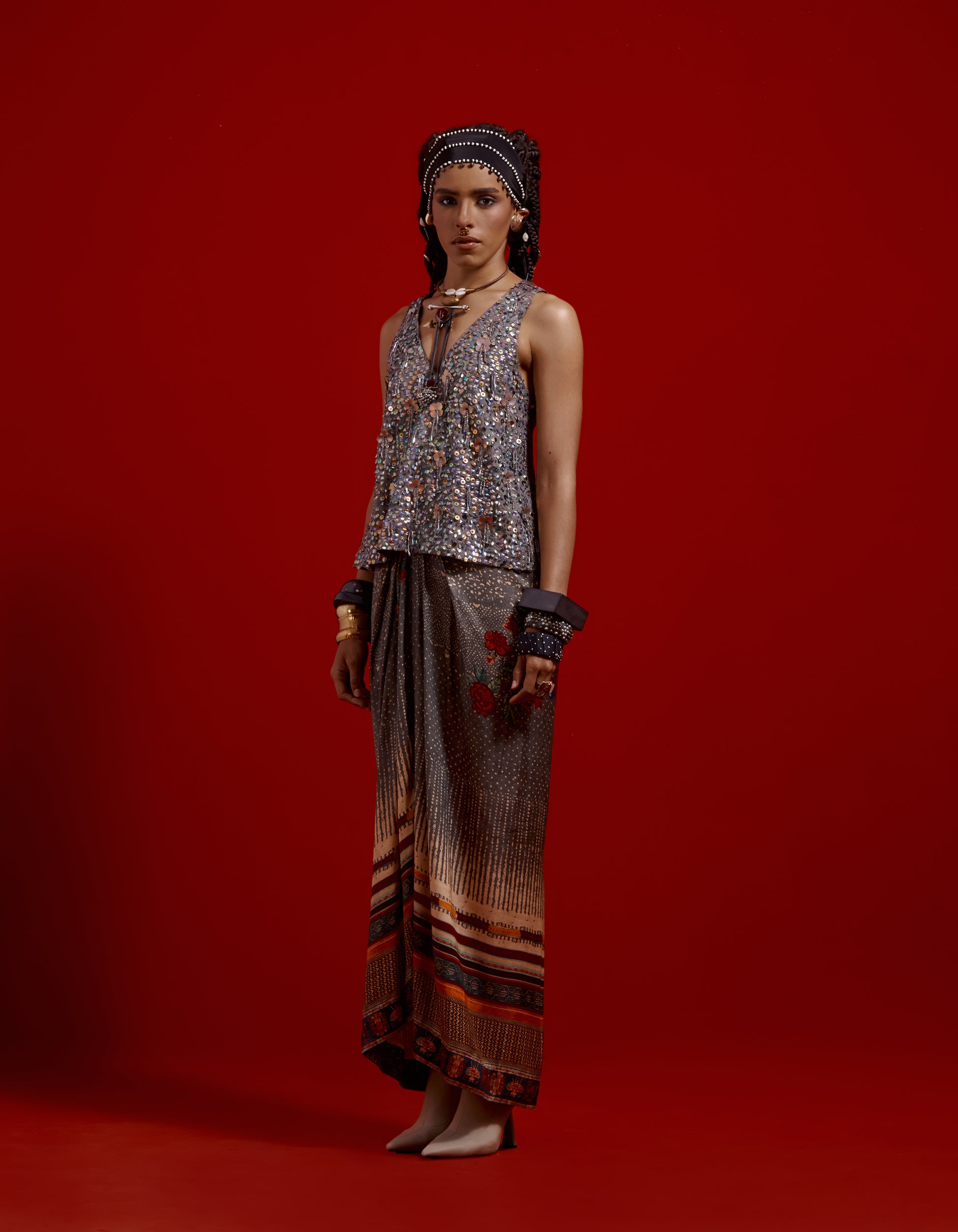 Embroidered top with tribal tassel details. Full embroidered top with tassel detailing and hook closure at back paired with printed skirt.