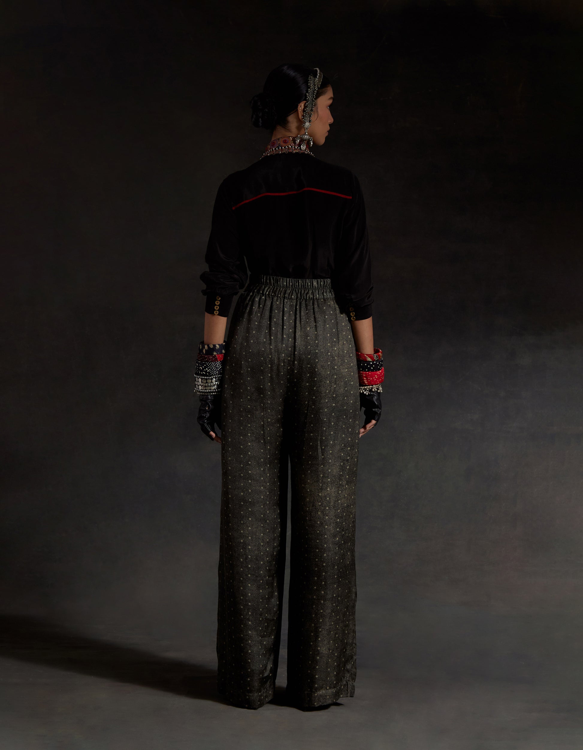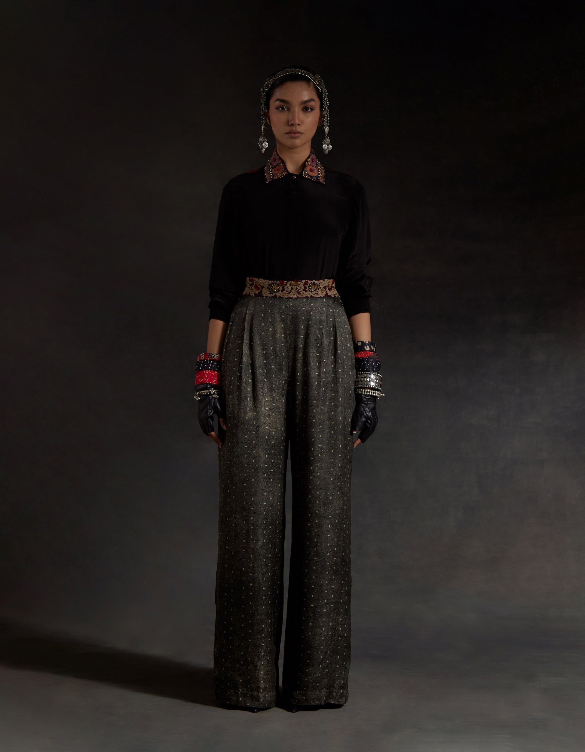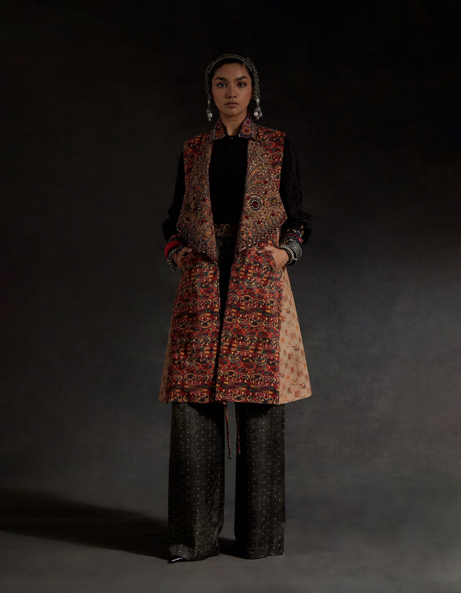 Solid colored shirt with embroidered collar paired with embroidered waistband baggy trouser and printed embroidered sleeveless trench coat. Resham thread embroidery with zari and marori work, highlighted with bead work and tribal tassel details.