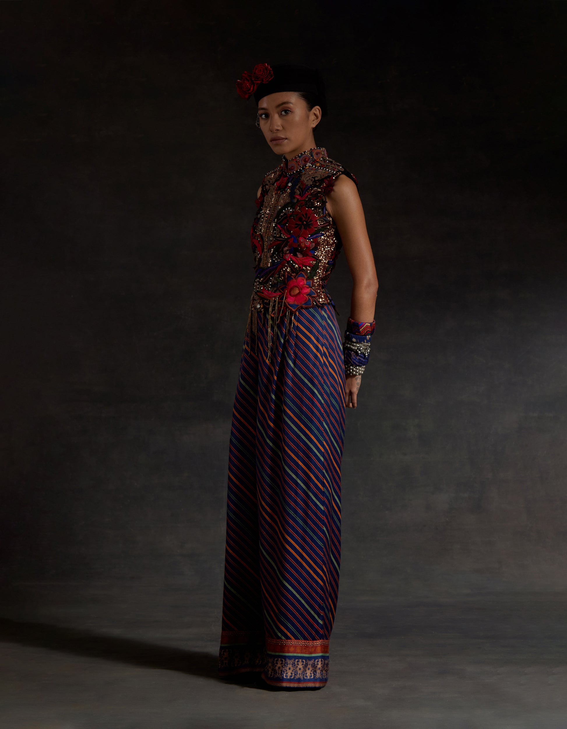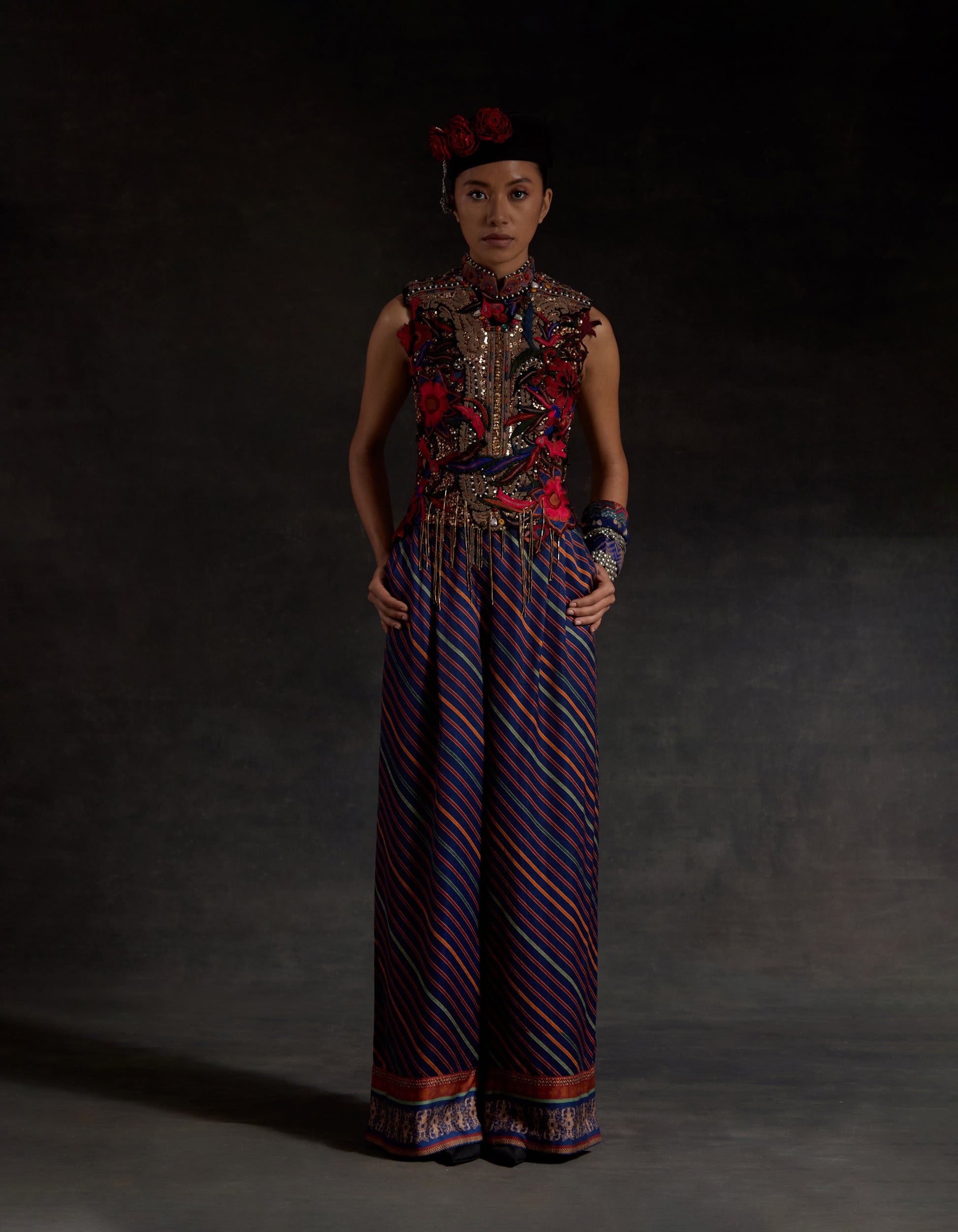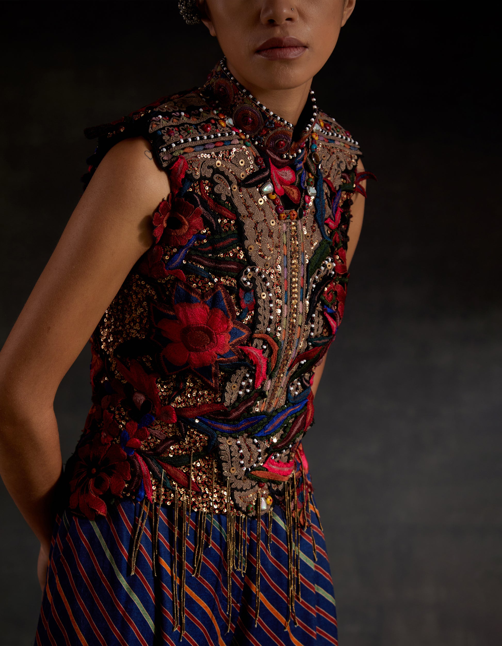 Heavily embroidered net top paired with printed embroidered culotte shorts. Applique patch work. marori work and zari embroidery with bead and tassel details.