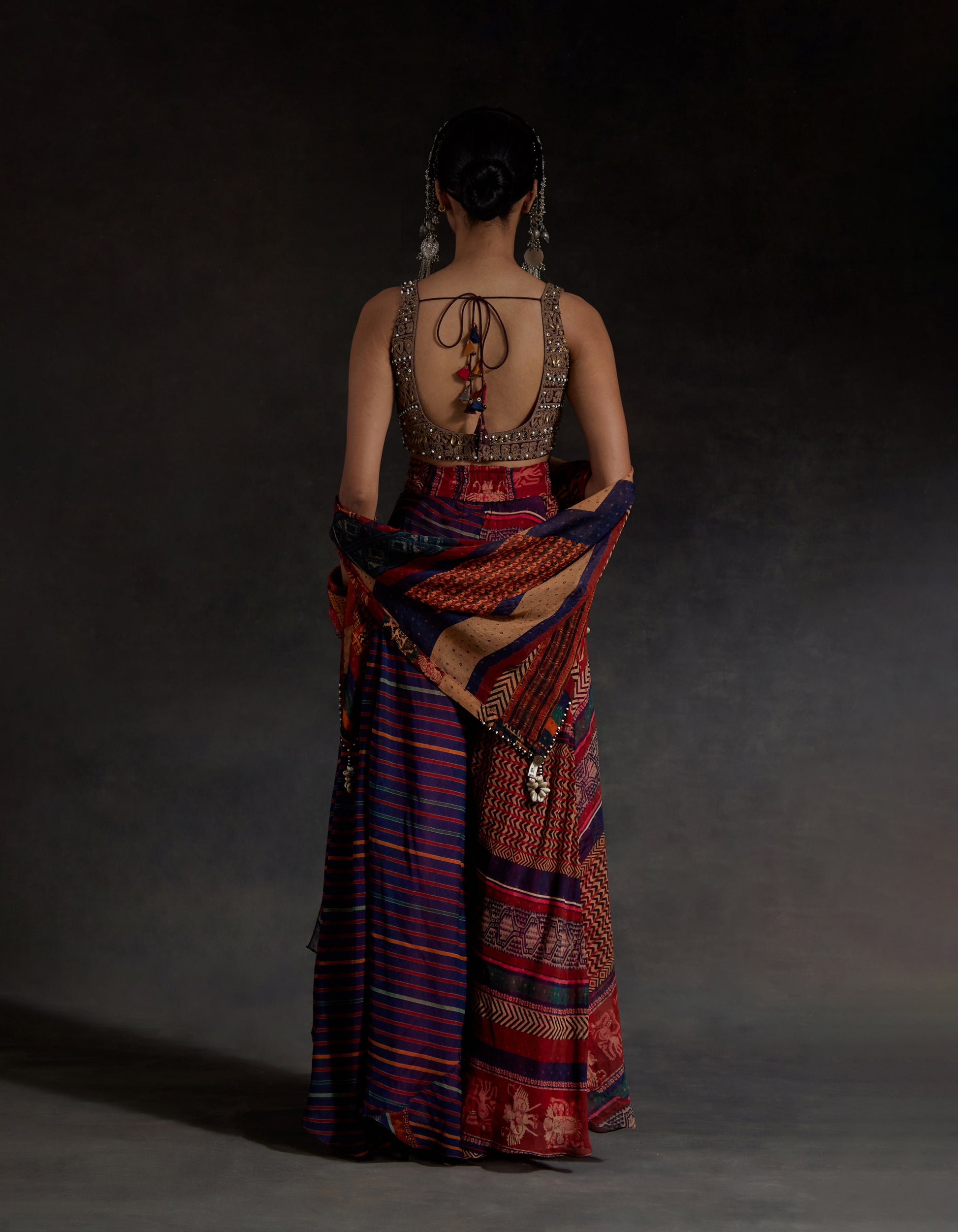 Full embroidered blouse with tassel detailing and back opening with printed skirt. Resham thread and bead work embroidery & tribal tassel detail.