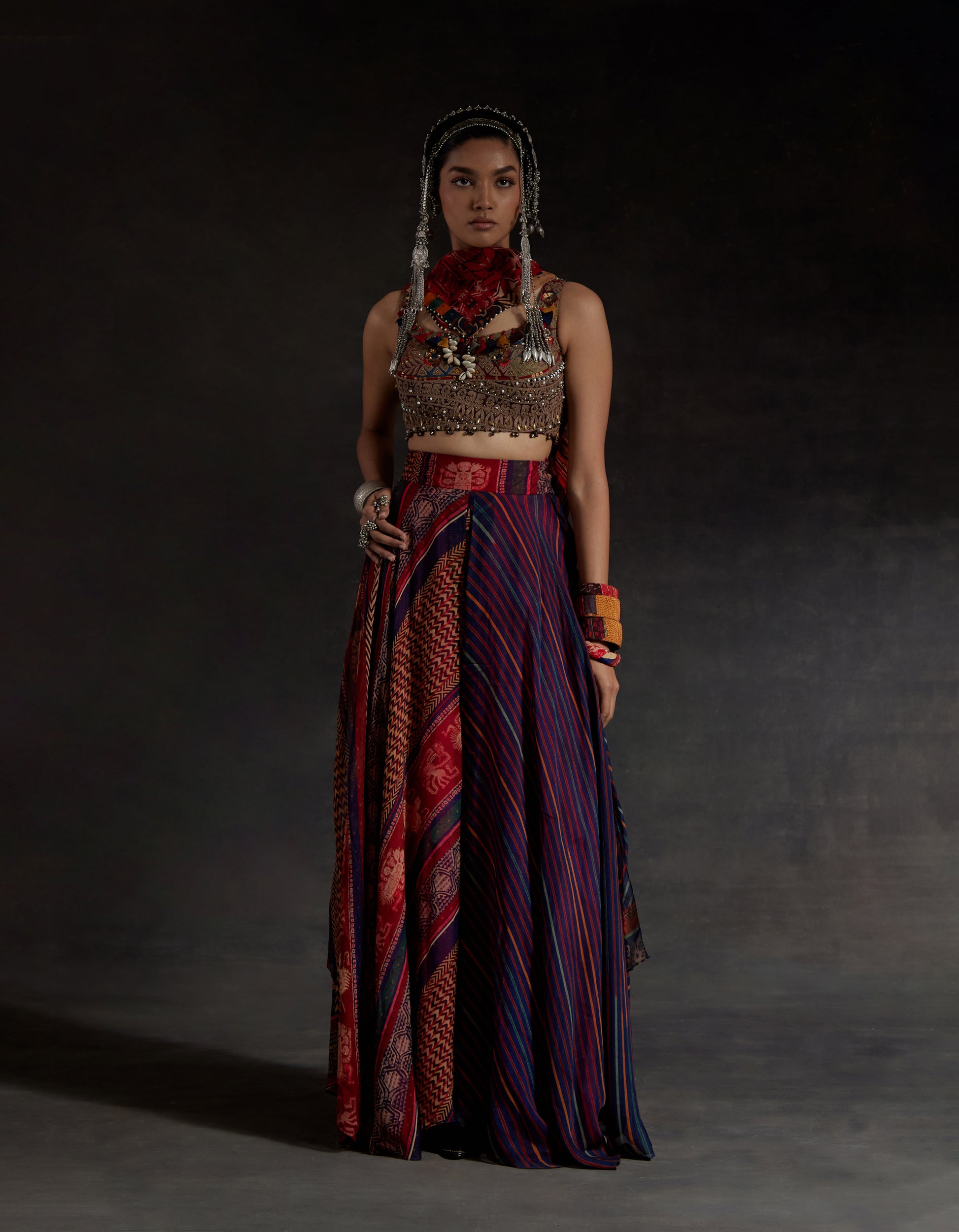 Full embroidered blouse with tassel detailing and back opening with printed skirt and scarf.