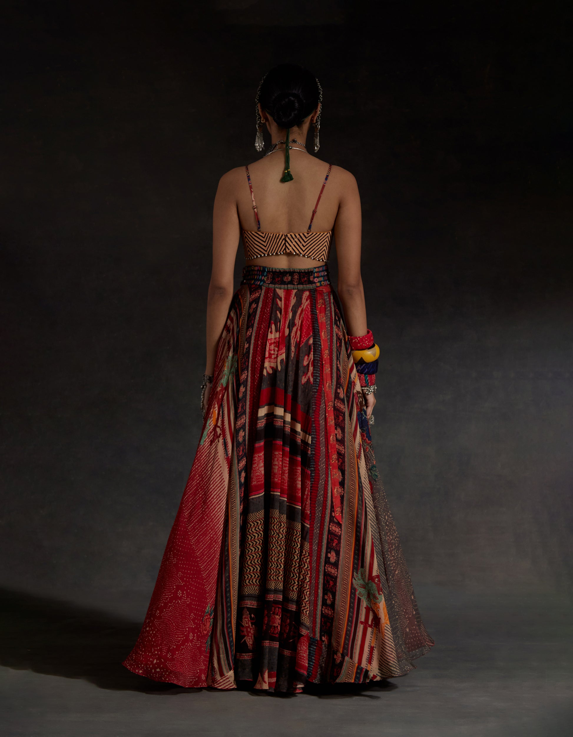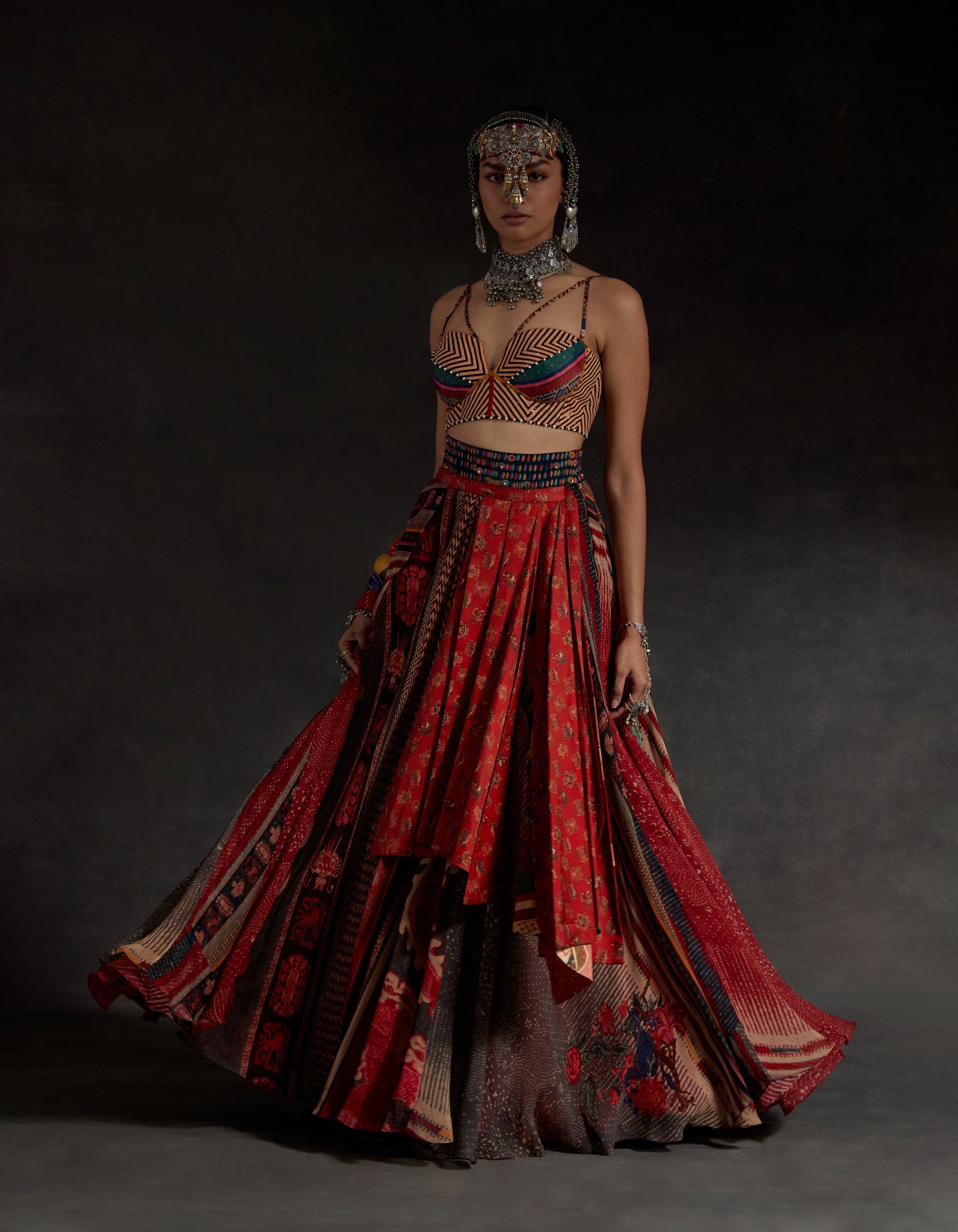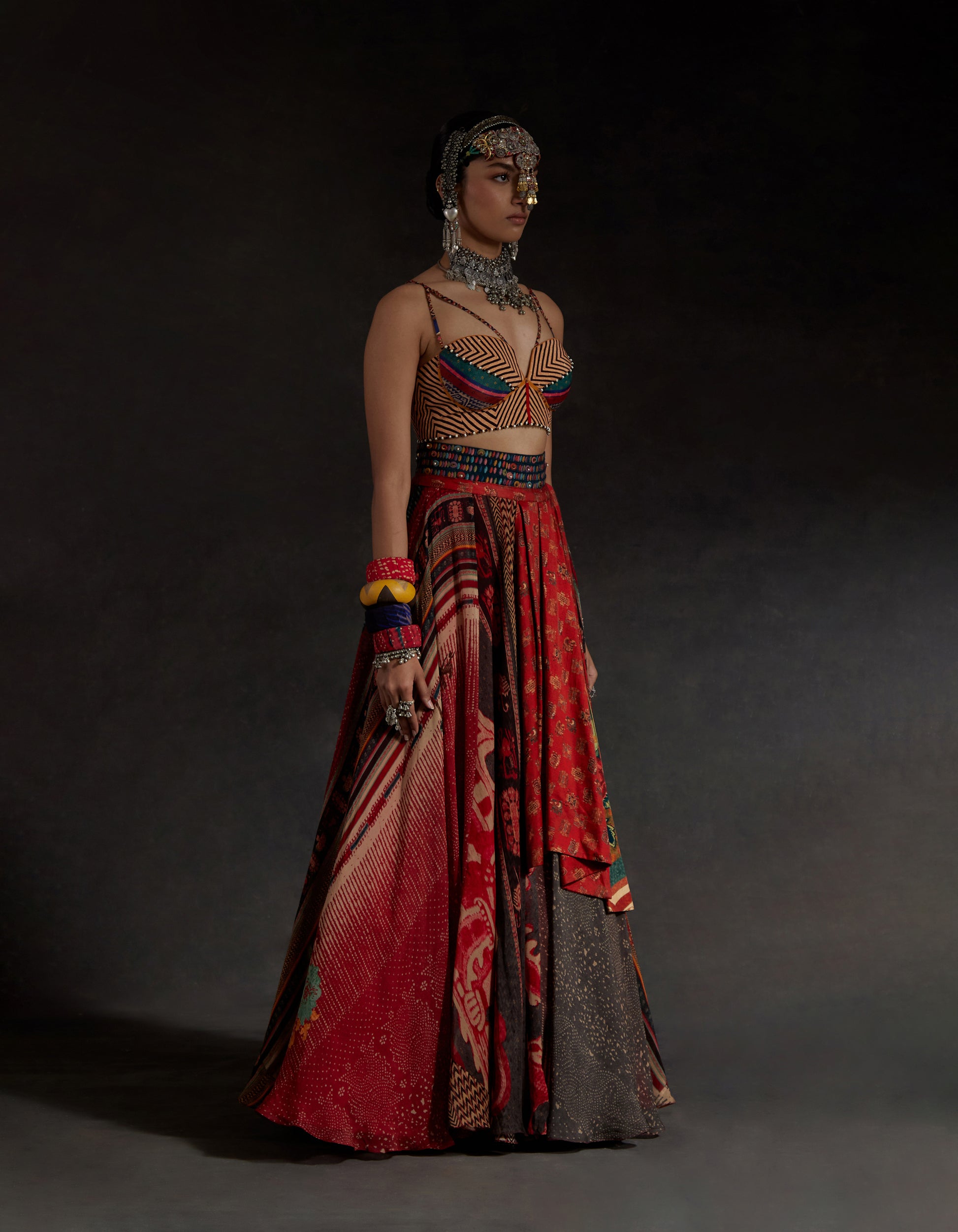 Printed blouse paired with printed layered skirt. Bead highlighting with resham thread of skirt waist belt.