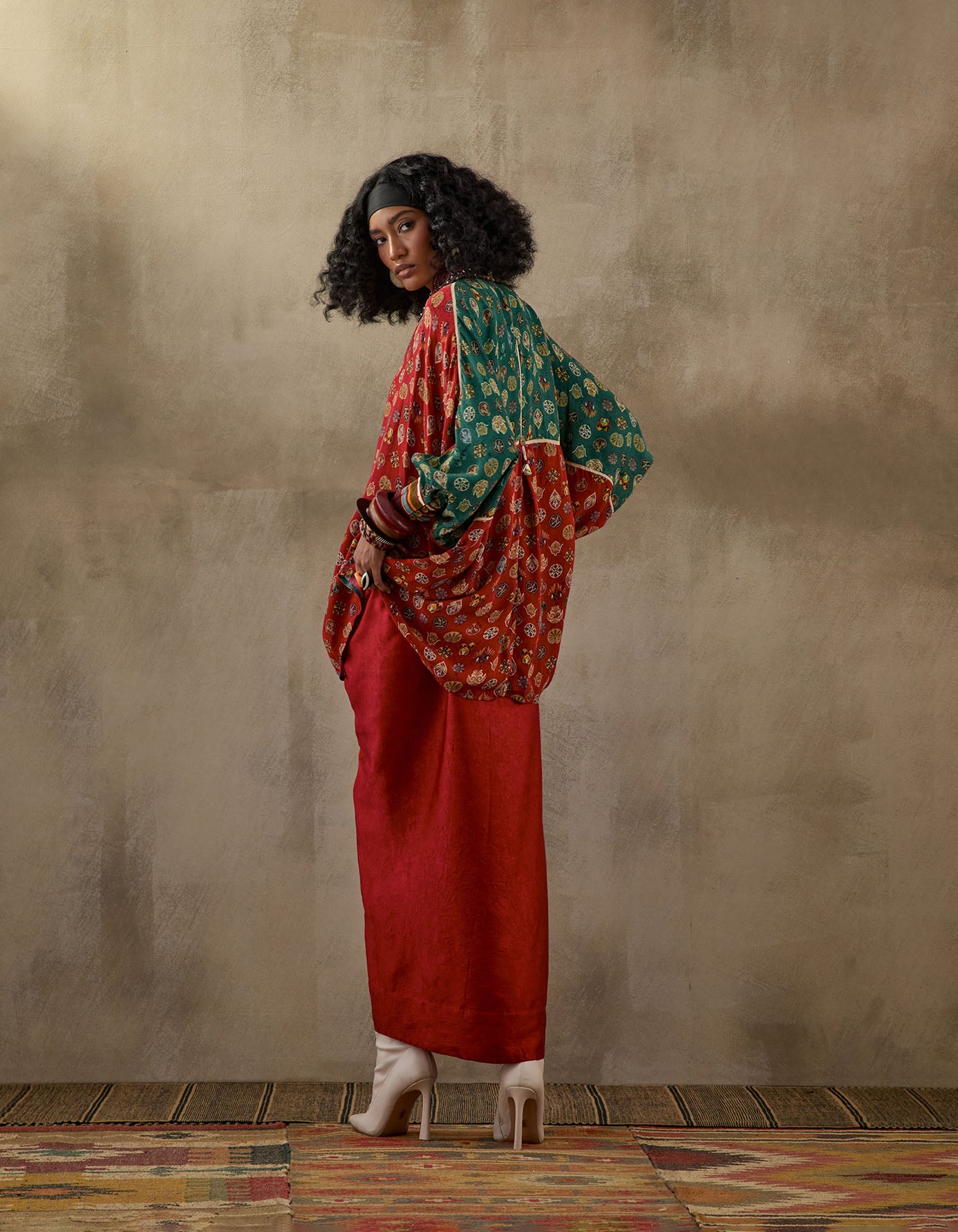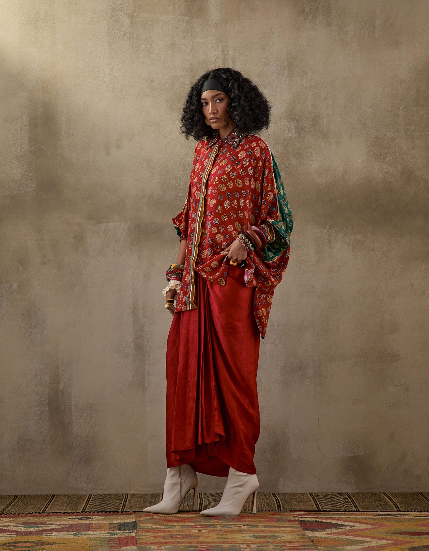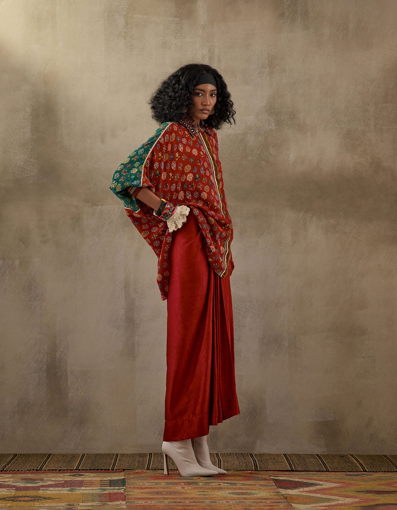 A relaxed-fit trapeze printed shirt with insert details and an embroidered collar, designed without armholes for fluid movement. Paired with a solid-colored pleated skirt featuring an elasticated waistband for a comfortable fit. Layered with a sheer silk dupatta jacket, adding an ethereal touch to the ensemble. Effortless elegance for all sizes.