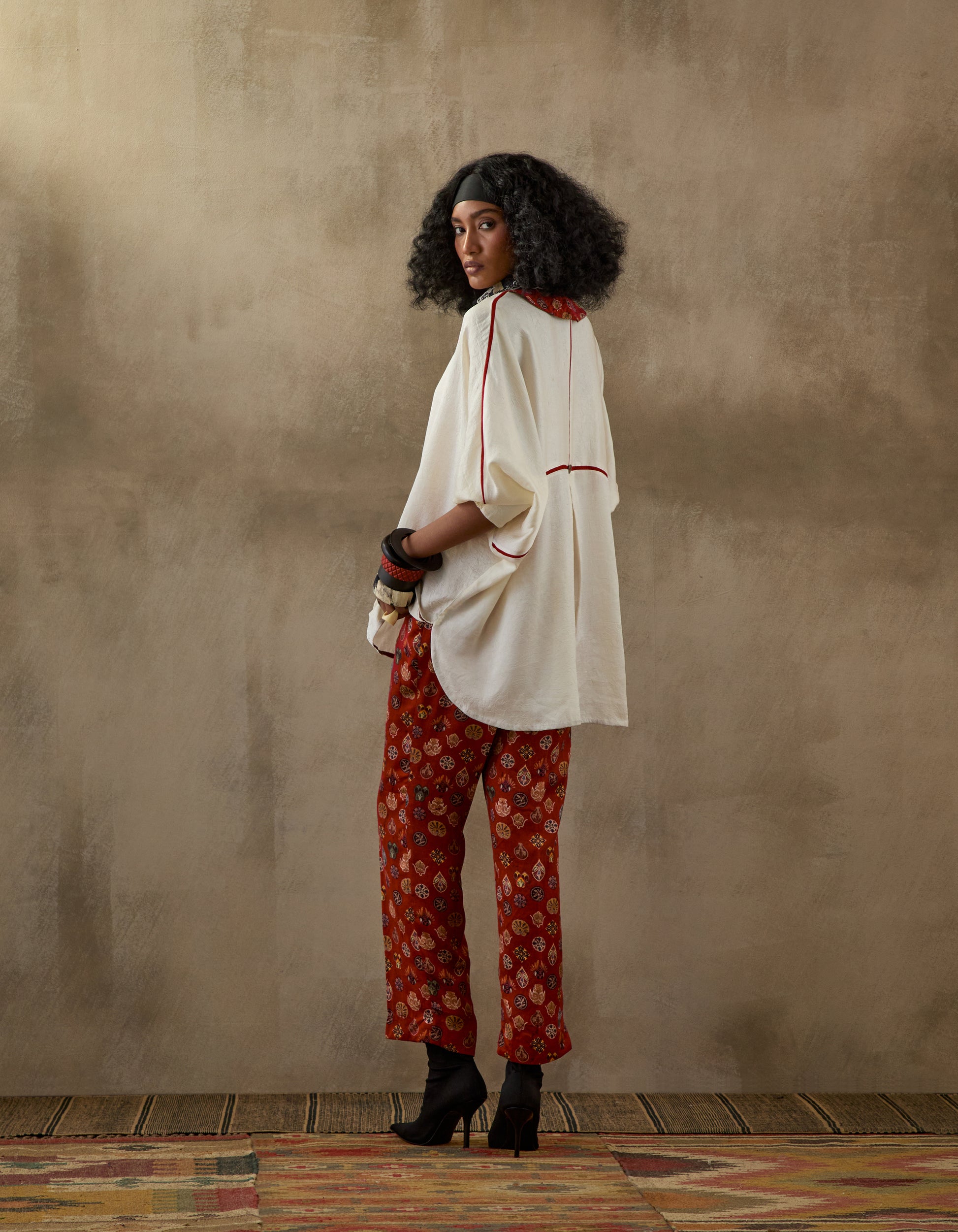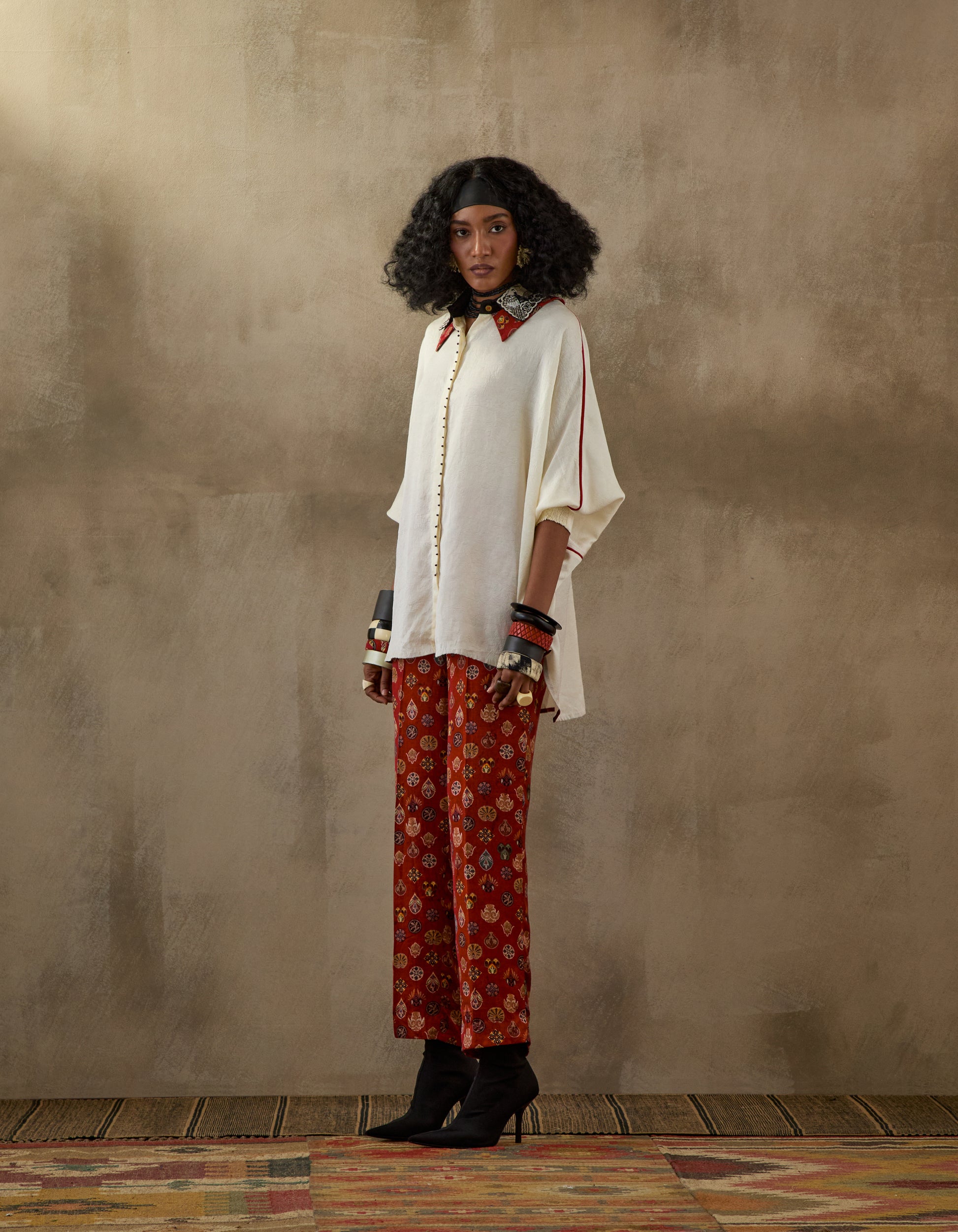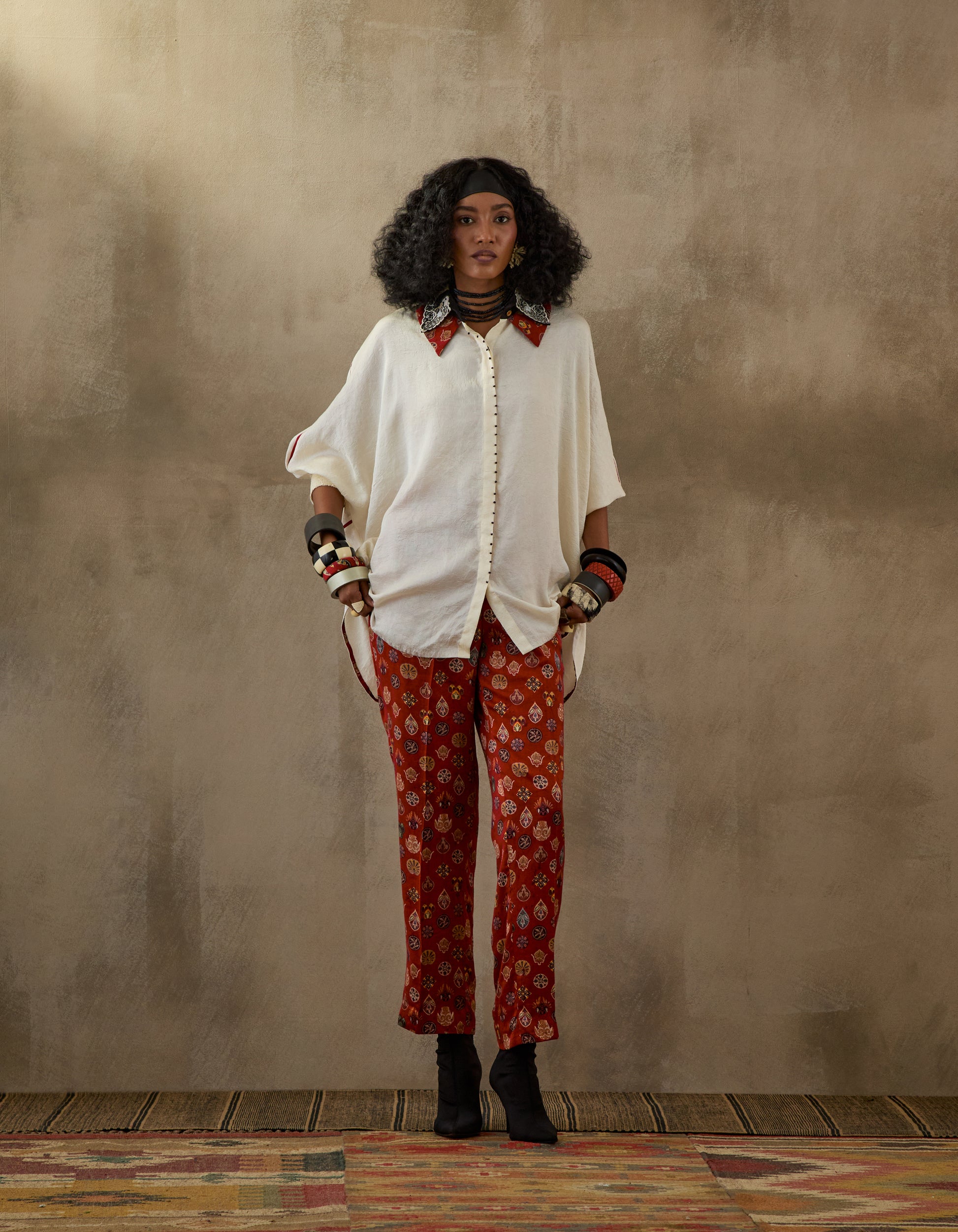 A relaxed trapeze solid-colored shirt with insert details and a lace-embroidered collar, paired with printed straight trousers featuring an elasticated waistband for ease and comfort. Designed without armholes, ensuring a fluid, effortless fit for all sizes.