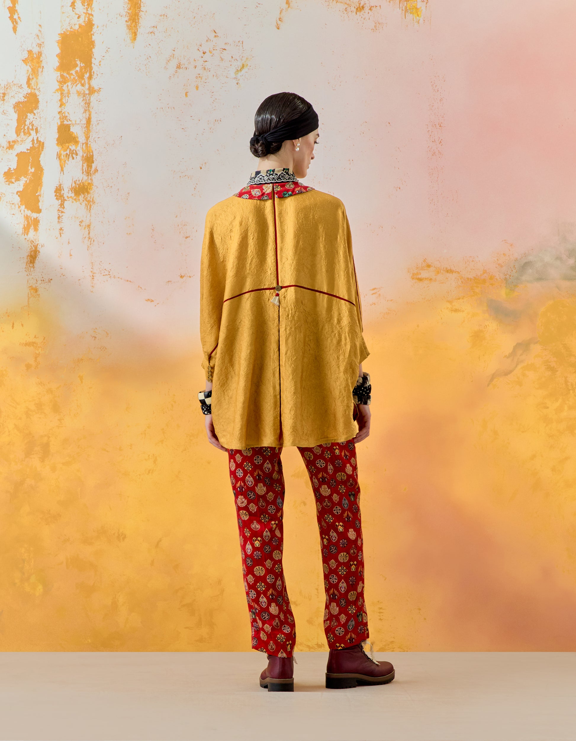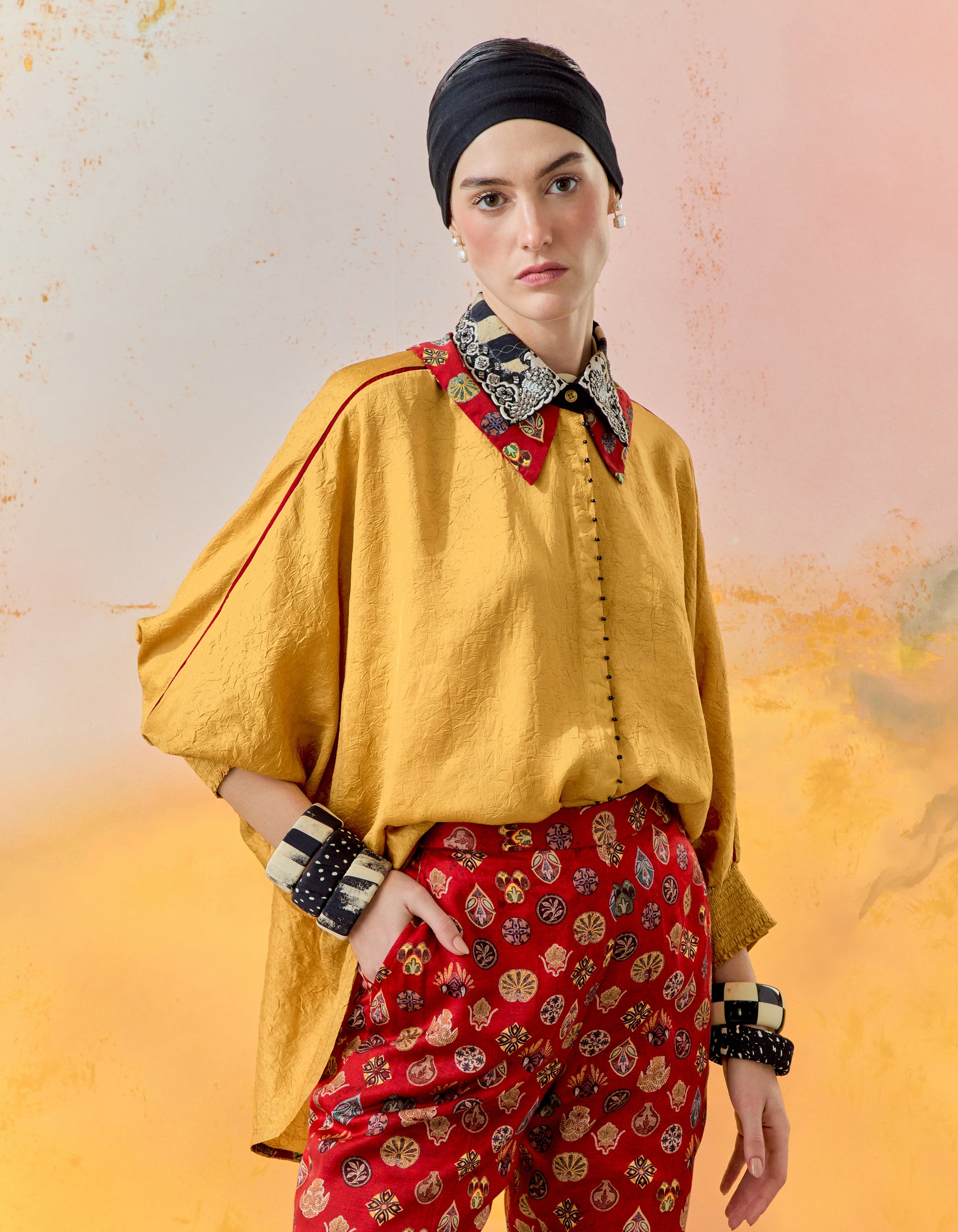 A relaxed trapeze solid-colored shirt with insert details and a lace-embroidered collar, paired with printed straight trousers featuring an elasticated waistband for ease and comfort. Designed without armholes, ensuring a fluid, effortless fit for all sizes.