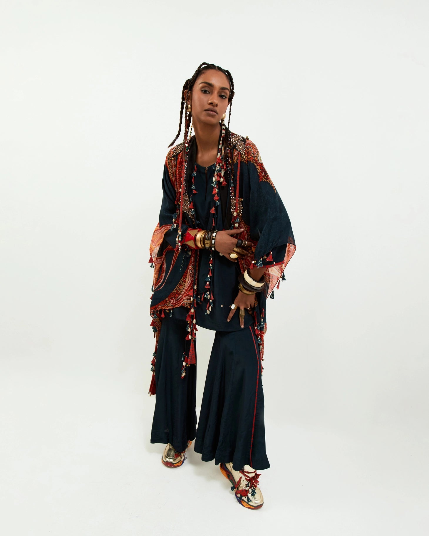 A free-size, armhole-free dupatta jacket featuring a printed design, embroidered yoke, and tribal tassel detailing. Embellished with Resham thread embroidery, cowri shells, beads, and fabric tassels, adding a unique artisanal touch.