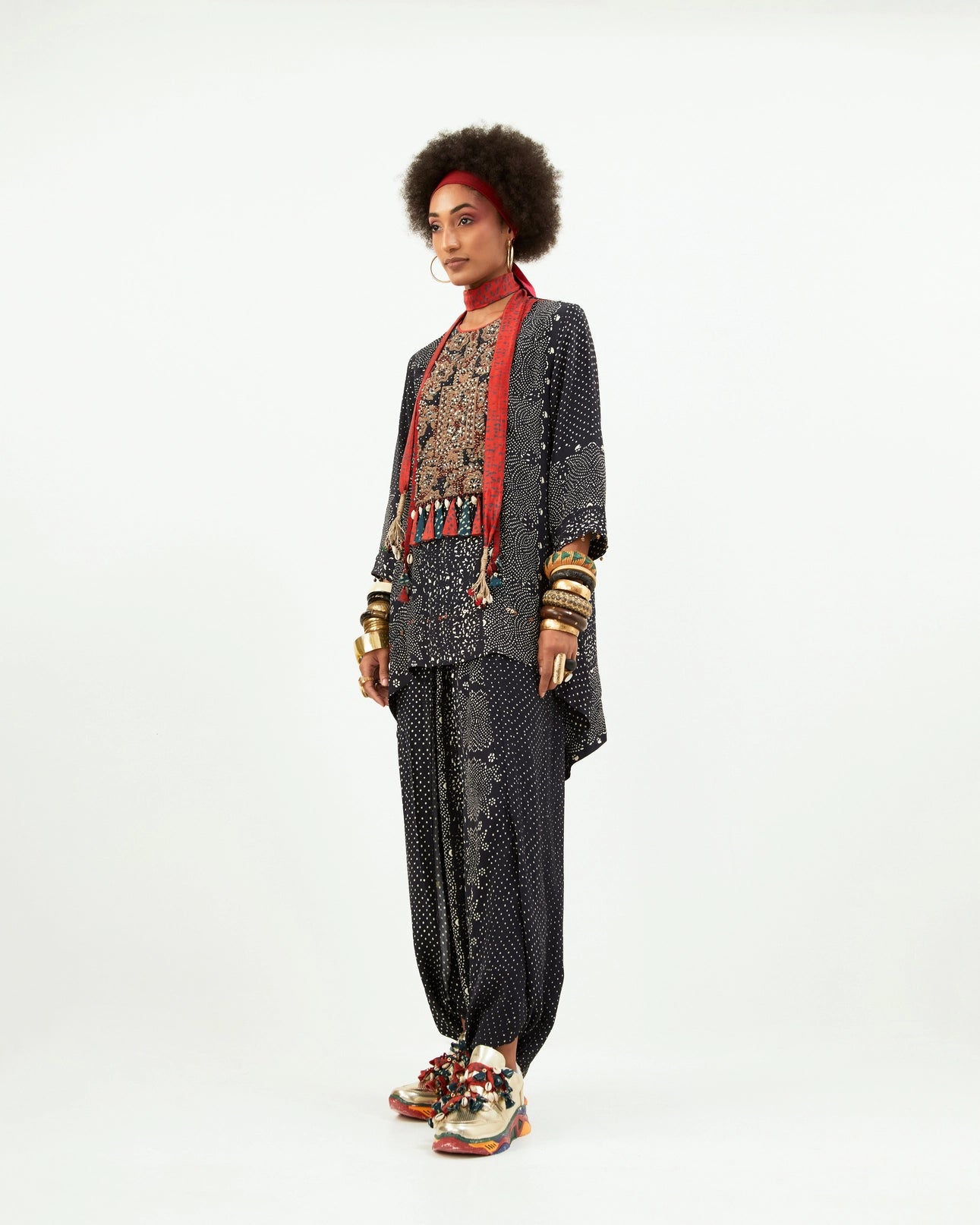 Relaxed fit short printed kurti with printed inserts, paired with draped trousers. Embellished with resham thread embroidery, cowri shells, M.O.P. bead, and tassel details. Easy-fit kurta with elasticated waist trousers for a comfortable, effortless look.