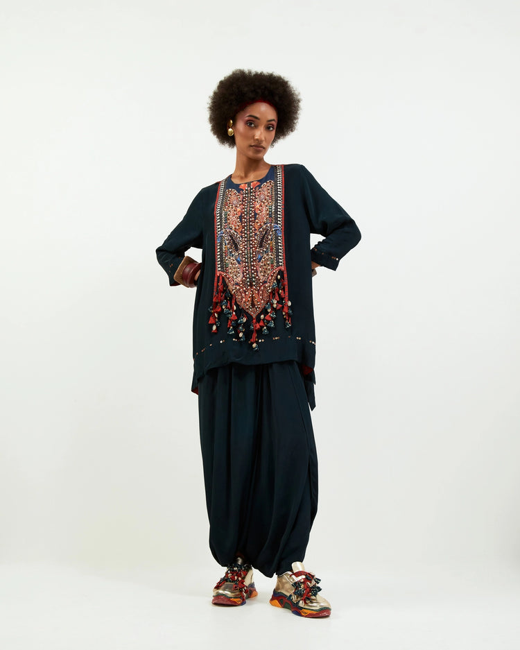 Relaxed fit short solid kurti with printed inserts, paired with draped trousers. Adorned with Resham thread embroidery, cowri shells, M.O.P. bead, and tassel details. Easy-fit kurta with elasticated waist draped trousers for effortless elegance.