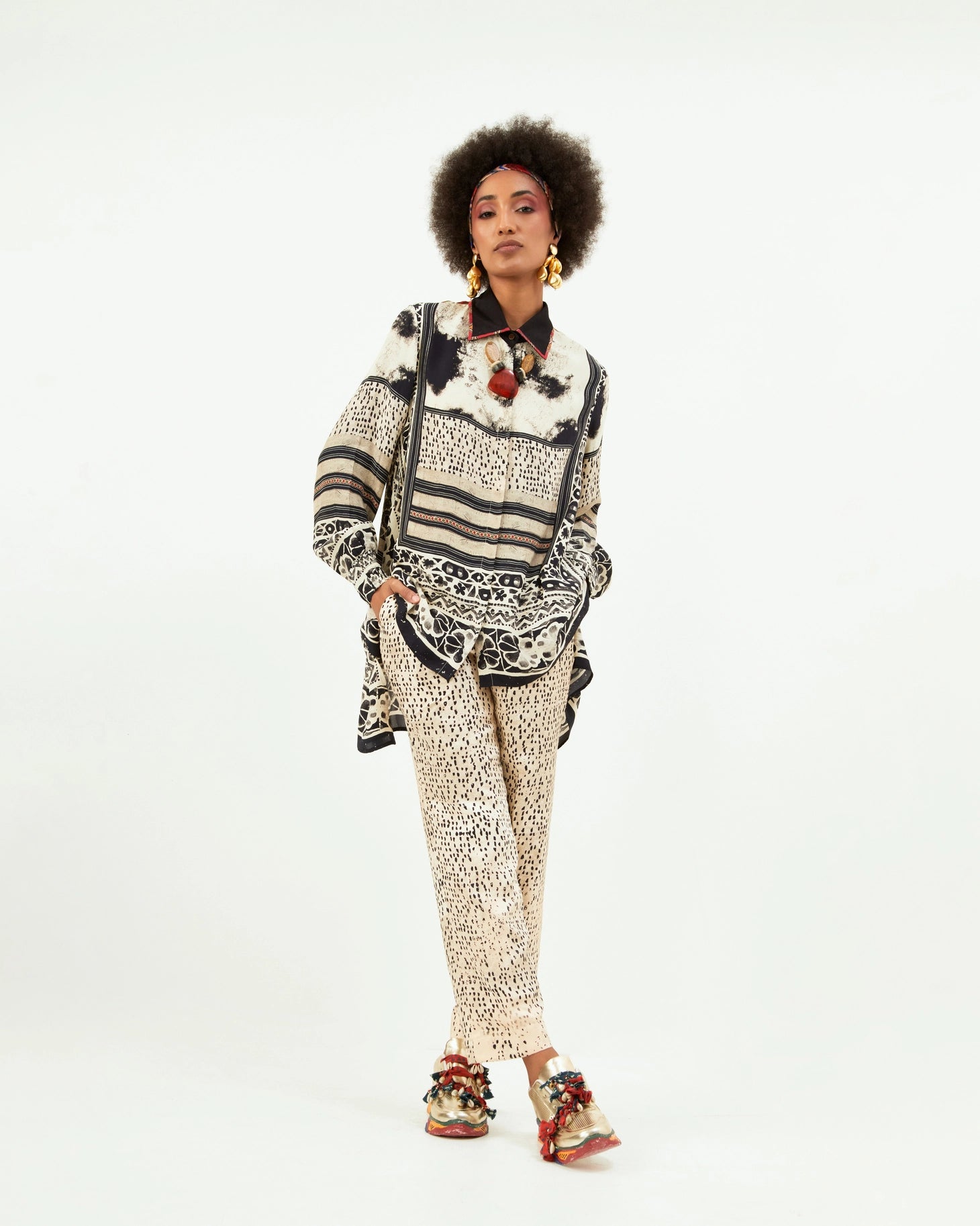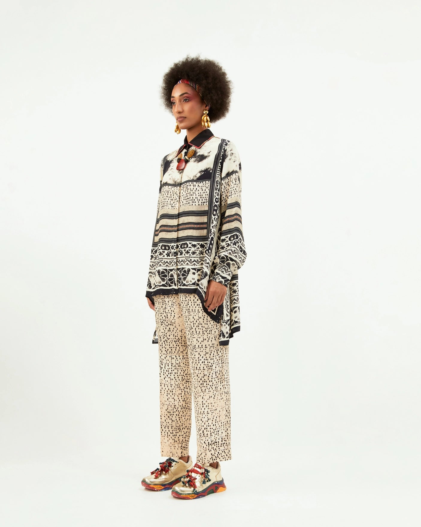 A textured print straight shirt with an embroidered collar and raglan sleeves, enhanced with Resham thread, beadwork, and M.O.P detailing. Paired with printed straight trousers featuring an elasticated waist for an easy fit and effortless style.