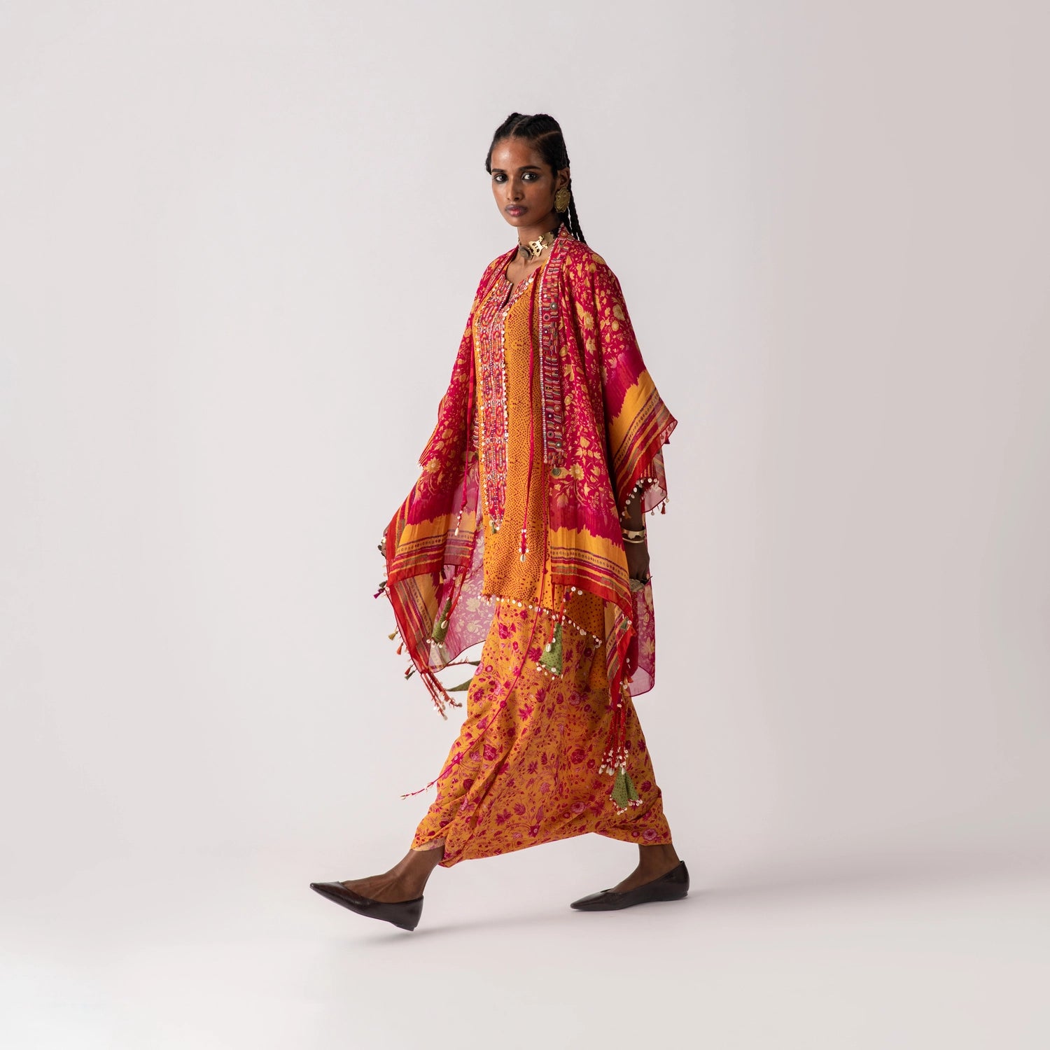 A free-sized dupatta jacket in sheer silk, featuring a floral print with an embroidered neckline. Adorned with M.O.P. accents, tassel latkan details on the hem, and resham thread embroidery, this armhole-free silhouette adds effortless elegance to any look.
