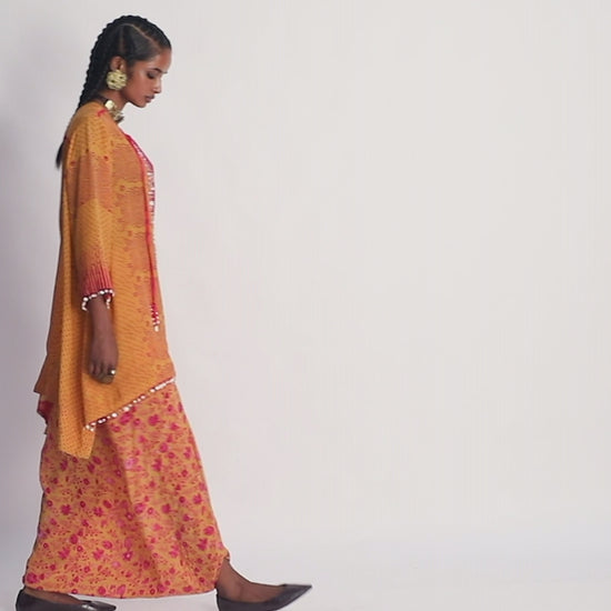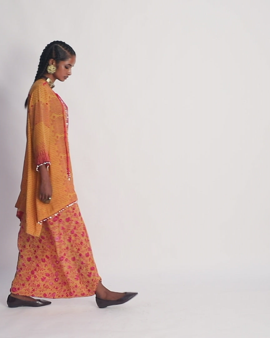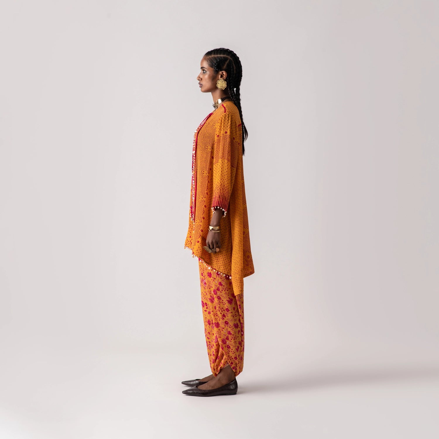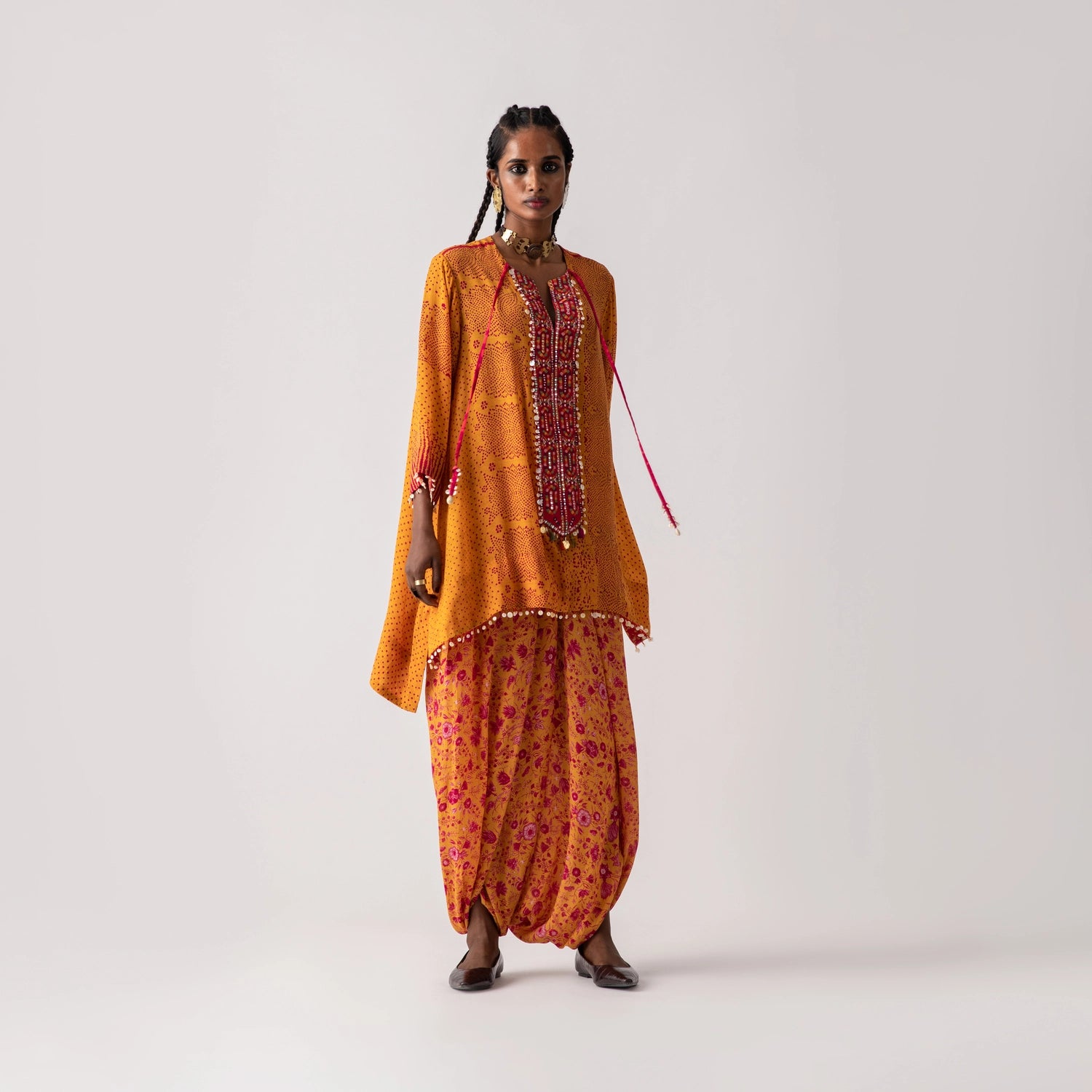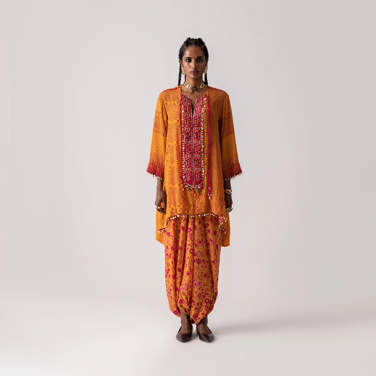 A texture printed short kurta with an embroidered yoke and tribal detailing on the neck, paired with texture print drape trousers. Enhanced with Resham thread embroidery, M.O.P., and tassel details, this set offers an easy-fit kurta and elasticated waist trouser for effortless style and comfort.
