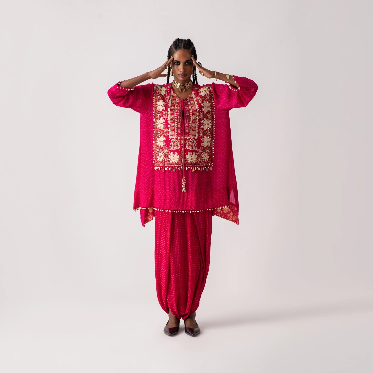 A texture printed short kurta with an embroidered yoke and tribal detailing on the neck, paired with texture print drape trousers. Enhanced with Resham thread embroidery, M.O.P., and tassel details, this set offers an easy-fit kurta and elasticated waist trouser for effortless style and comfort.