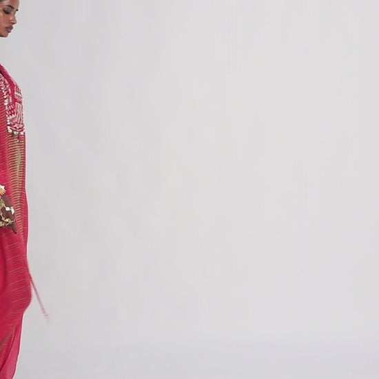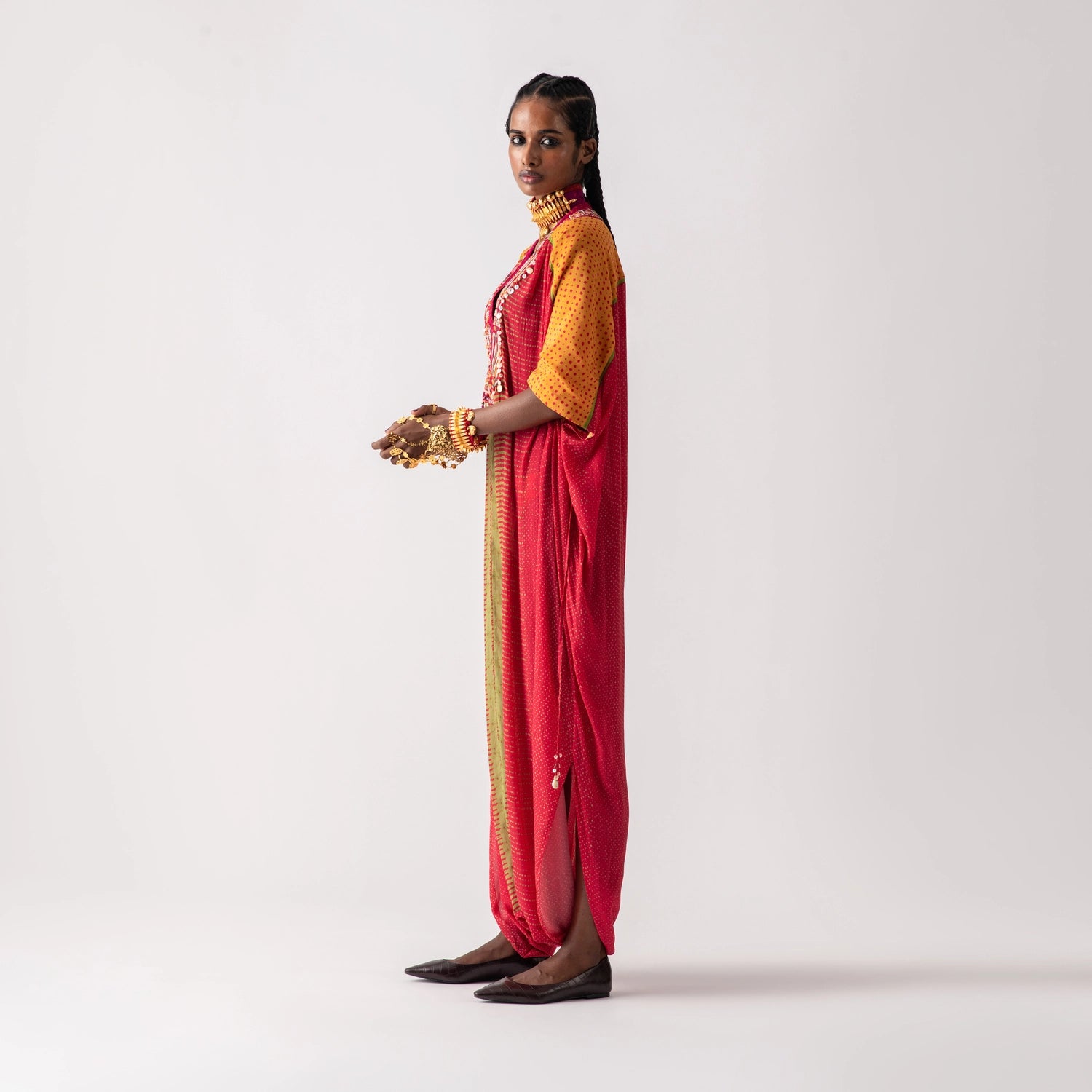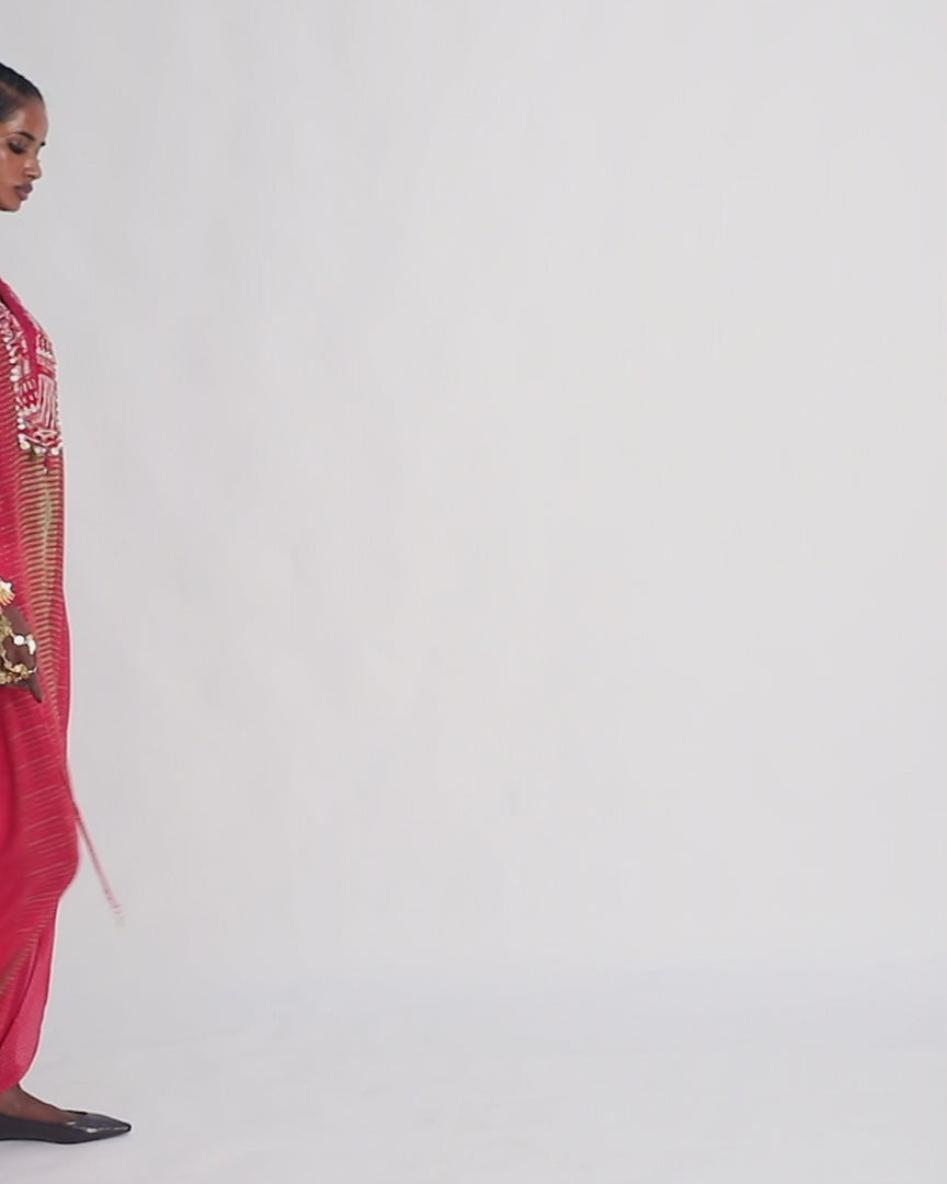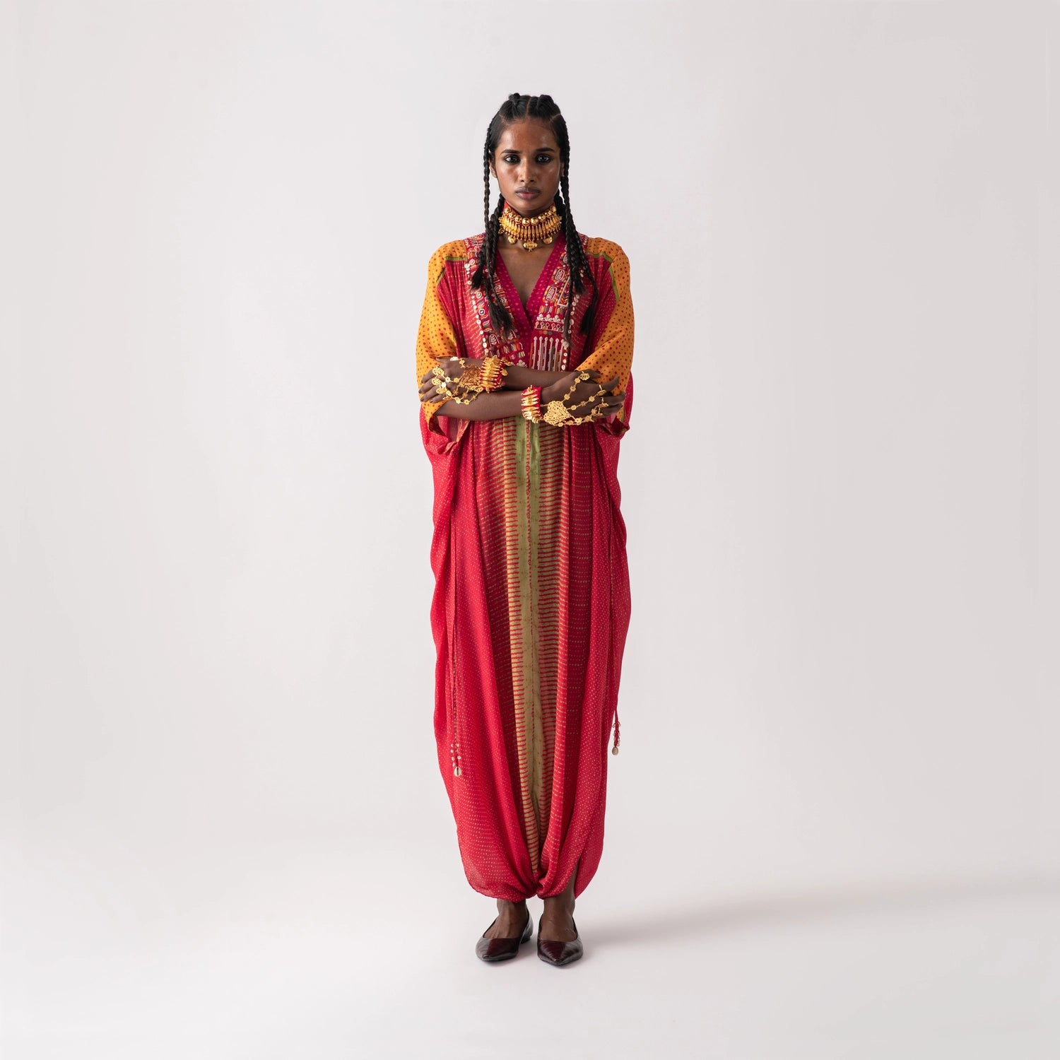 Texture print jumpsuit kaftan with embroidered neck with m.o.p and tassel detail and insert seams in fern green colour with back opening metal zipper & AK brand Button.