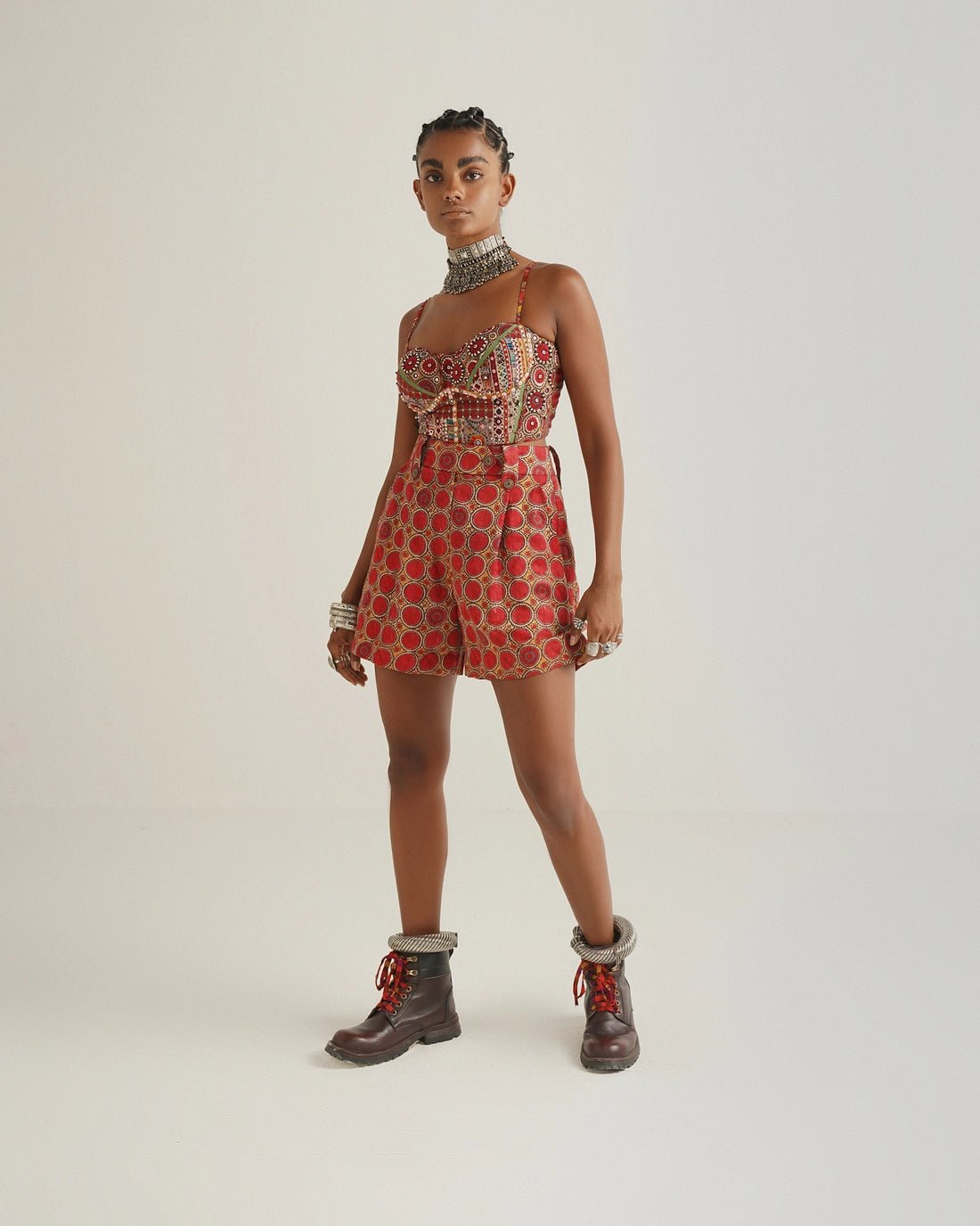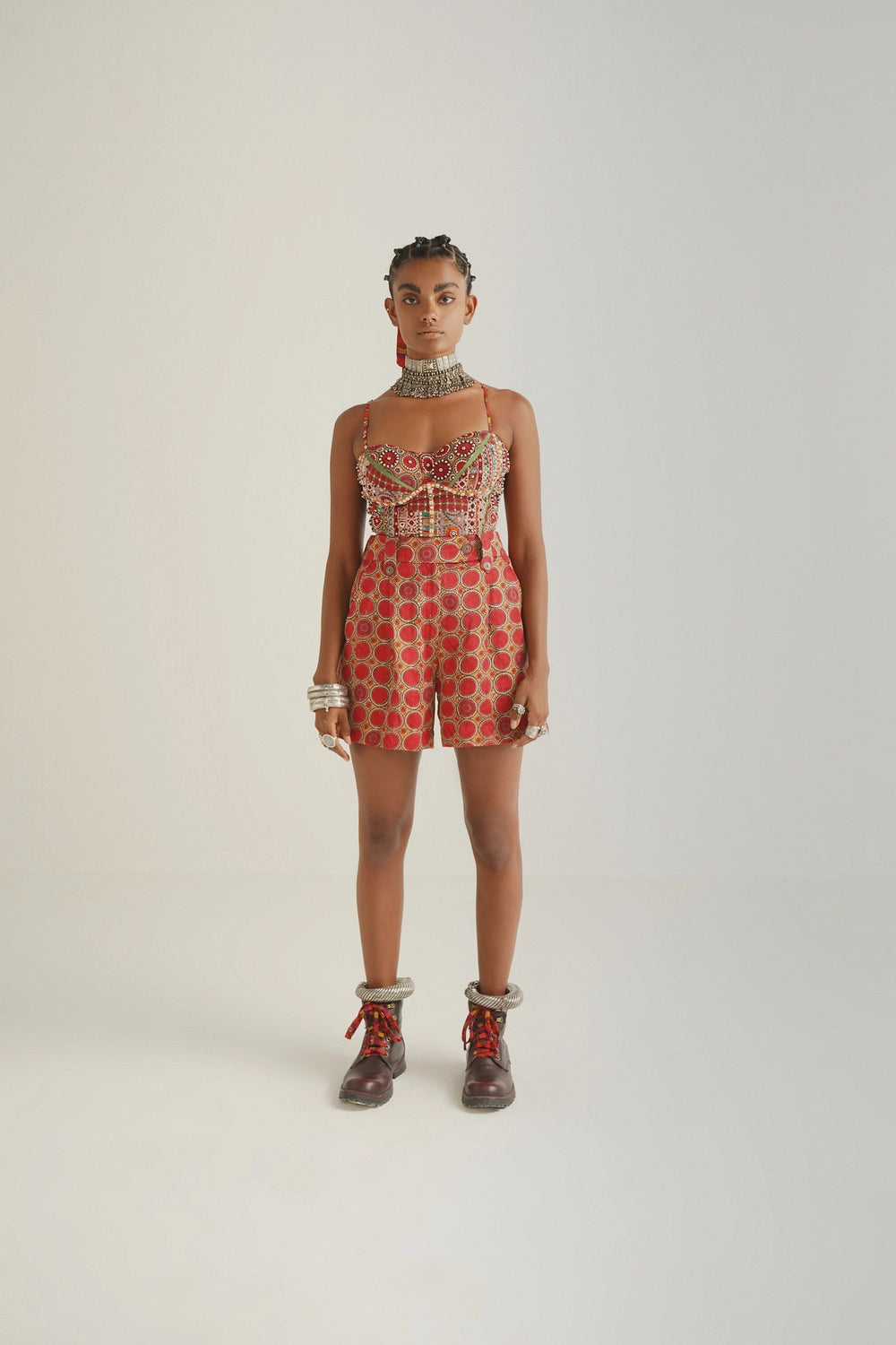 Printed corset blouse with resham thread mirror work embroidery, cowri shells, and M.O.P. bead details. A structured, body-fitted silhouette with intricate handcrafted embellishments.