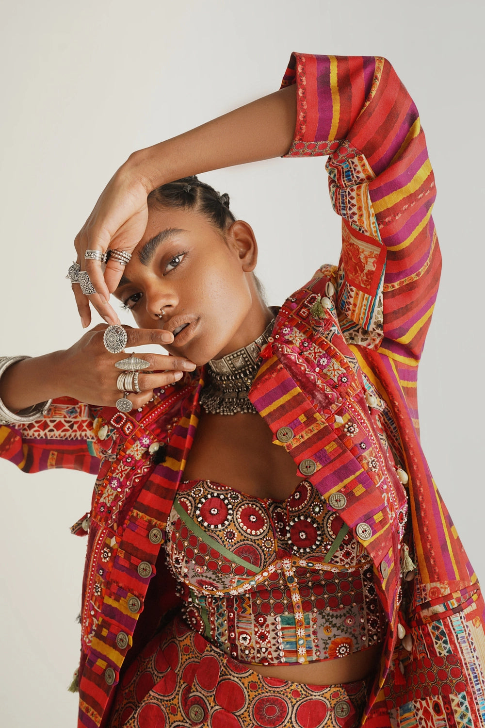 Printed corset blouse with embroidery highlights, paired with printed shorts and a collage print open jacket. Detailed with resham thread mirror work, cowri shells, M.O.P. beads, and tassels. Body-fitted blouse with elasticated waistband shorts and a structured open jacket.