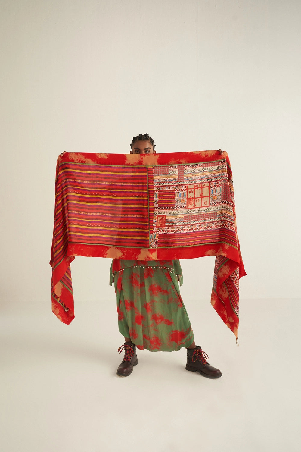 Collage print dupatta with tassel-edged detailing, adorned with cowri shells and bead accents.