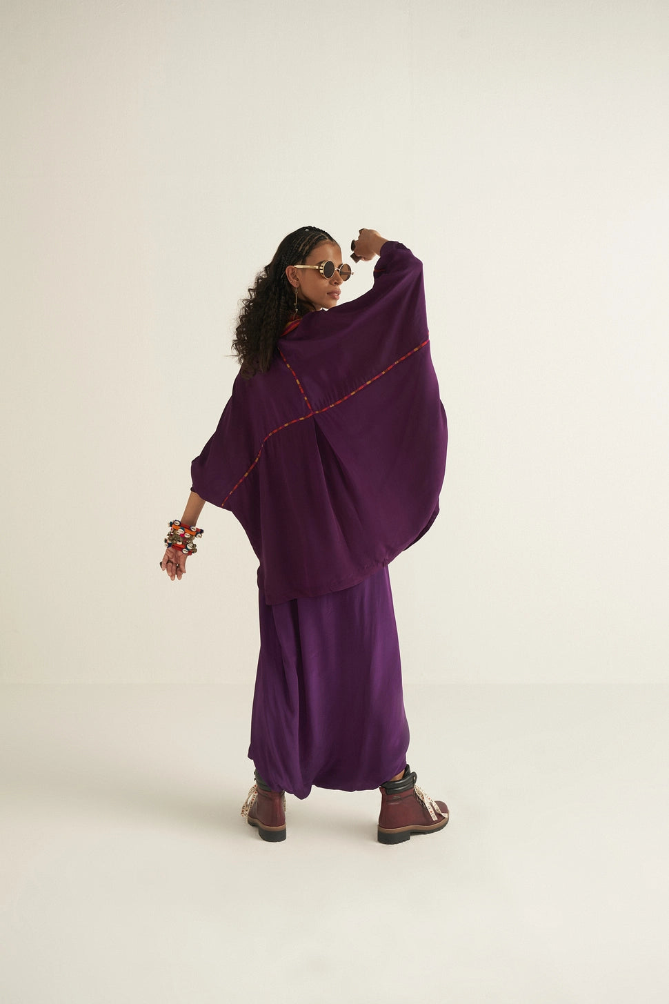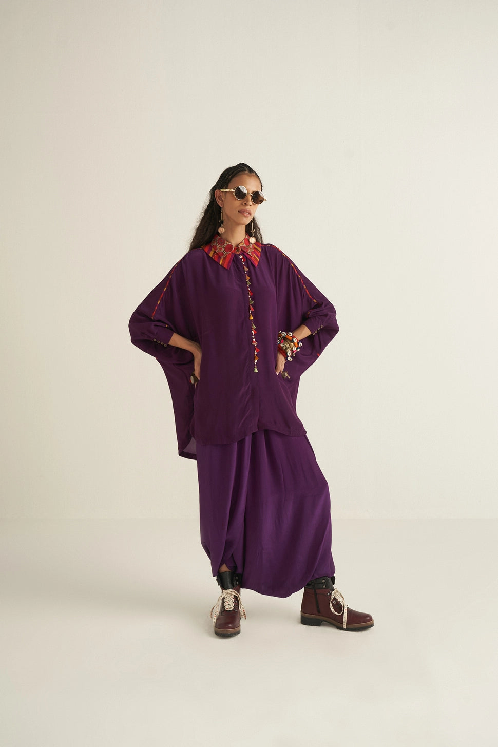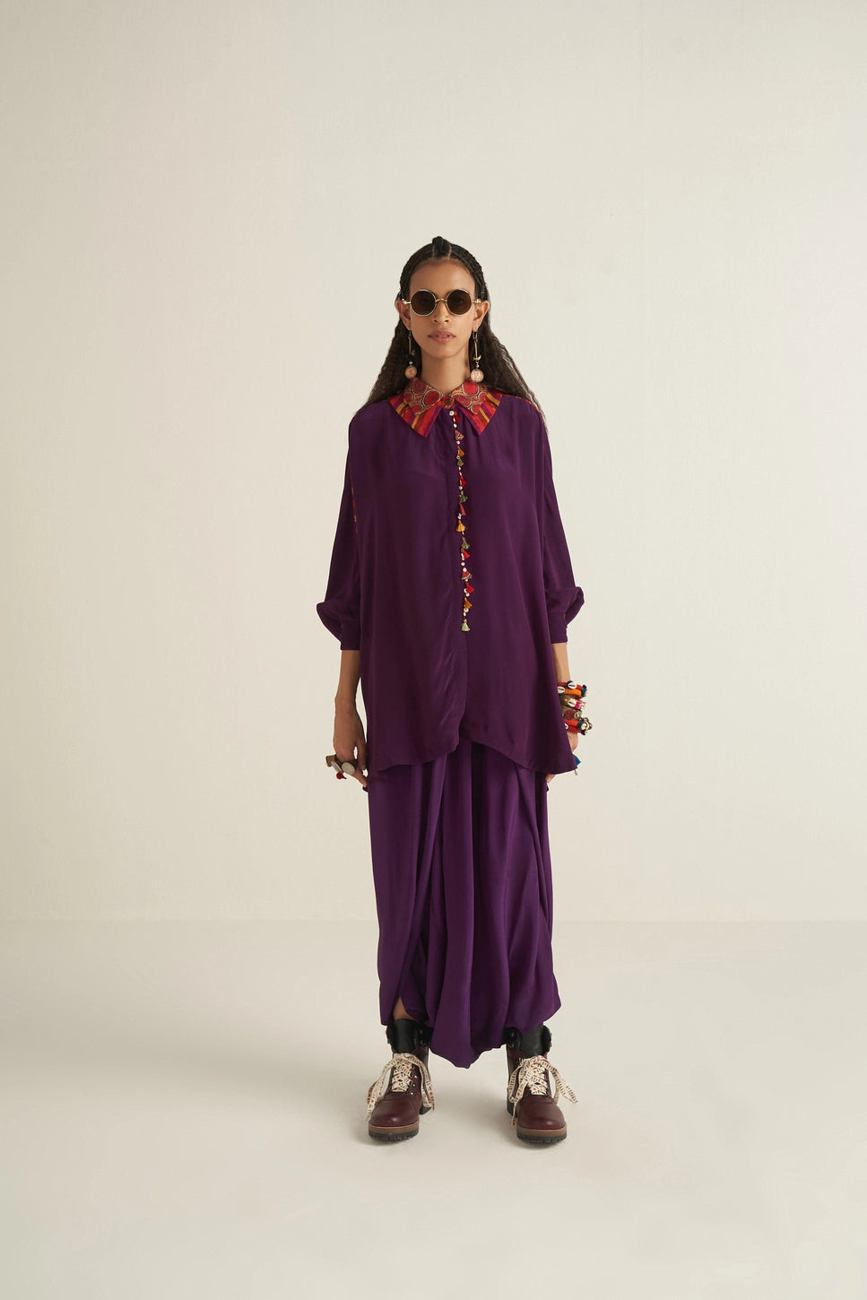 Solid-colored trapeze shirt with printed inserts and a double collar, adorned with M.O.P. bead and tassel details. No armholes for a fluid silhouette. Paired with easy-fit, elasticated waist drape trouser.